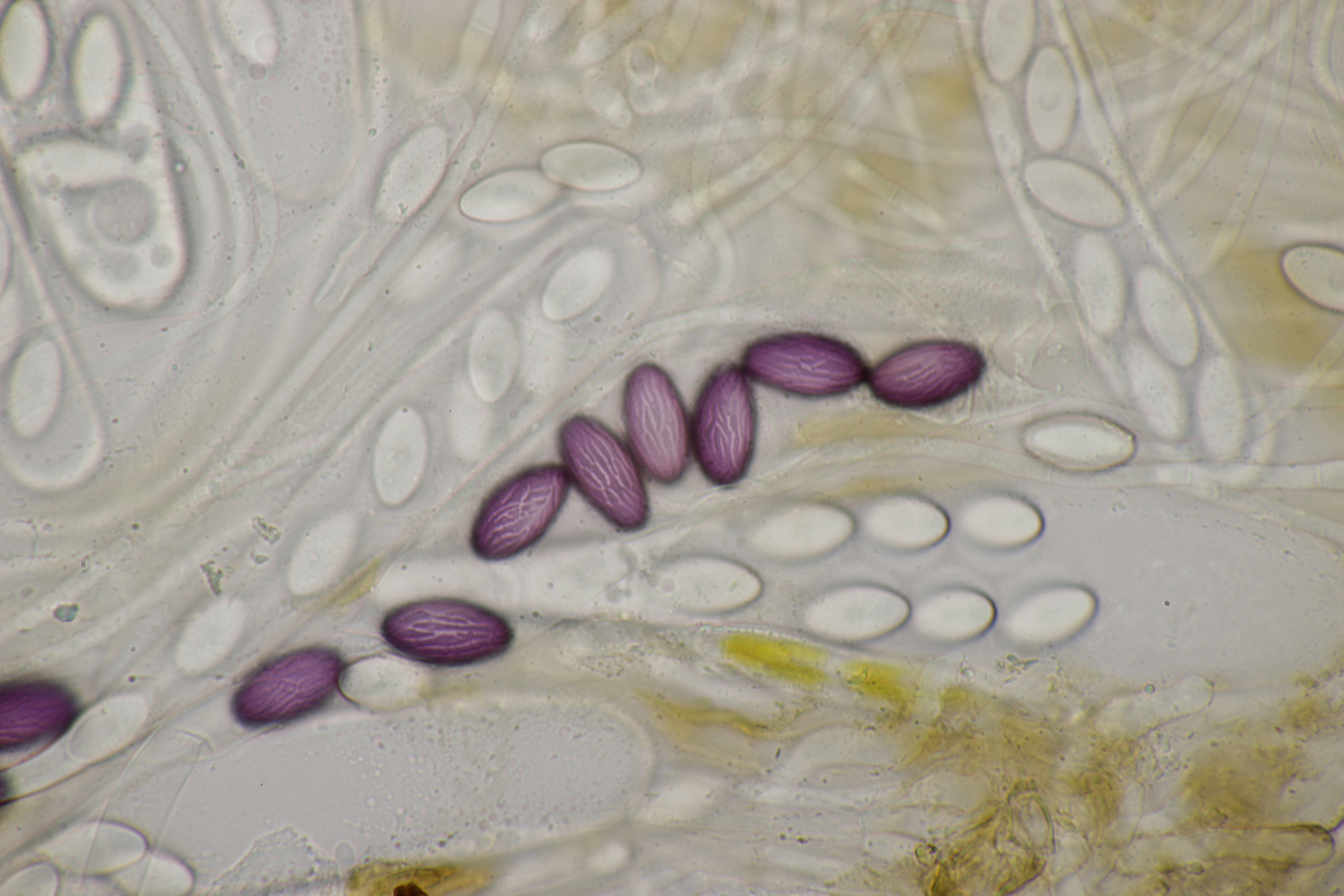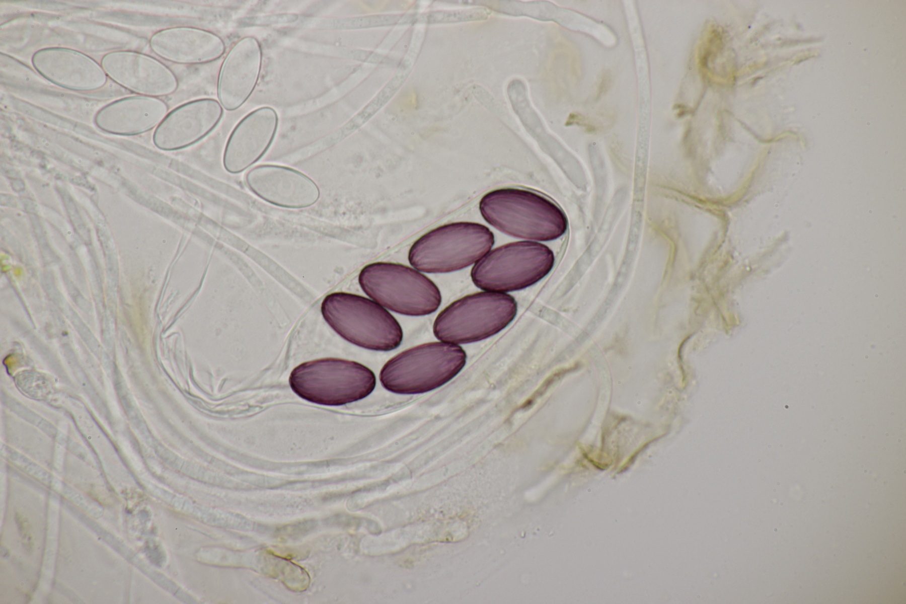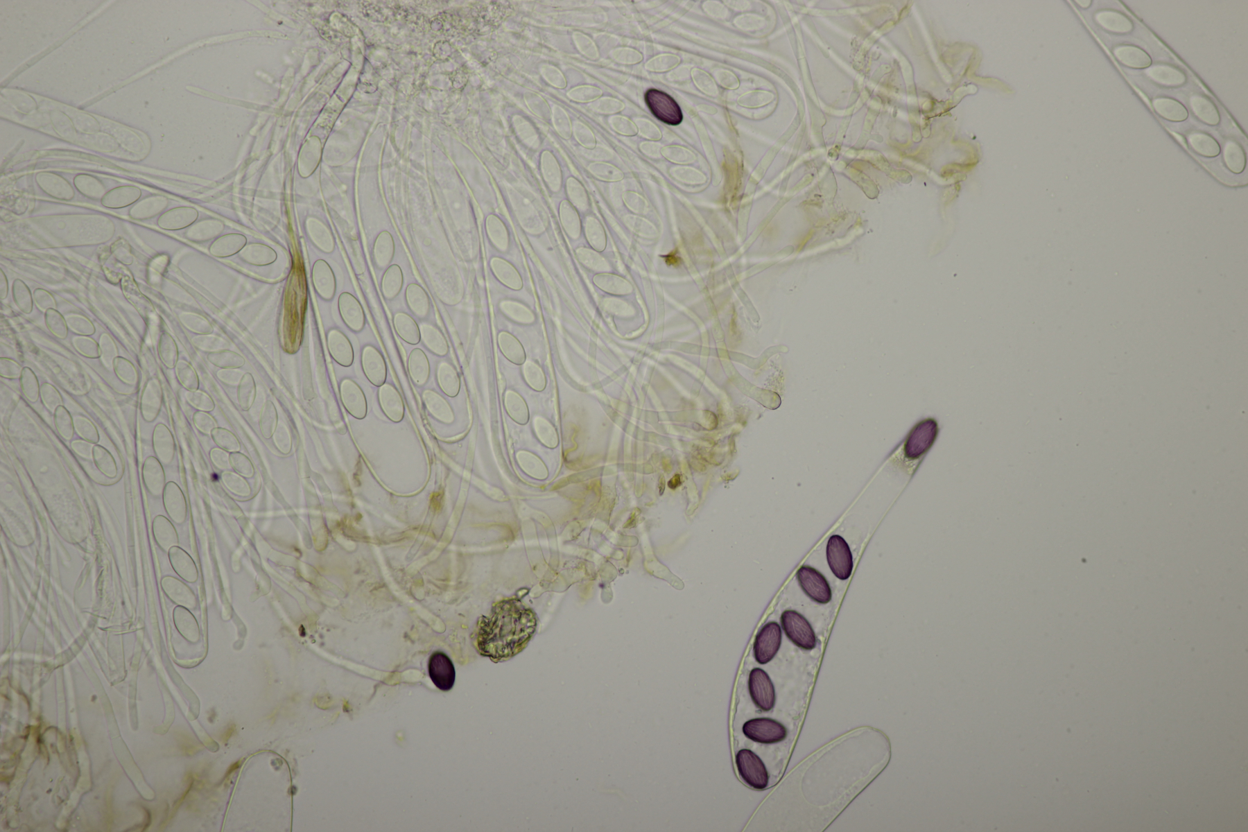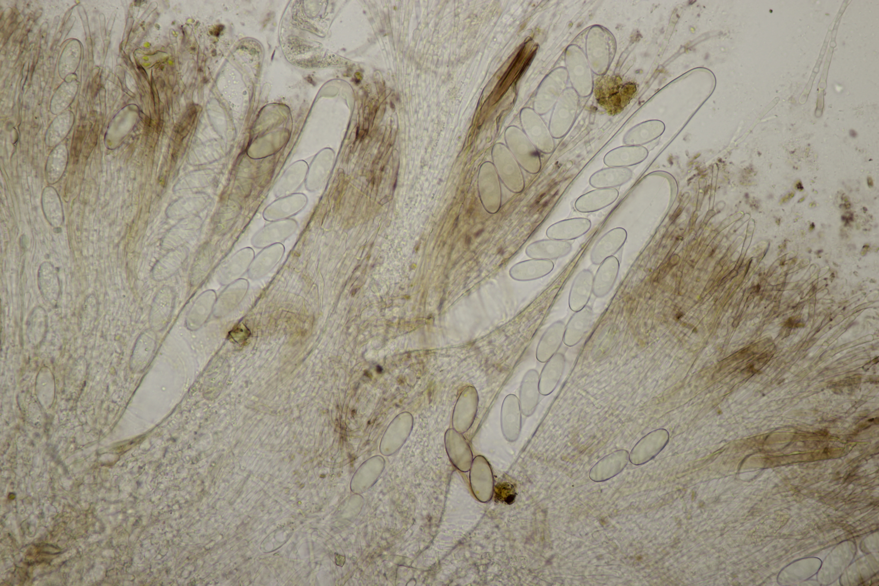 Recht dunkle Ascobolusse auf Kaninchendung. Sporen messen (18.1-22.5) µm x (10.5-12.4) µm und haben parallele Riefen. Dann setze ich bei van Brummelen mit der Sect. Ascobolus an und schlüssele über 1* -> 4 -> 5* -> 8* -> 11* -> 12* zu Ascobolus albidus. Geht ihr da mit?