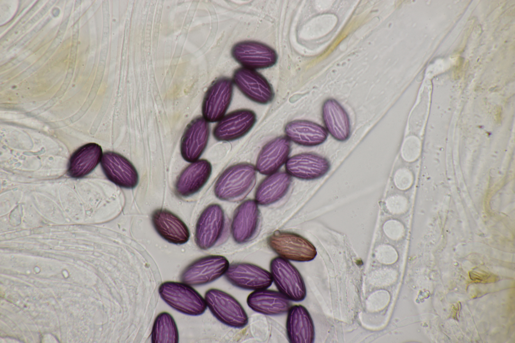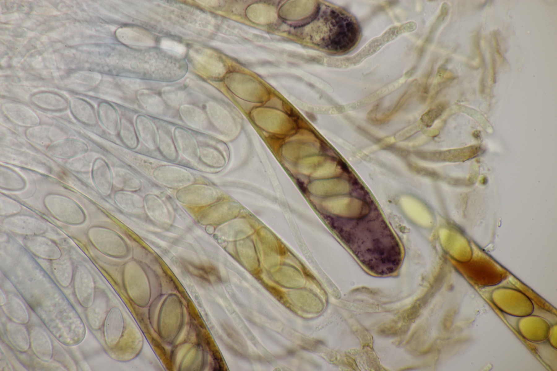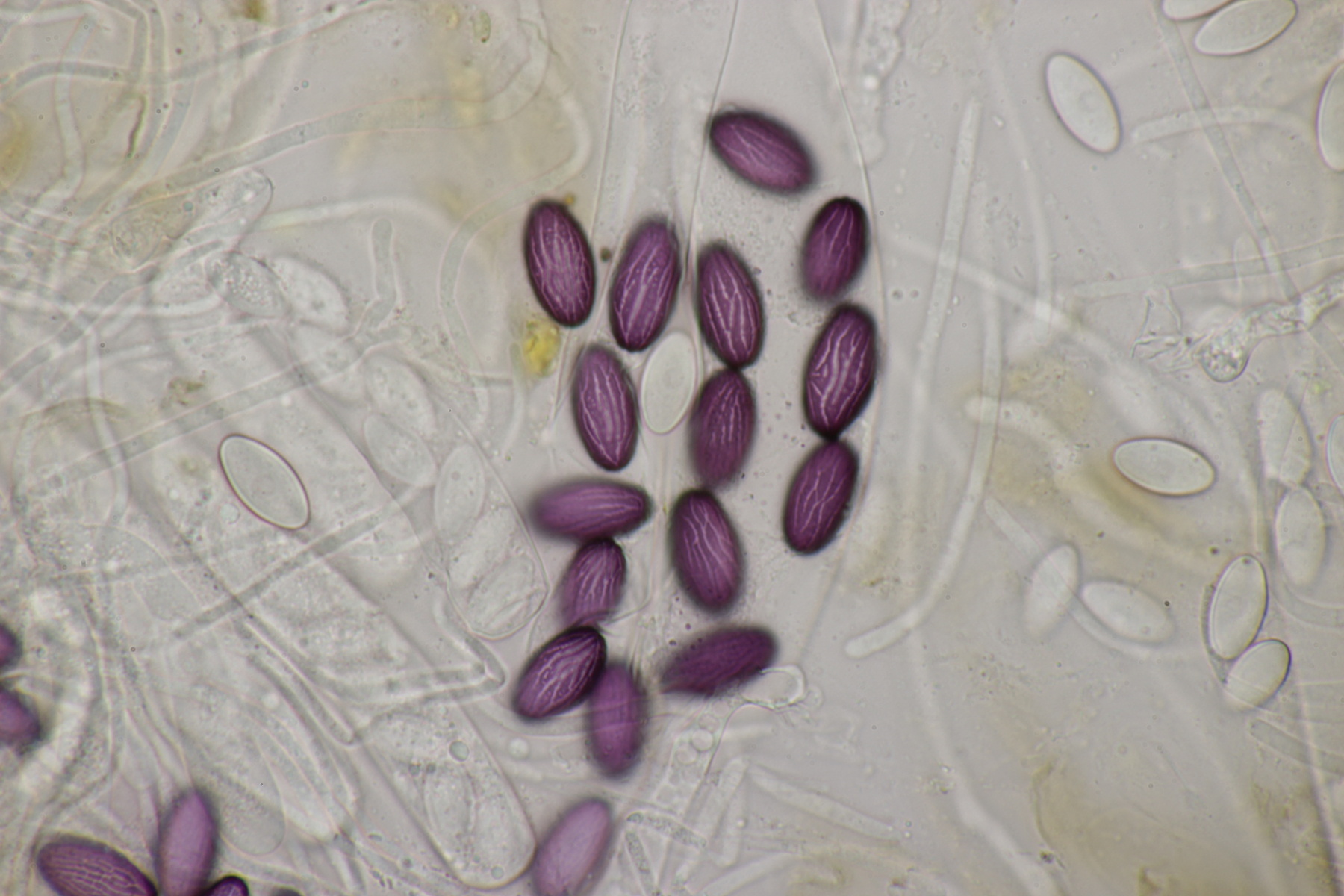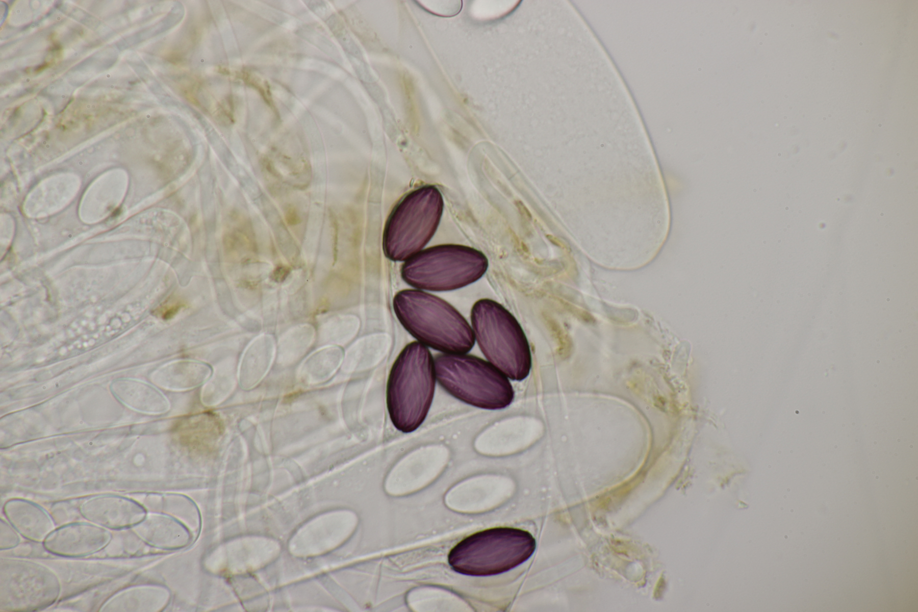 Recht dunkle Ascobolusse auf Kaninchendung. Sporen messen (18.1-22.5) µm x (10.5-12.4) µm und haben parallele Riefen. Dann setze ich bei van Brummelen mit der Sect. Ascobolus an und schlüssele über 1* -> 4 -> 5* -> 8* -> 11* -> 12* zu Ascobolus albidus. Geht ihr da mit?