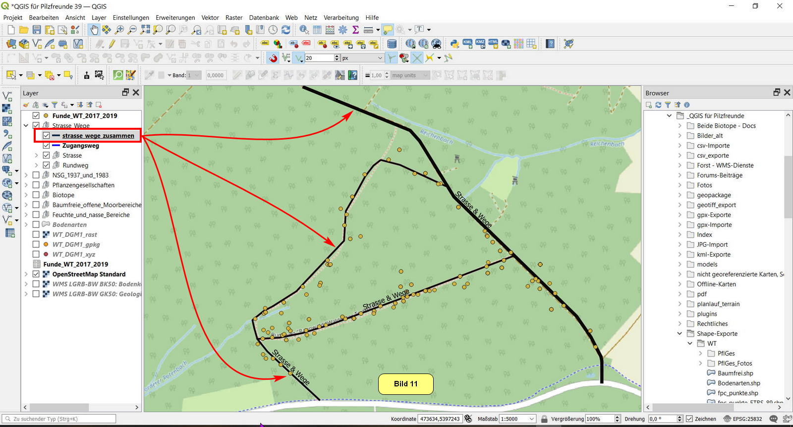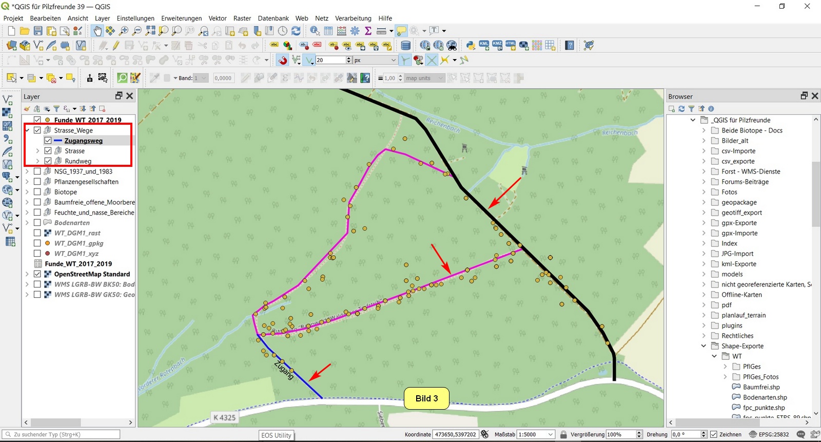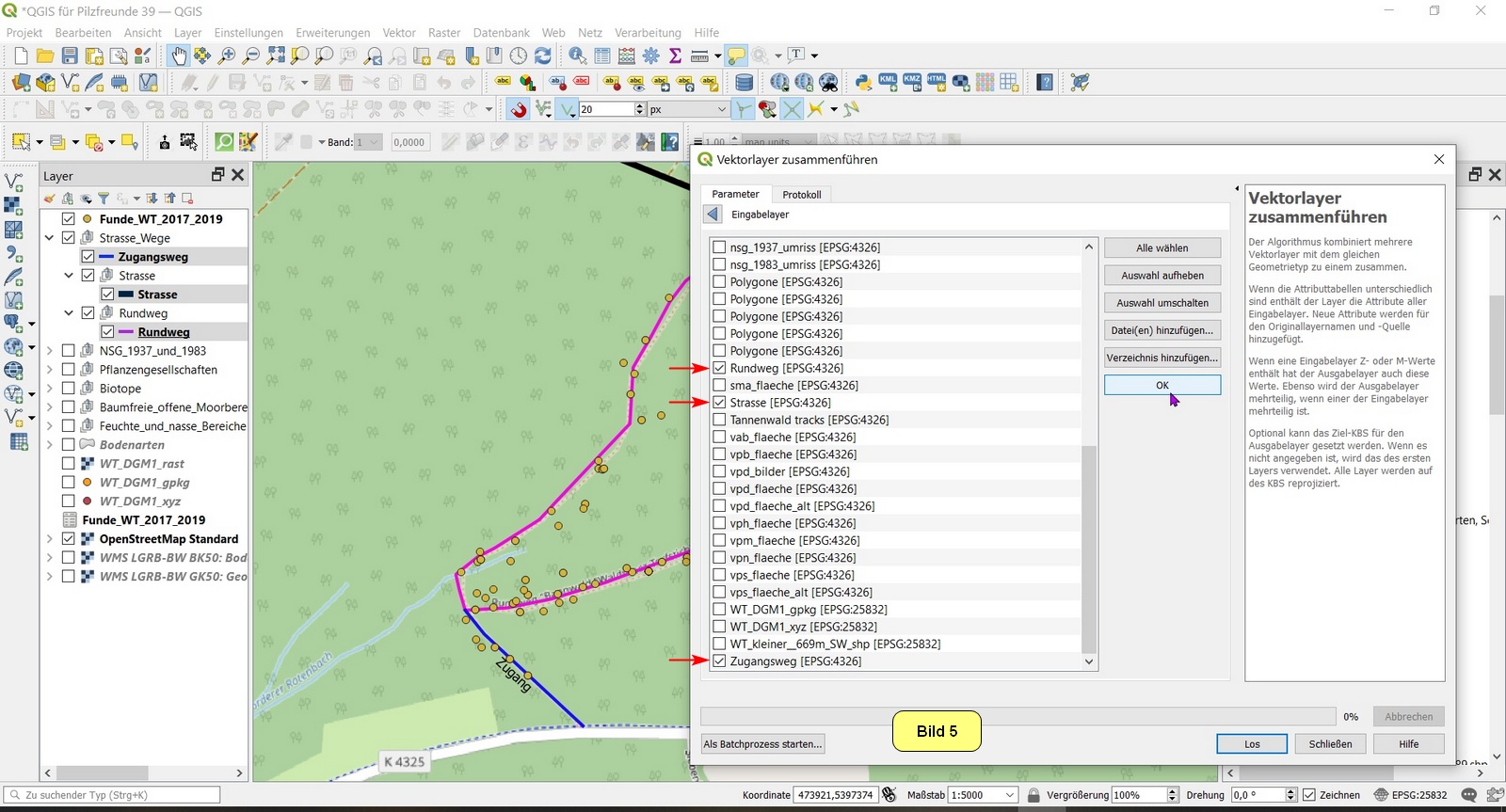 In Bild 3 zeigen die Pfeile auf die zusammenzuführenden Layer: Zugangsweg, Strasse, Rundweg.
