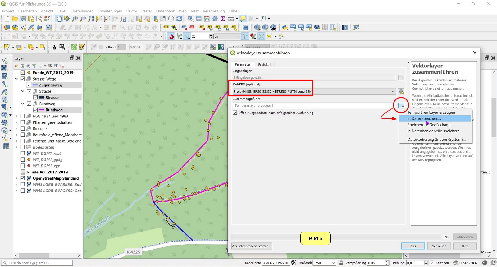 So erreicht man den Menüpunkt Vektorlayer zusammenführen: