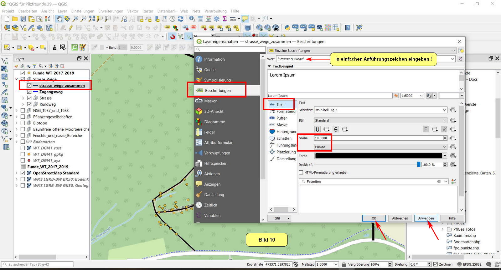 Die Bilder 10, 11 zeigen, wie wir die Beschriftung des Layers vornehmen. Dabei wird der Beschriftungstext als Zeichenstring in einfache Anführungszeichen gesetzt: