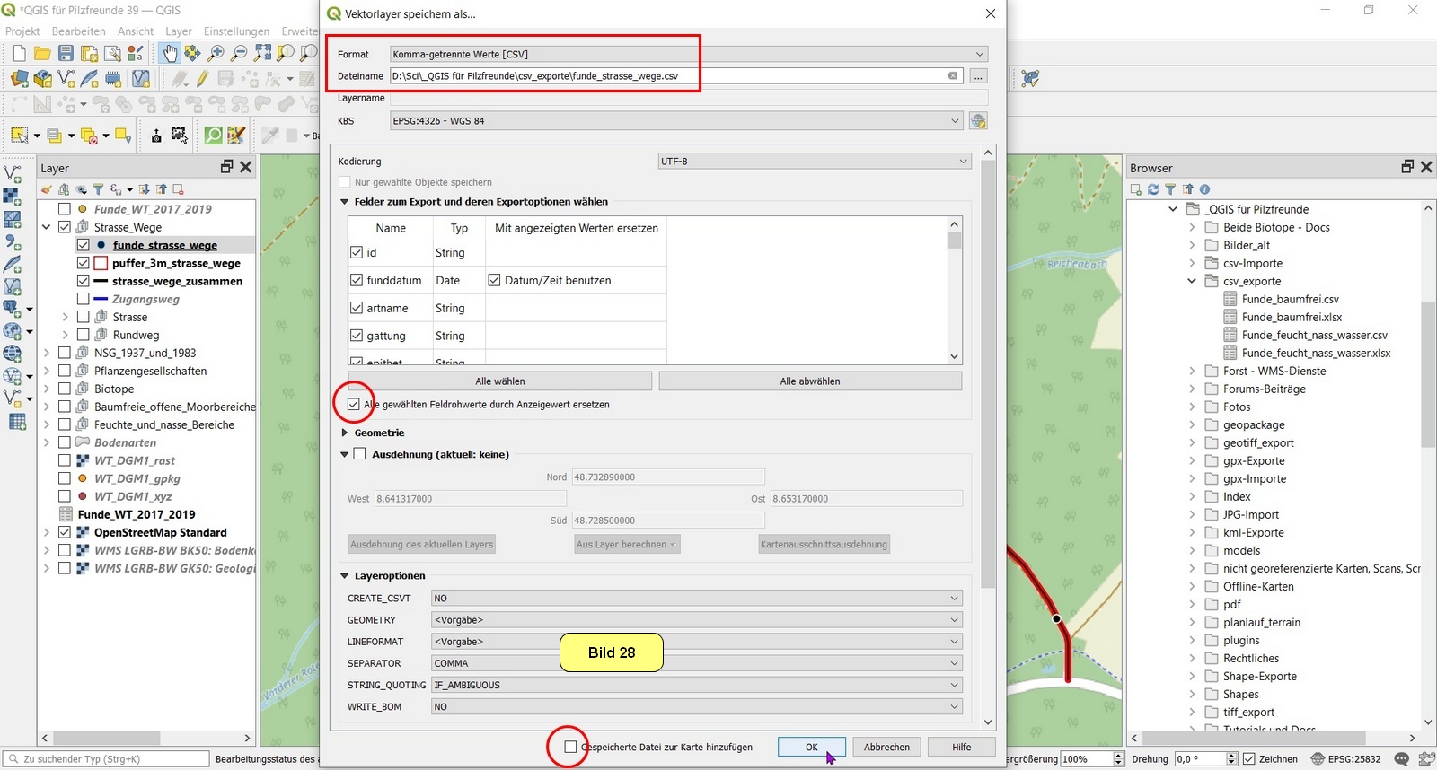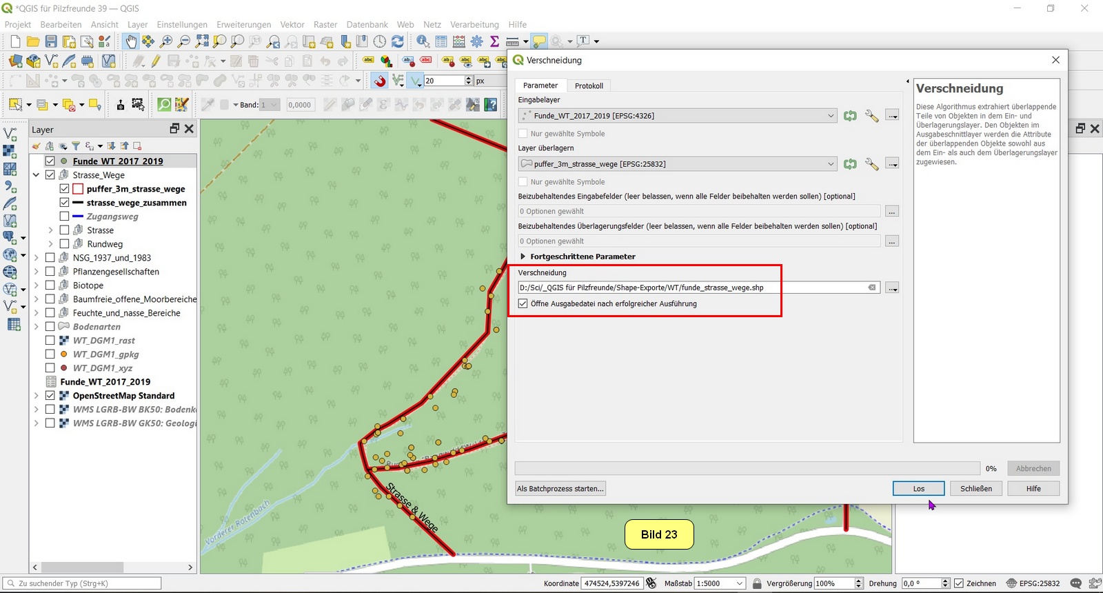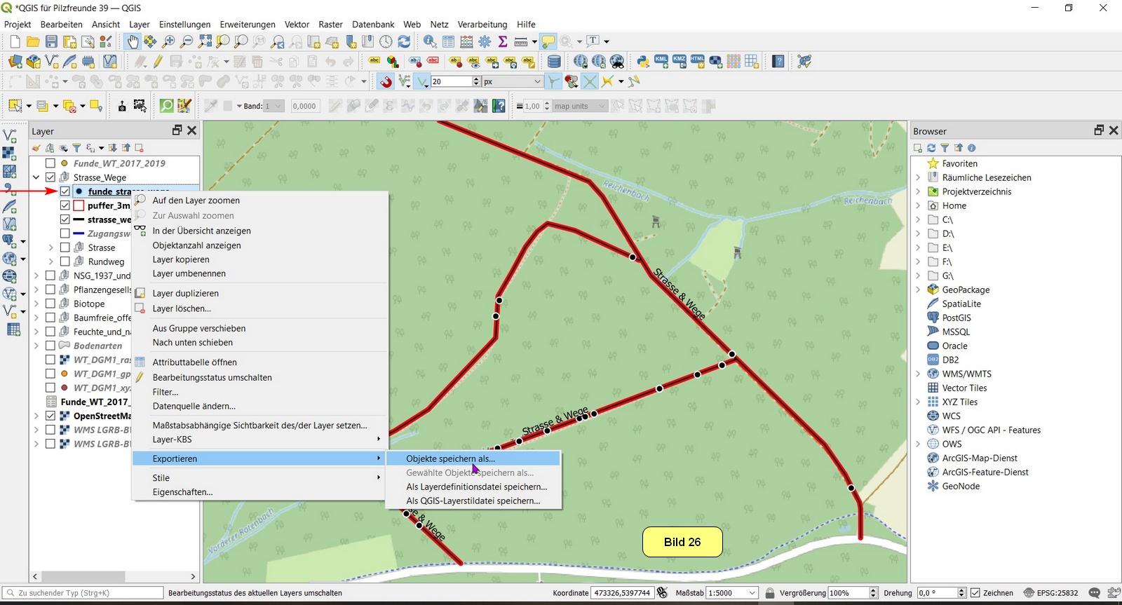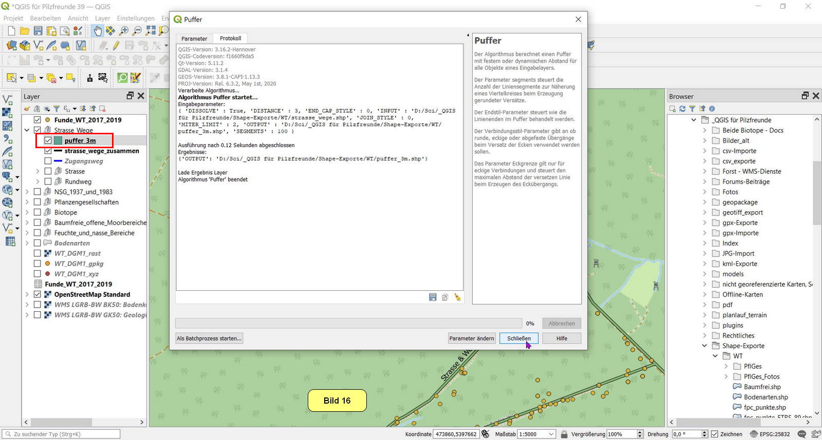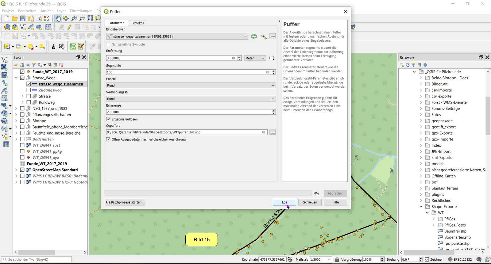 F) Export der Pilzfunde innerhalb des Puffers als csv-Datei