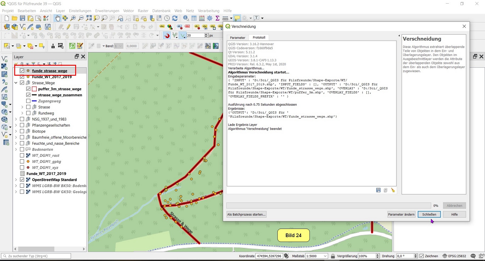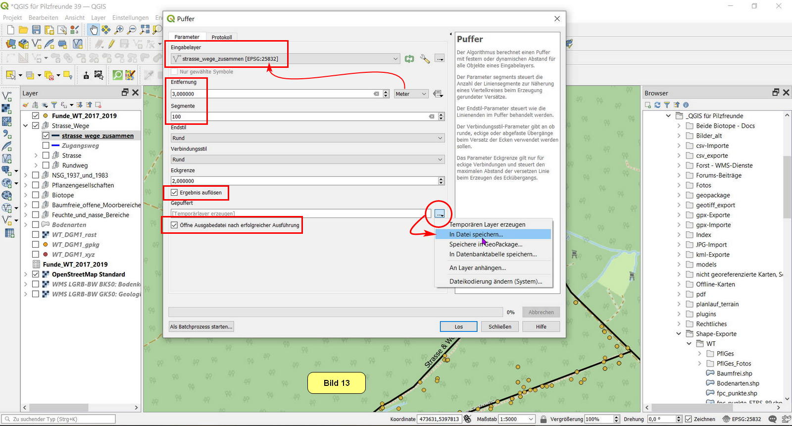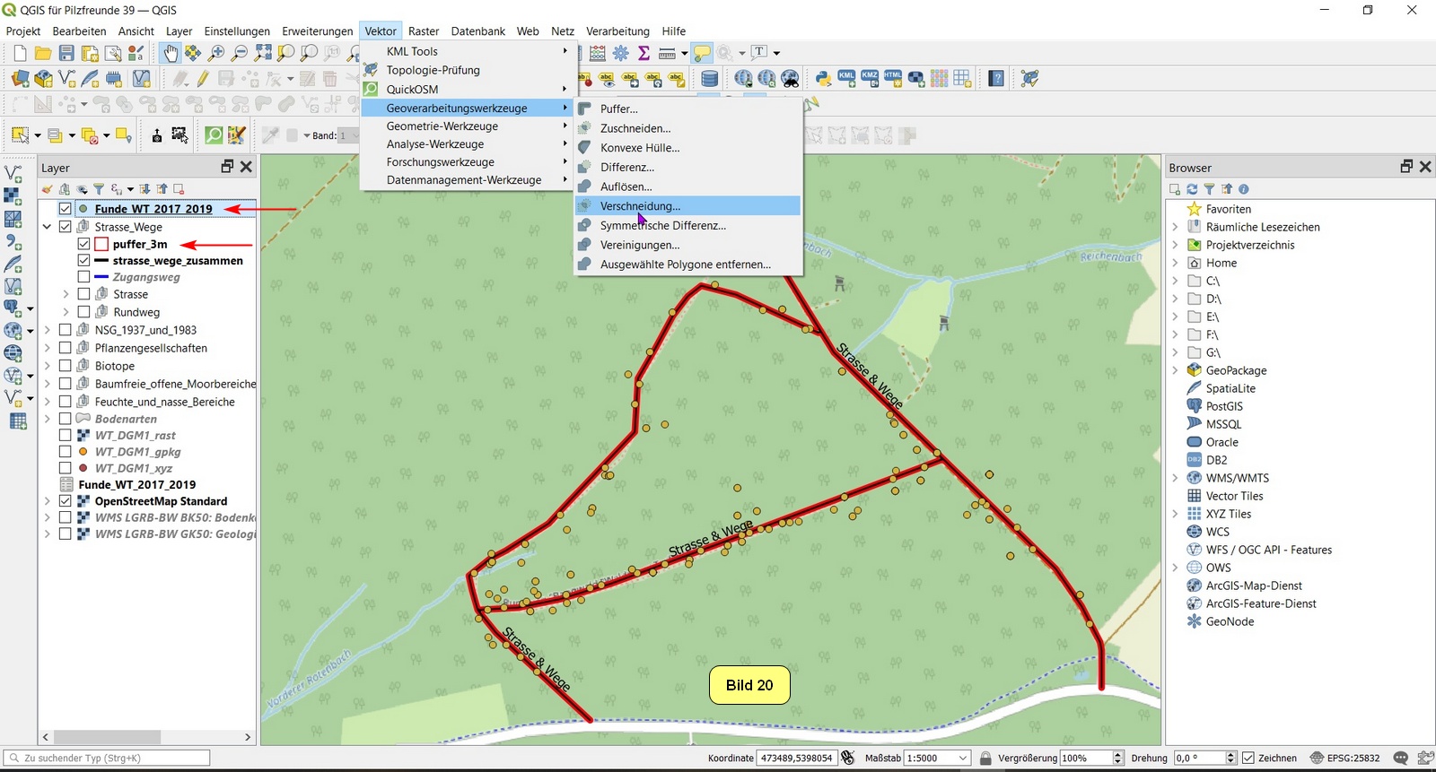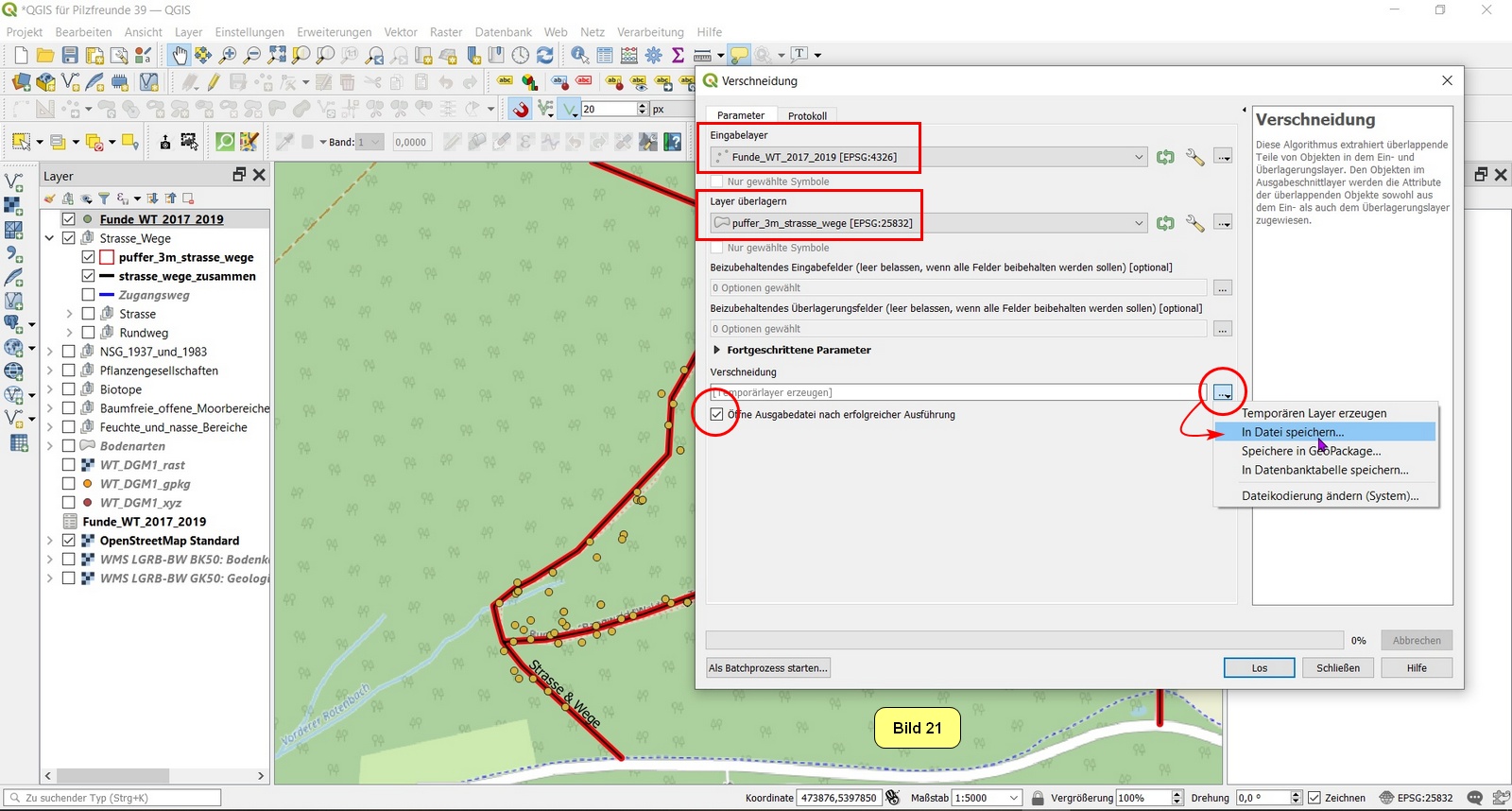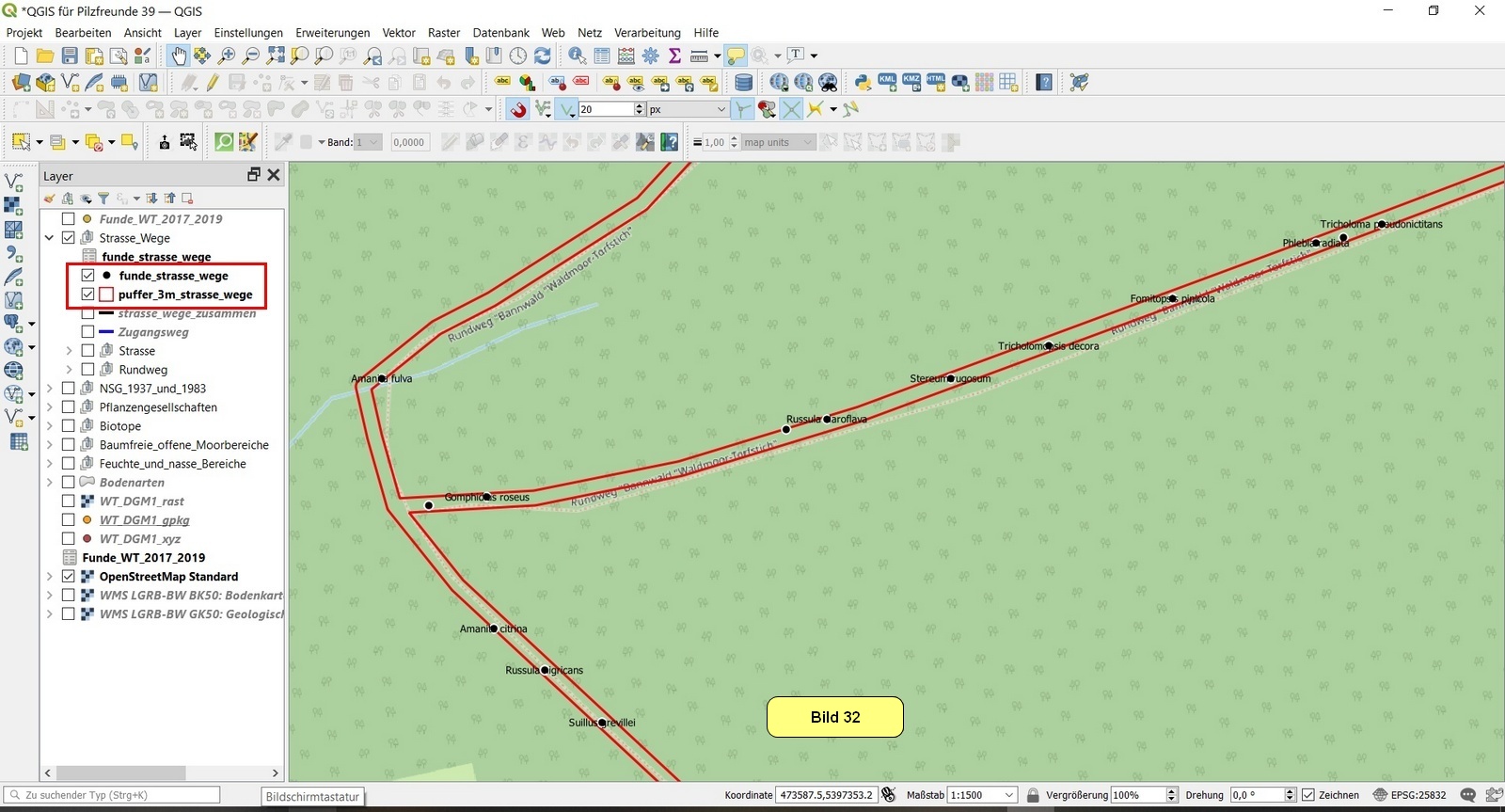 F) Export der Pilzfunde innerhalb des Puffers als csv-Datei
