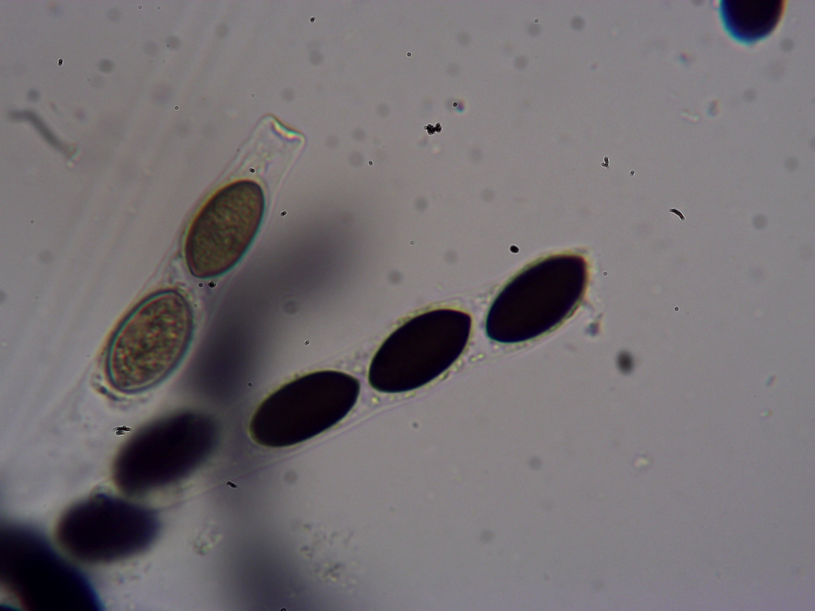 Probleme bereitet ausgerechnet Sordaria fimicola. Eigentlich passt alles. Die Sporen messen 20-23 x 11 µm. Sie haben damit aber ein "length/width ratio" von 2. Mit dem Schlüssel von Lundqvist käme ich dann bei S. alcina raus - wobei mein Längen/Breiten-Verhältnis ganz am unteren Rand (angegeben ist 2-2,5) kratzt.
