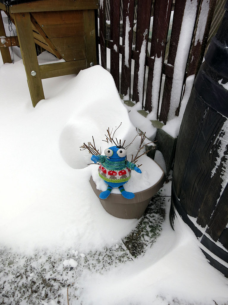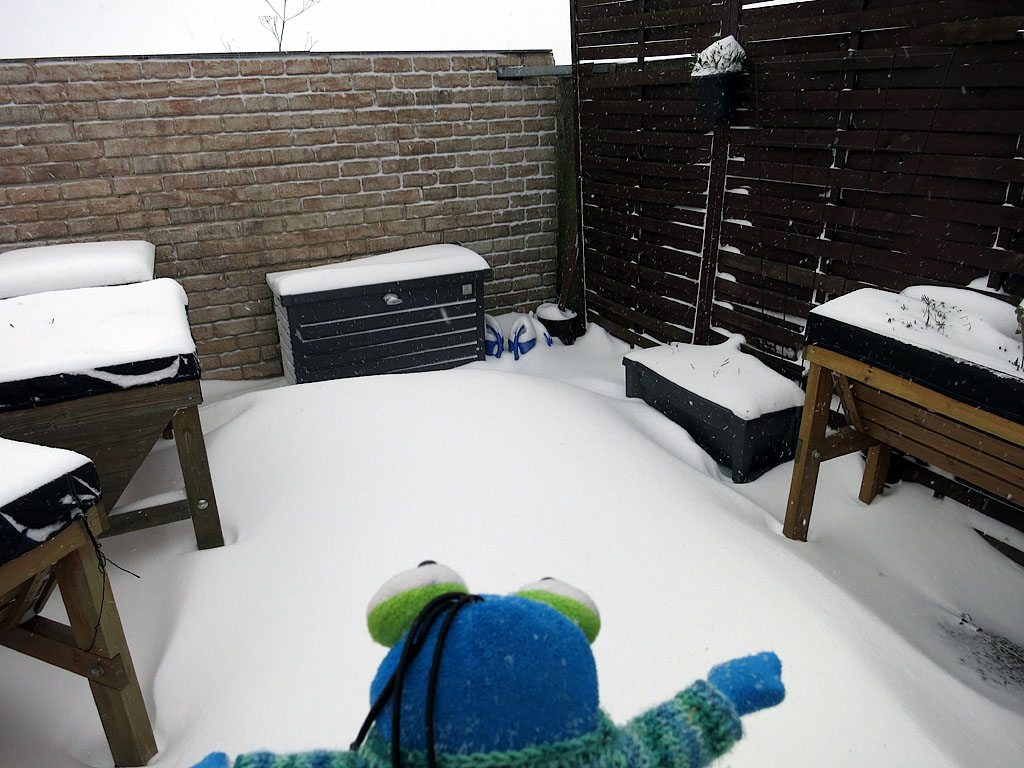Es sieht schon deutlich anders aus als gestern. Es schneit und weht seit heute nacht. :grolleyes: Der Wind ist eisig kalt, aber ich habe mich trotzdem mal kurz für Euch auf meine Terrasse getraut.