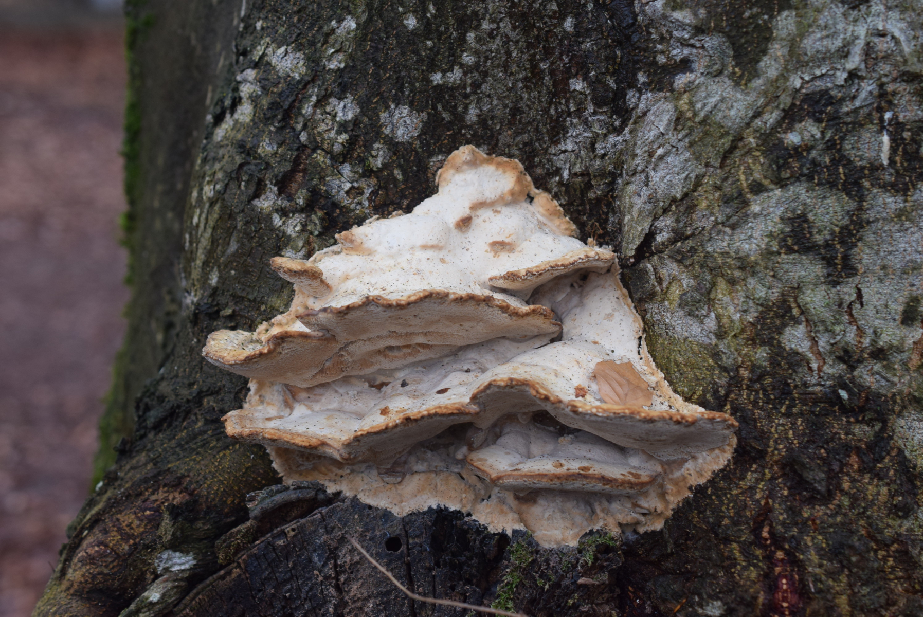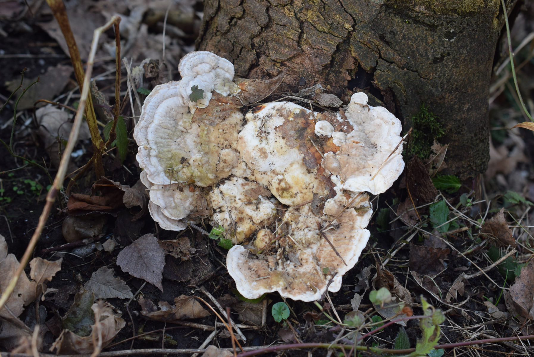 Zuerst dachte ich , es handele sich um Trametes hirsuta , aber nach dem ich mir Lamellen angesehen hatte , stellte ich fest dass das Labyrinthische Lamellen sind . Aufgrund der Lamellenstruktur und des Eichenstumpfes als Substrat dachte ich sofort an Daedalea guercina , aber nach einer kurzer Beobachtung stellte ich fest dass die Lamellenstruktur nicht so typisch für Daedale guercina waren . Nach langer Zeit ich habe in Internet gefunden - gelesen das Lenzites betulina ( ich hab schon mehrere mall aber immer an Birkenast gefunden ) das auch auf einem Eichenstumpf wachsen kann . Also Lenzites betulina an Eichenstumpf .