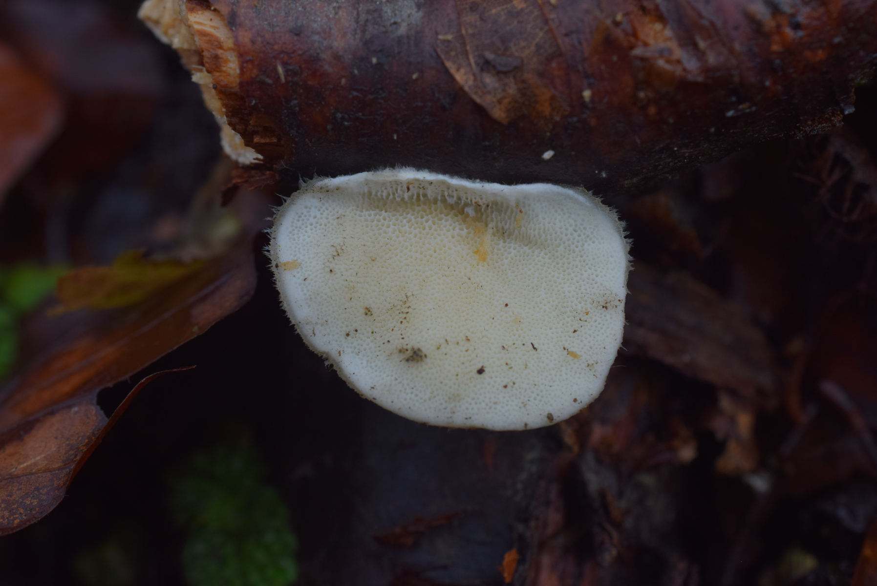 3. An tote Buchenast , junge noch nicht so formierte Fruchtkörper . Für junge Trametes hirsuta etwas ungewöhnlich . Type an Trametes pubescens , hat ein leichtes Geruch ( nach was ? ) . Wegen Geruch hab auch an Antrodiella zuerst gedacht Zb. fragrans aber auch ungewöhnlich