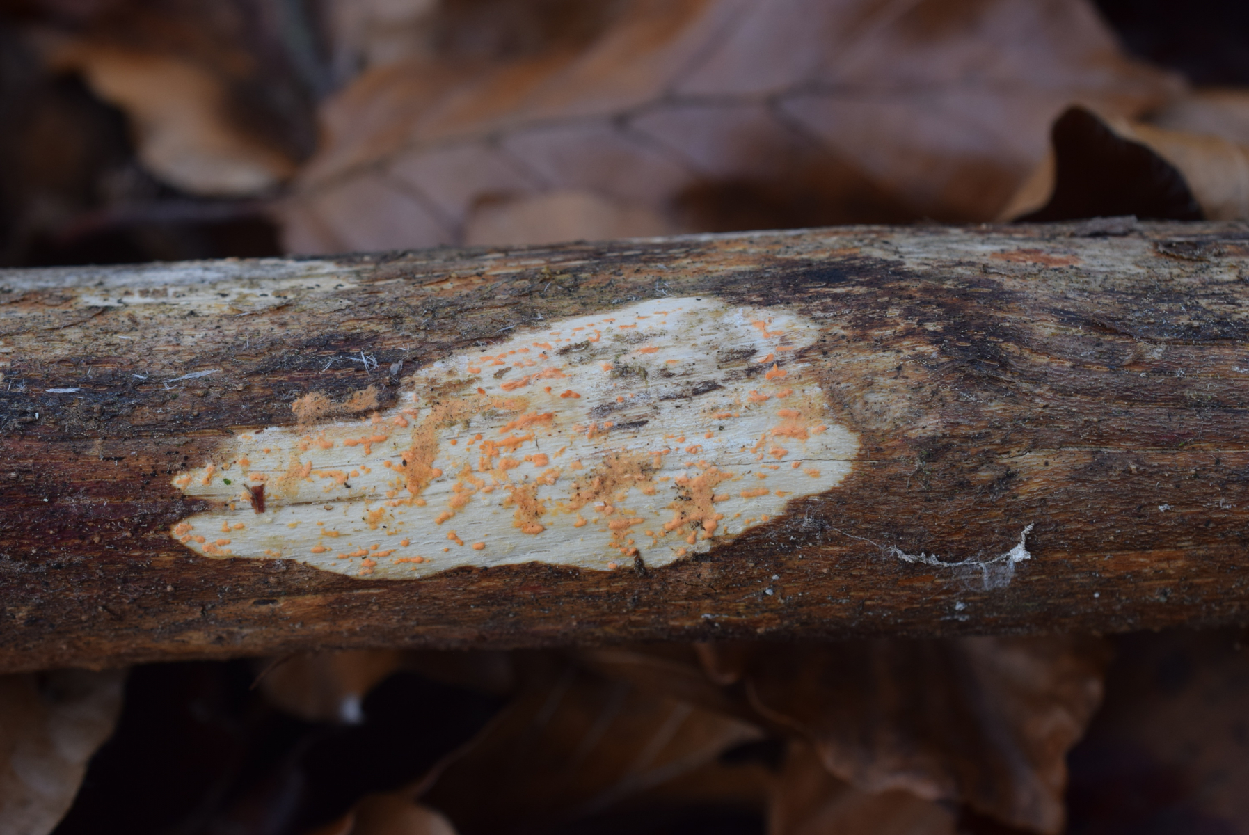5. An Buchenast , irgendwelche rote Punktchen ( wie Nectria zinnabarina ) an weise Beleg . Ist das weiße Beleg ein Art und Rote Punkte anderes Art ?