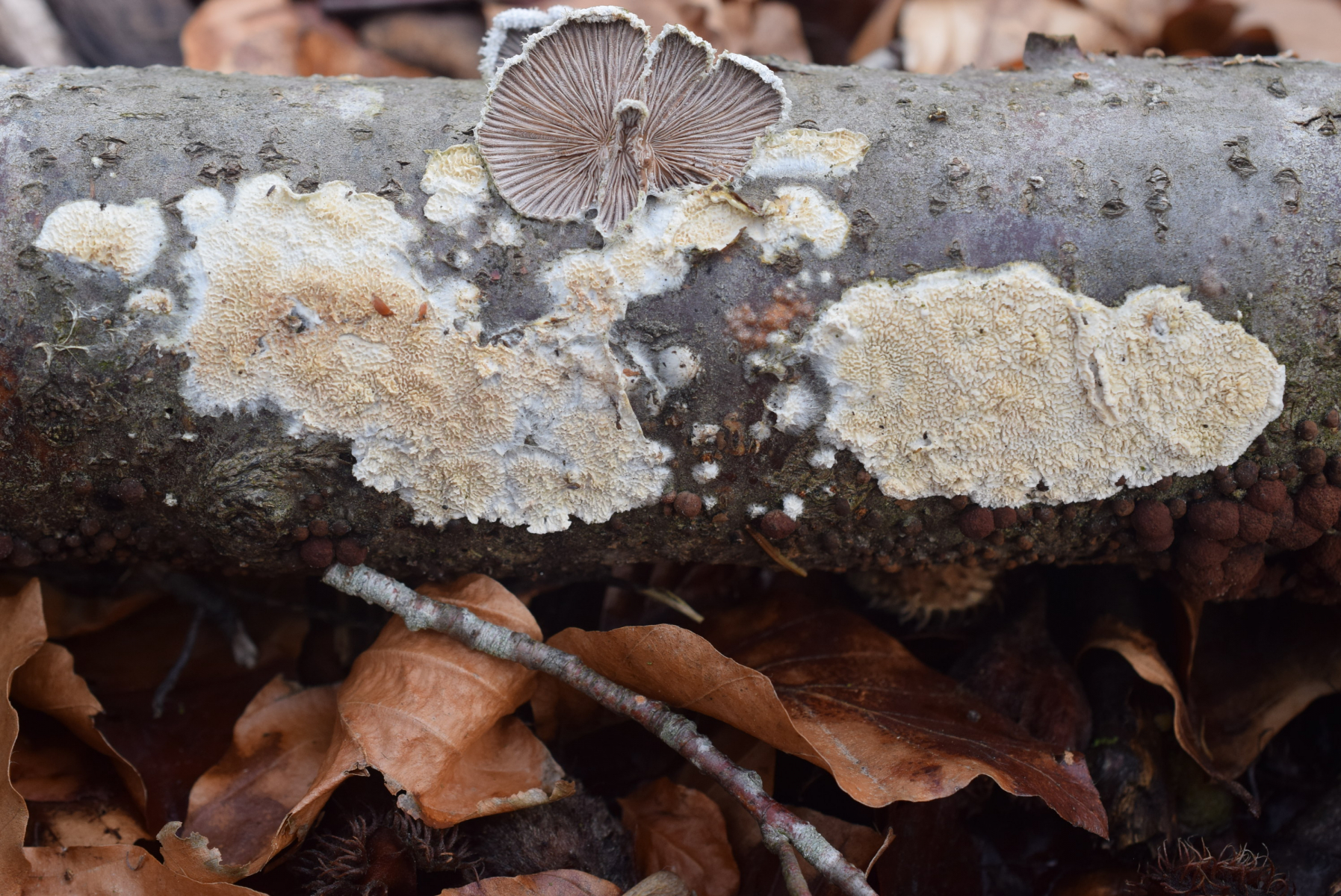 3. An tote Buchenast , junge noch nicht so formierte Fruchtkörper . Für junge Trametes hirsuta etwas ungewöhnlich . Type an Trametes pubescens , hat ein leichtes Geruch ( nach was ? ) . Wegen Geruch hab auch an Antrodiella zuerst gedacht Zb. fragrans aber auch ungewöhnlich