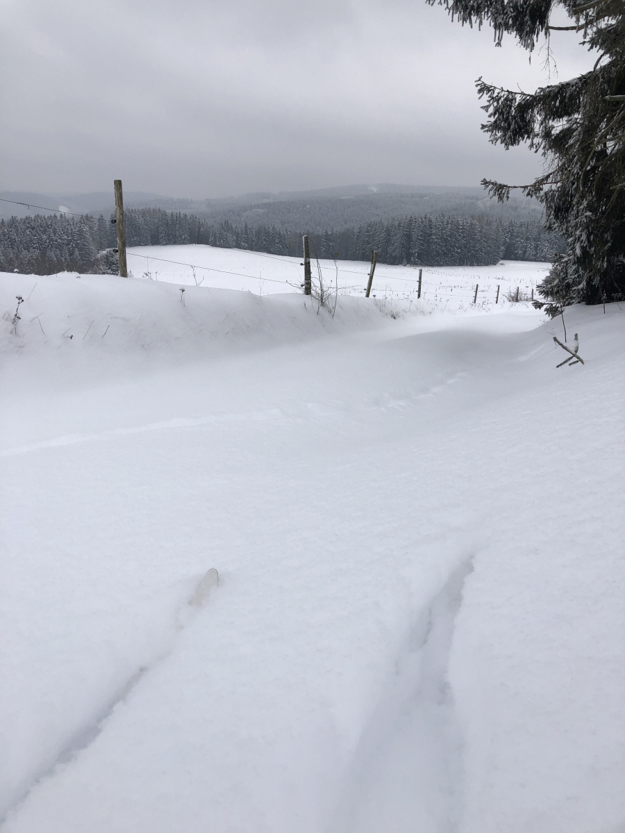 Wenn der Wind die Spur nicht zuweht, geht's bei den nächsten Runden schon viel einfacher. Früher als Kinder haben wir uns im Schwarzwald auch unsere eigenen Langlaufspuren durch den Wald gelegt - der Anfang war immer mühselig. Aber dann haben wir die eigentlich gar nicht mehr groß benutzt, sondern lieber jeden Tag neue Spuren gelegt: Als Kind will man das ja genau so. Dafür haben die älteren Leute dann unsere angelegten Spuren vom Vortag benutzt - sofern wir keine Fallen eingebaut hatten wie Überquerungen von trügerischen Bachläufen, Gräben, in denen man einbricht, durch Schneeverwehungen unsichtbare Böschungen oder Baumstämme und so weiter...