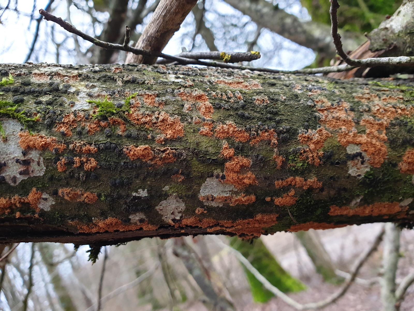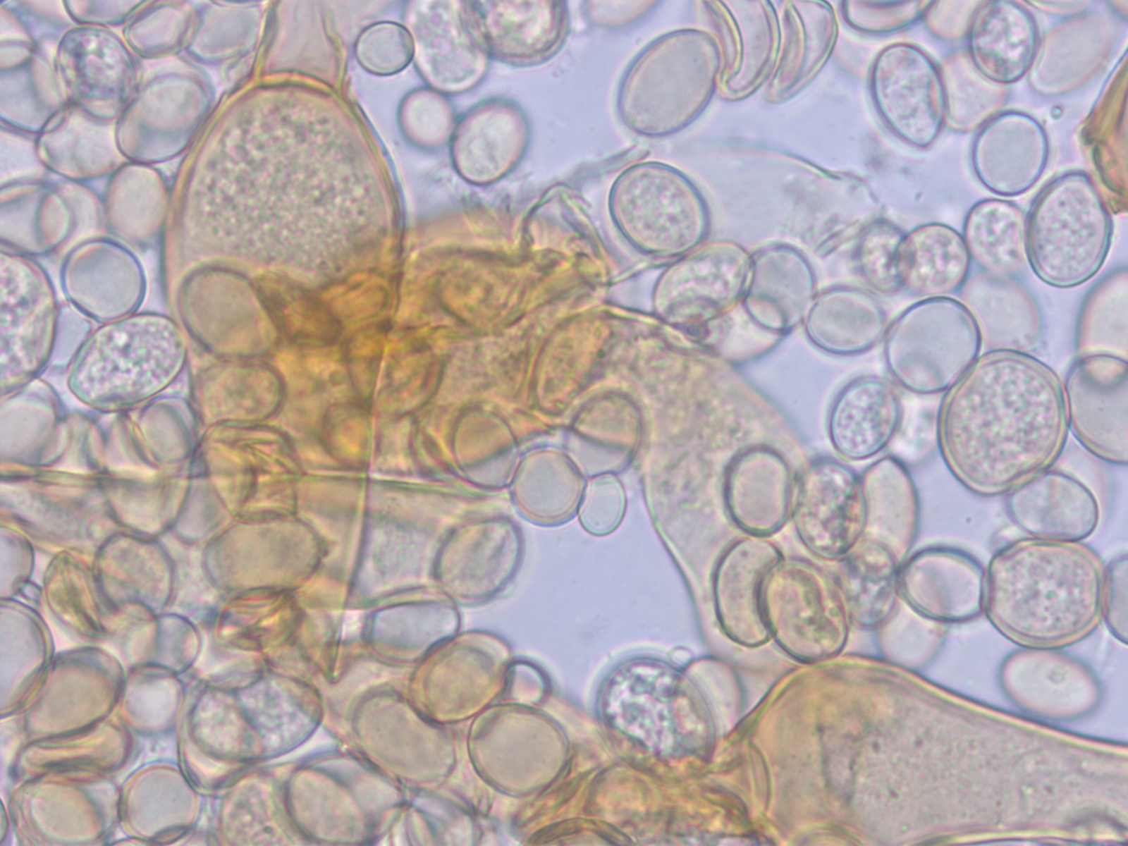 Die unterschiedlich grossen, breitovalen bis subglobosen Sporen schein glatt bis etwas rauh? Der Fund auf einem Eichenast beherbergte grossflächich diese Wesen. Am Ast haben sie eine rostrote Farbe, unter der Stereolupe bei 50facher Vergrösserung sind die Fruchtkörperchen eher blass.