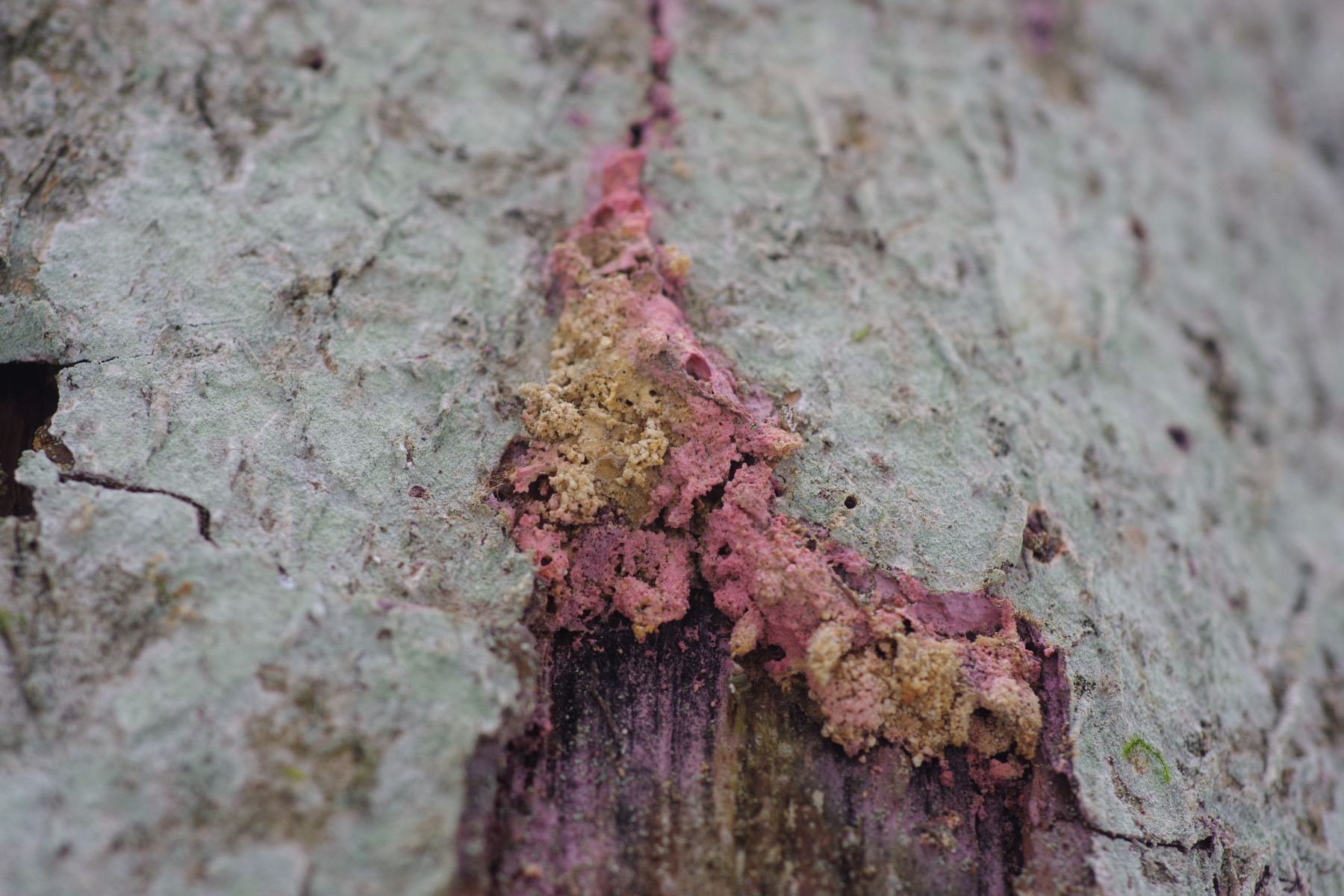 Der rosa Flaum könnte ganz gut ein Flechtenparasit sein, da ist ja auch eine Flechte direkt darunter (zumindest der Thallus). Frag' mich aber nicht, welche, davon habe ich keine Ahnung.