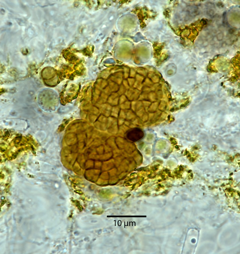 Hier vergrößert - und man sieht neben der Spore die kleinen, dunklen Kugelzellen, die wirklich sehr klein sind.