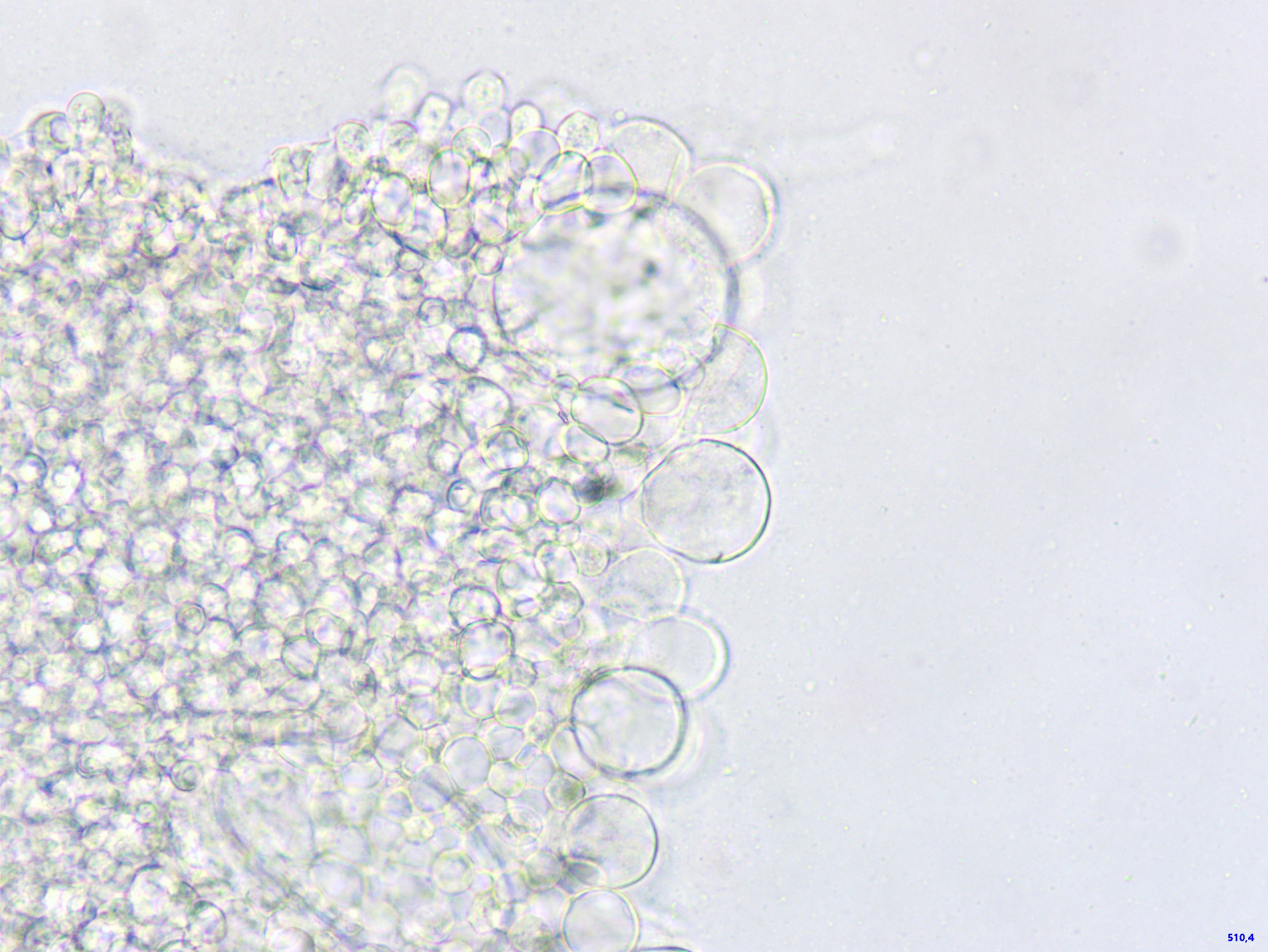 An jungen FK sind bereits mit der Stereolupe Seten an Hut und Stiel feststellbar.