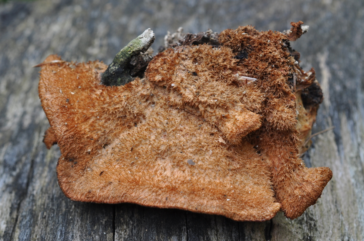 in Junge Stadium weiß ( rienweiß ) später orangegelb , in alter dunkel orangebraun . Hutdurchmesser 3 bis 15 ( 20 und mehr ) Centimeter . Wachst Muschellformig aber auch als einzelne Fruchtkörper . Oberseite in junge Stadium Filzig später rauhaarig ( oft mit lange Haare ) Unterseite Stachelig