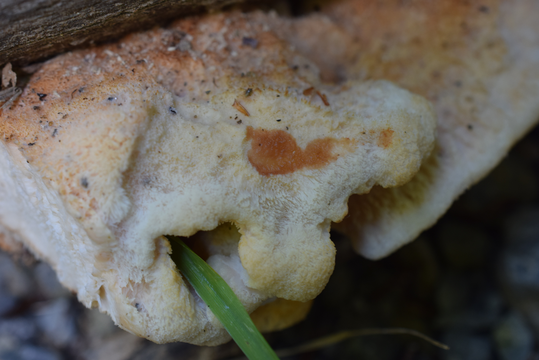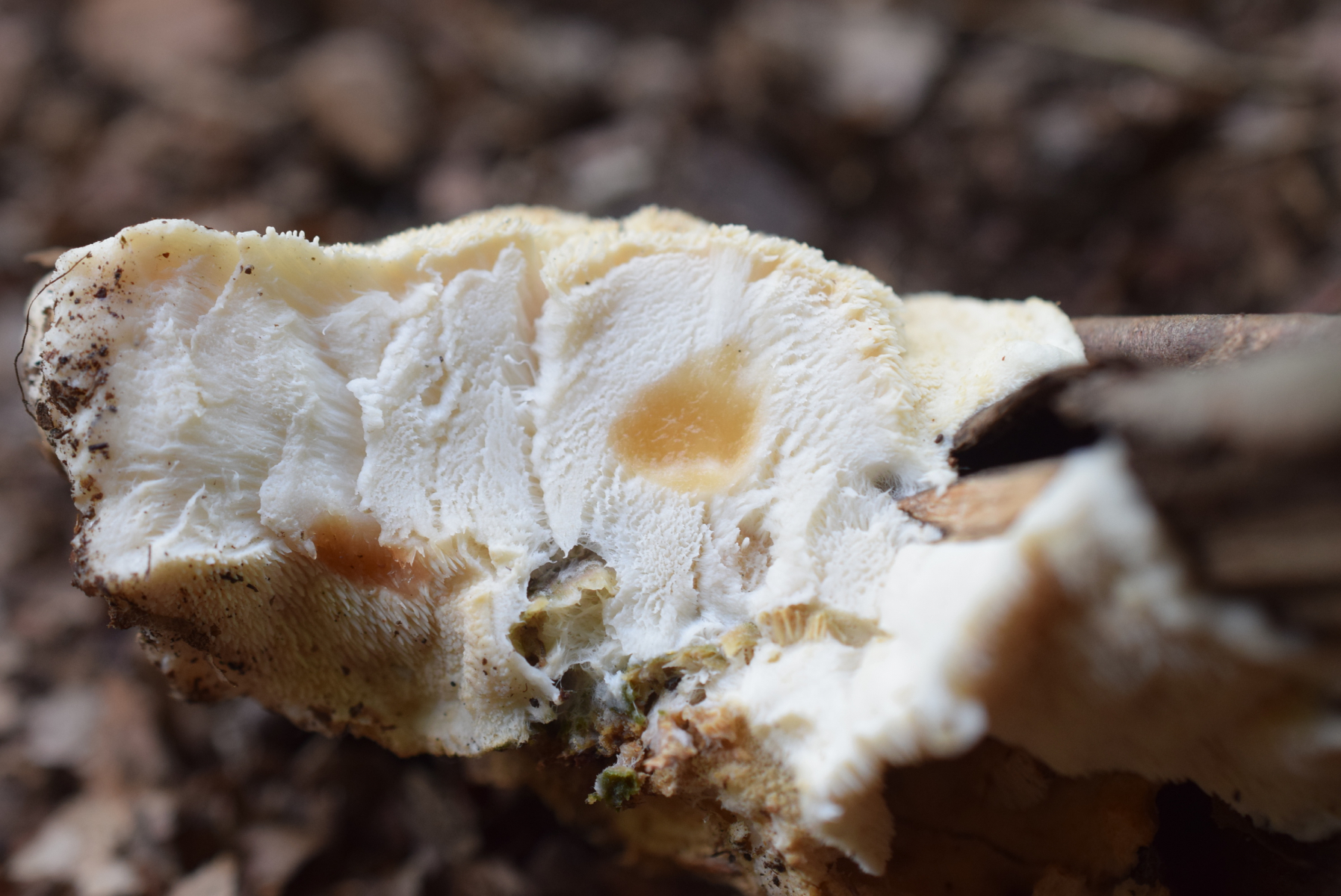 Stacheln : Dicht stehend , bis 1 Centimeter lange , bei Junge Fruchtkörper weißlich in alter schwach orange später dunkel orange