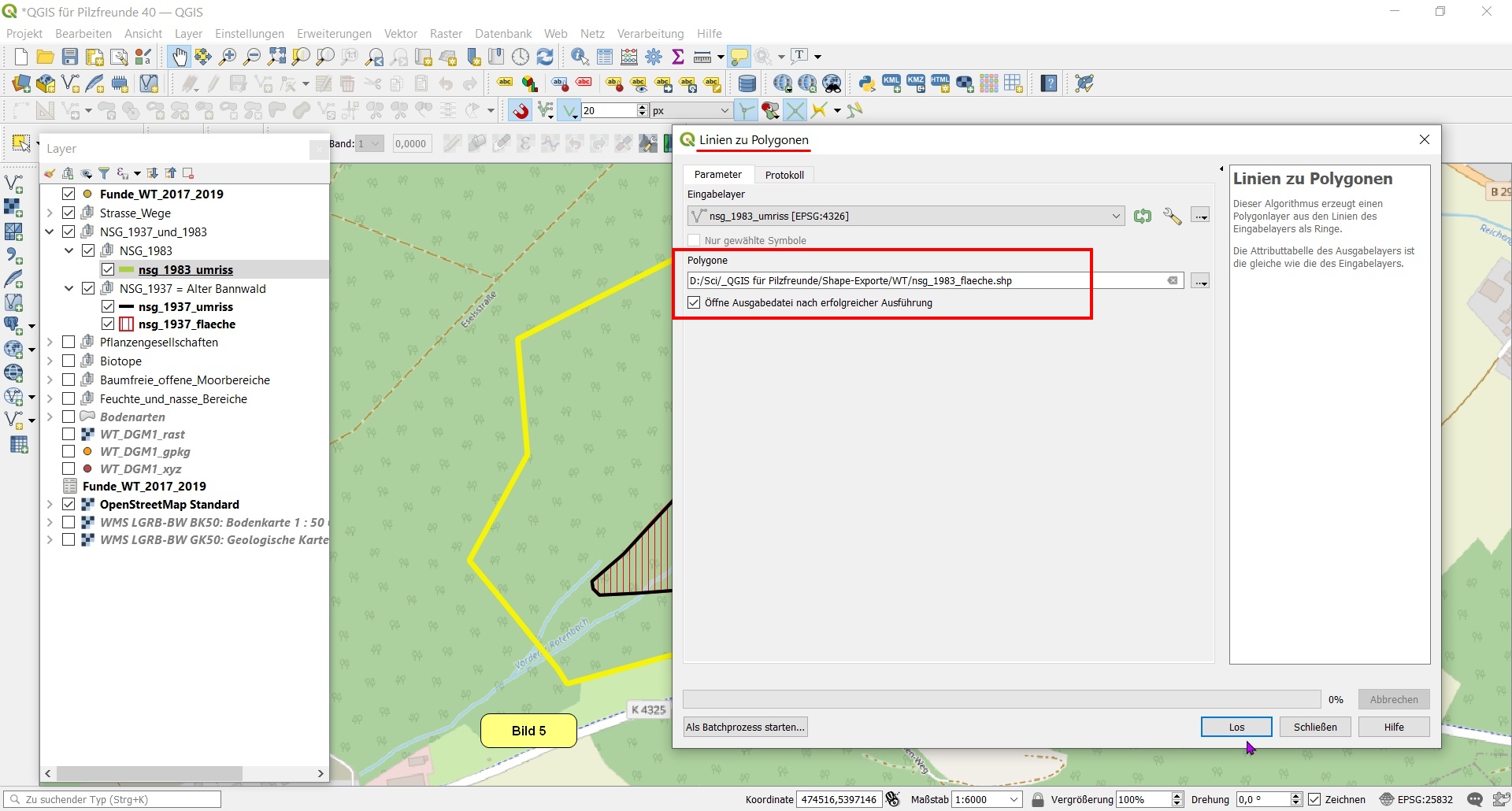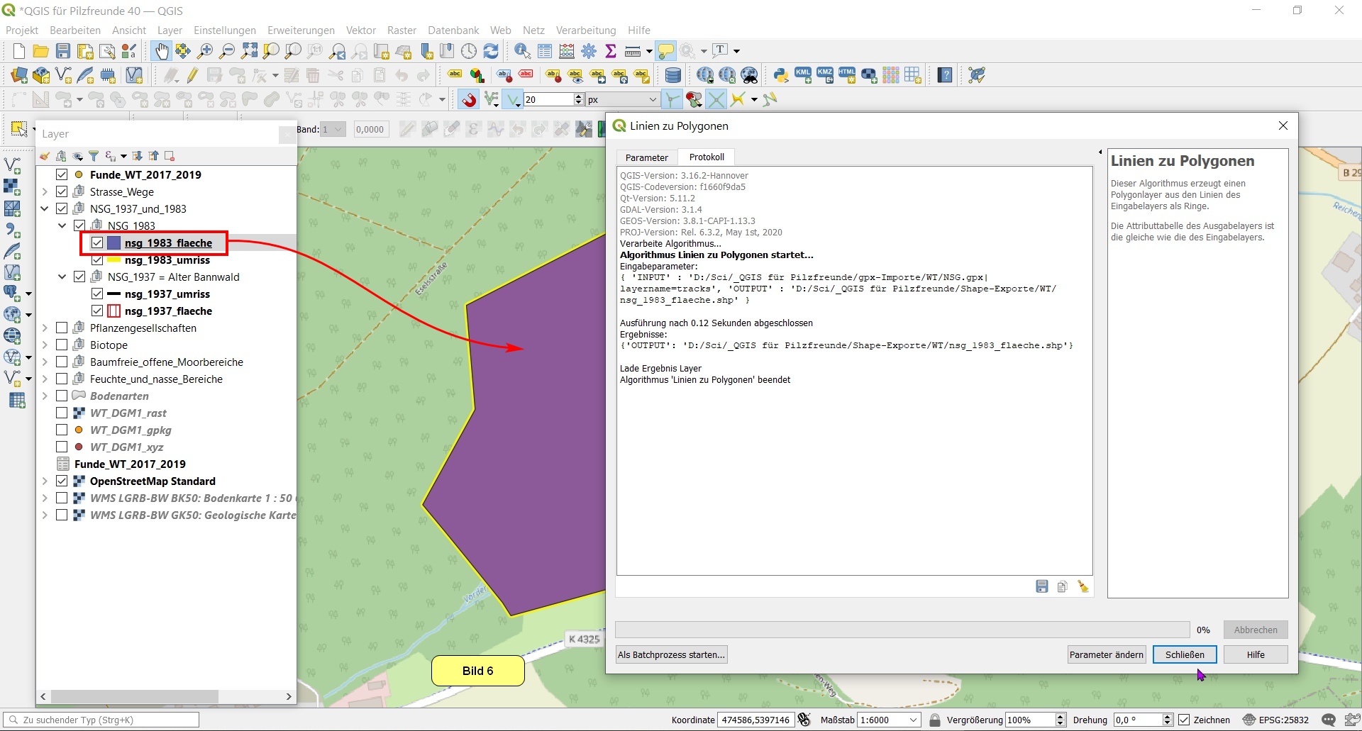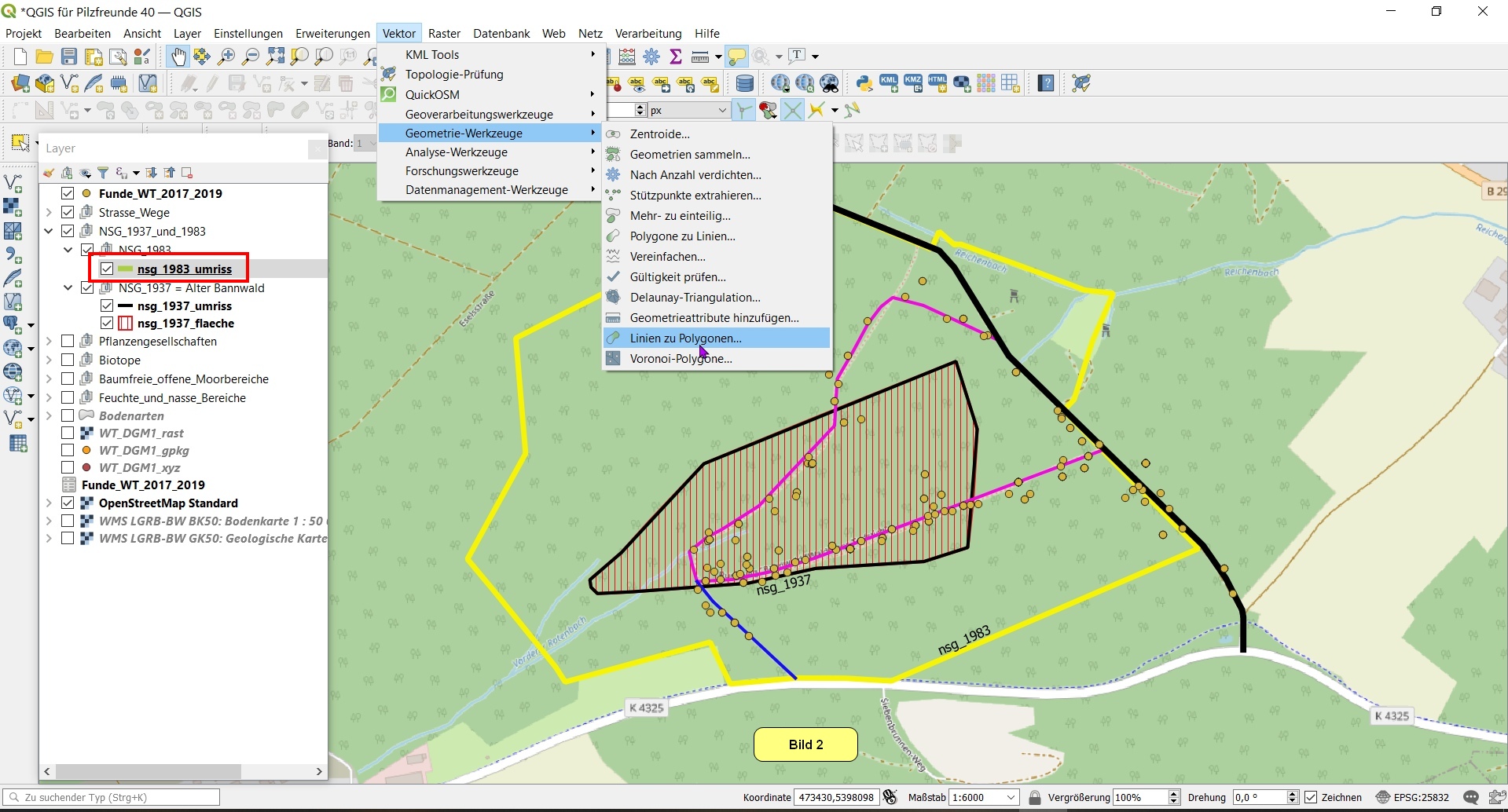 Da vom nsg_1983 bisher nur der Umriss vorhanden ist, muss die zugehörige Fläche erst erstellt werden. Dazu wird nsg_1983_umriss selektiert und dann das Werkzeug Linien zu Polygonen... aufgerufen: