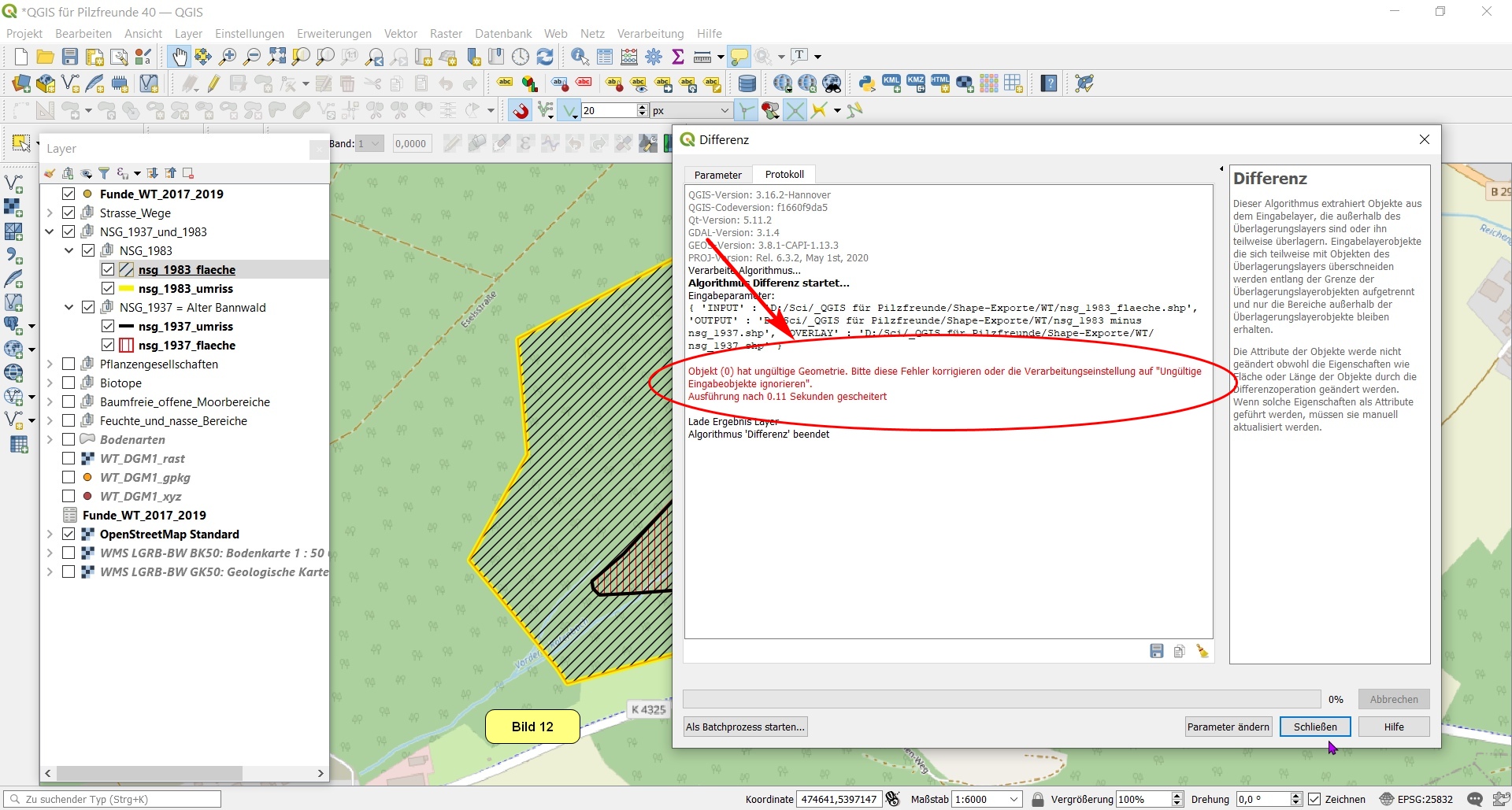 - Die Fehlerdiagnose von nsg_1937_flaeche hätte man alternativ mit Hilfe des Plugins Topologie-Prüfung durchführen können. Siehe dazu auch Teil 36, wo auf dieses Plugin kurz eingegangen wird.