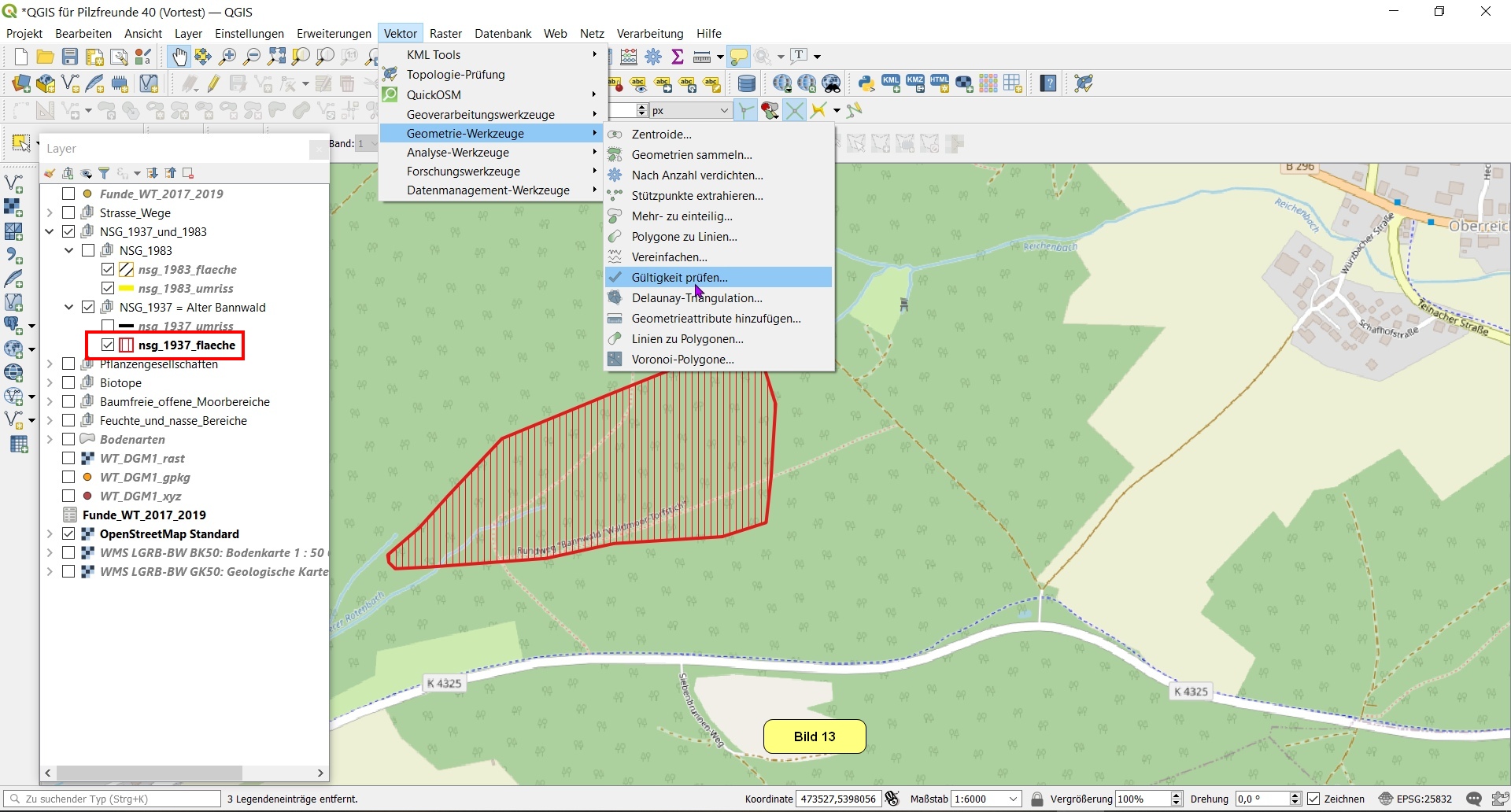 Probeweise wollen wir erst einmal nsg_1937_flaeche untersuchen. Dazu aktivieren wir diese Fläche im Layerfenster und starten das Geometriewerkzeug Gültigkeit prüfen: