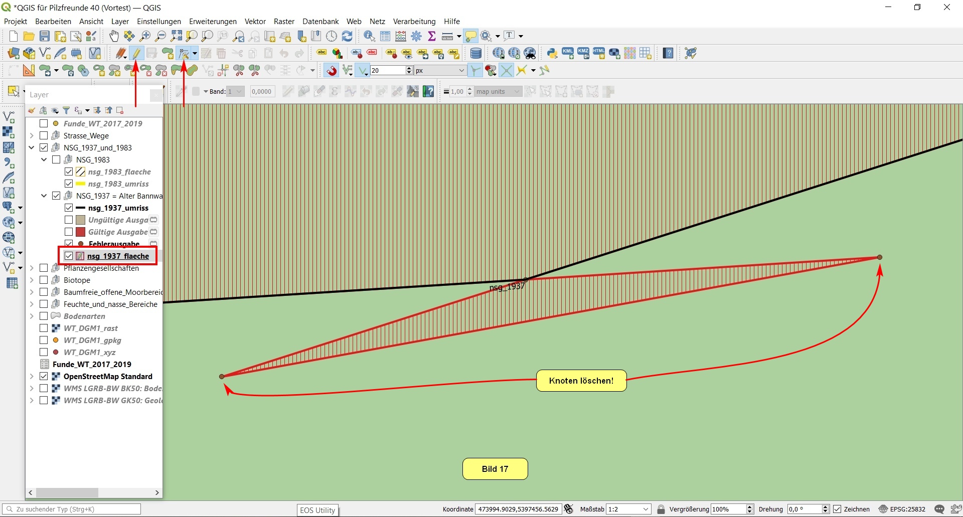 Zwecks Fehlerbereinigung aktivieren wir im Layerfenster nsg_1937_flaeche, schalten den Editiermodus ein und aktivieren das Knotenwerkzeug. Nun werden die beiden außenliegenden Knoten gelöscht, das Editierergebnis gespeichert und der Editiermodus wieder verlassen.