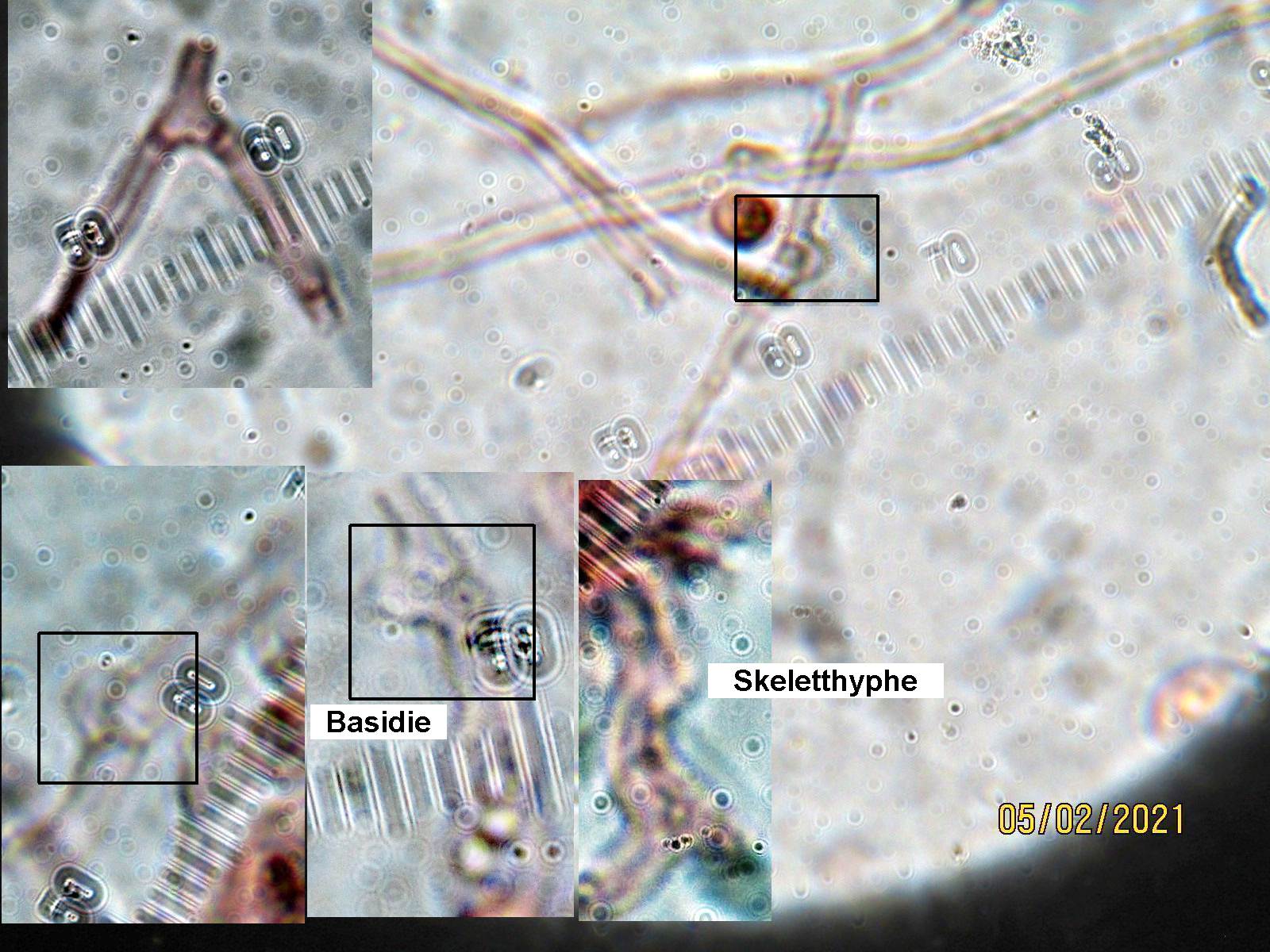 Die Skeletthypen sind übrigens wirklich scheuslich zu beobachten, weil halt nur sehr vereinzelt im Subikulum zu finden und da dann verschleiert von massenhaft kristallinen Einlagerungen und einem Gewirr aus dünnen, generativen Hyphen. Ich denke aber, daß die Art an ihrem makroskopischen Erscheinungsbild in Kombination mit den winzigen Sporen, den Hyphidien und den ziemlich ungewöhnlichen Zystiden auch ohne die Skeletthyphen gut erkennbar ist.