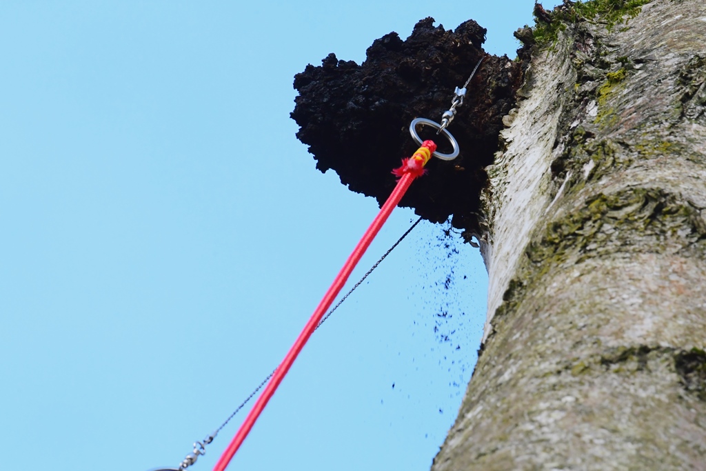 Ausgerüstet mit der bebastelten Seilsäge und einer 7 m langen Angelrute ging es ab zum Pilz.