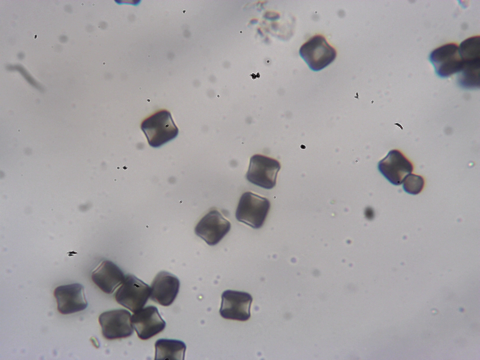 Sporen sind scheinbar würfelförmig mit eingebauter Sanduhr und 9 x 9 µm groß.