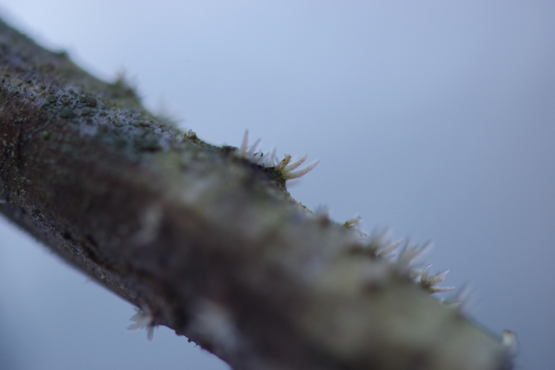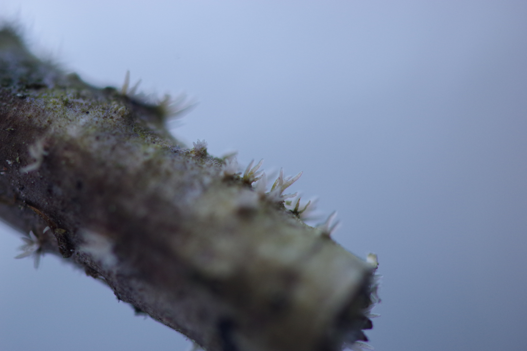 Bei Mucronella ist die Fruchtkörperform und auch die Anordnung der Fruchtkörper etwas anders, zudem finde ich die meist an morscherem, liegendem und dickerem Holz.Vielleicht eher was aus der Richtung Kavinia / Hydnocristella / Ramaricium?