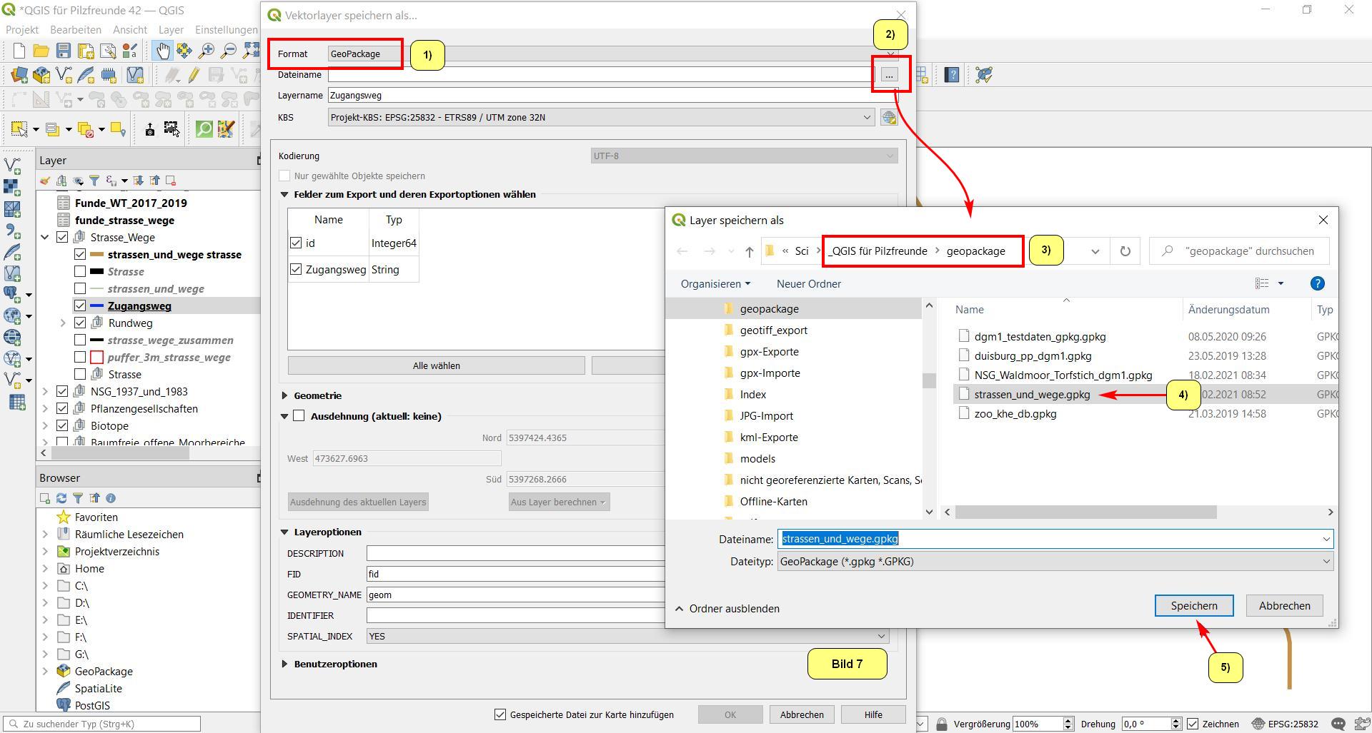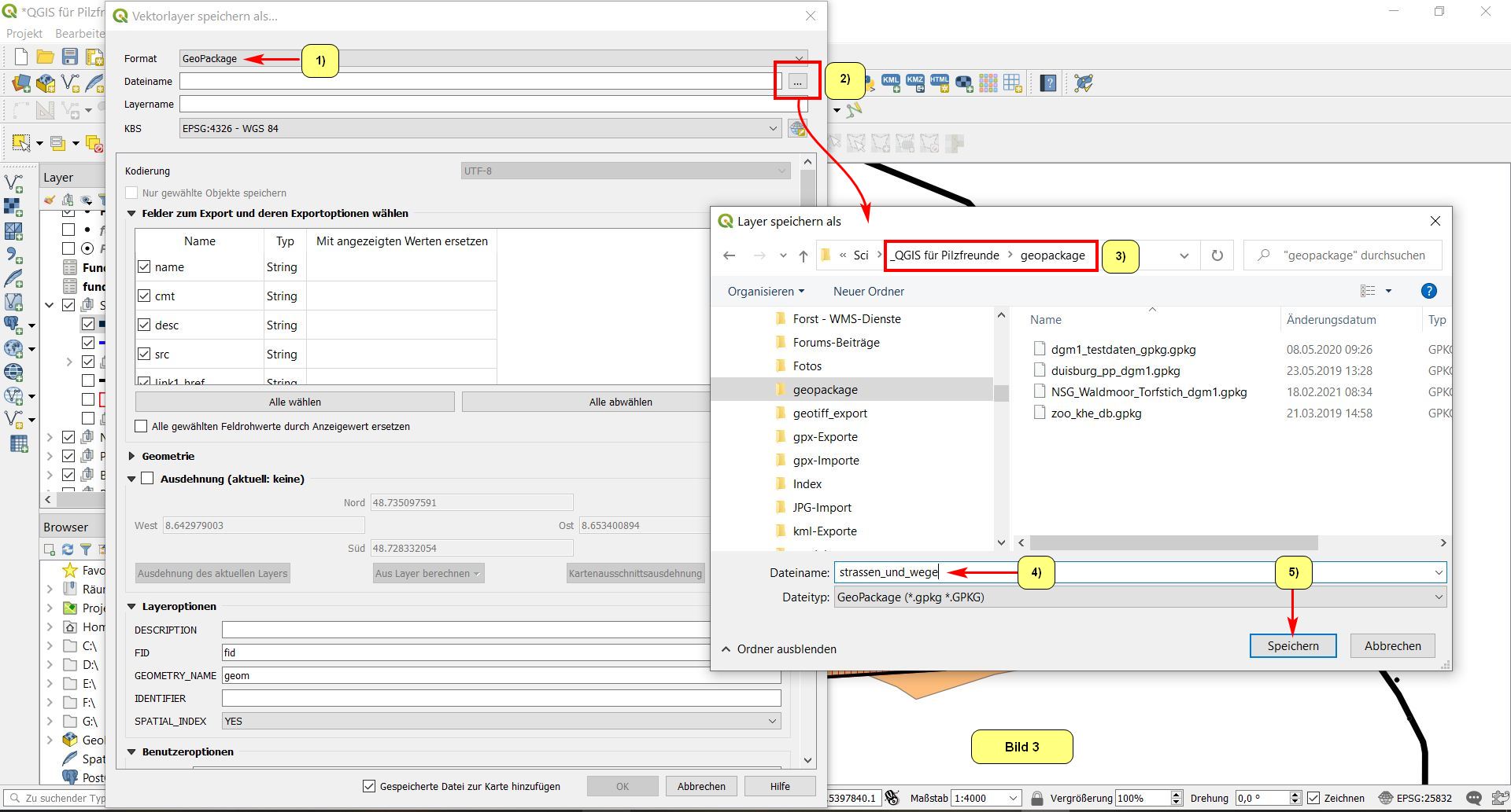 tragen als passenden Geopackage-Namen strassen_und_wege ein (4) und bestätigen mit Speichern (5):