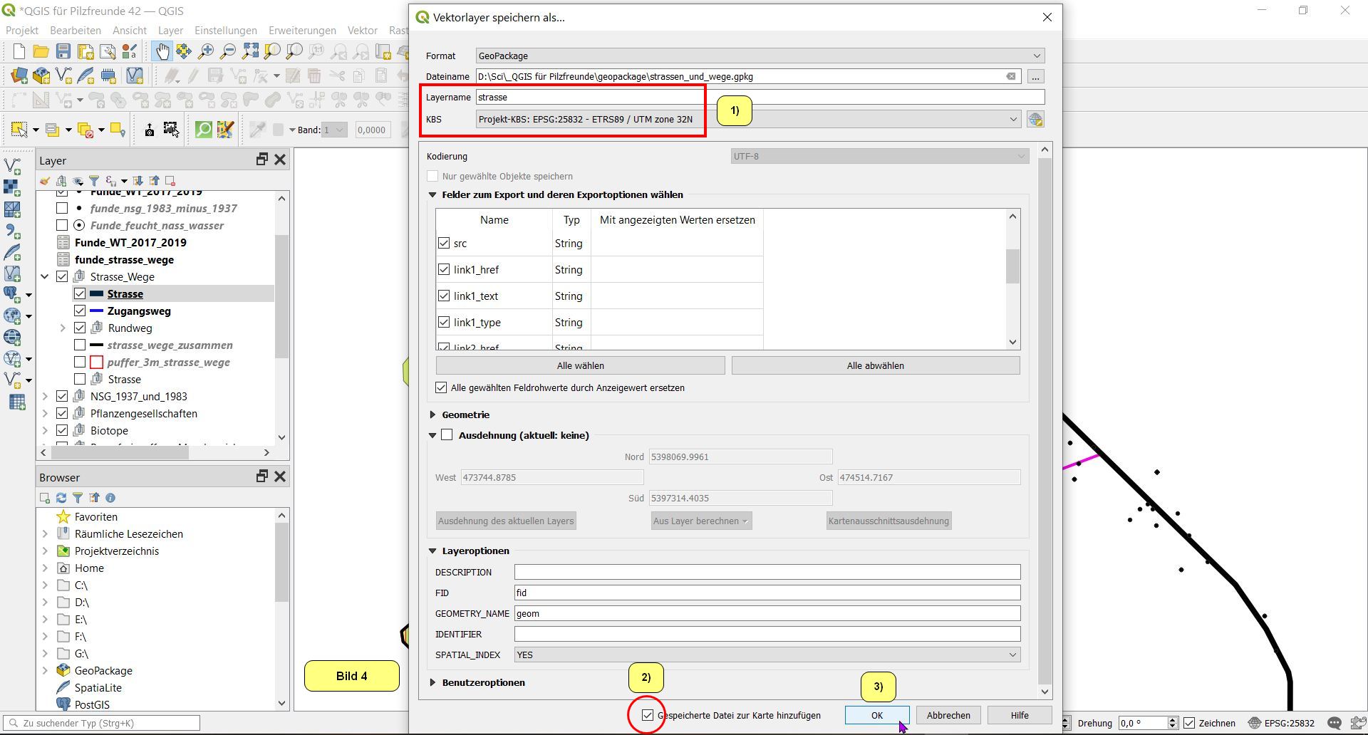 Im sich öffnenden Fenster manövrieren wir zu dem für Geopackages von uns vorgesehenen Ordner (3),