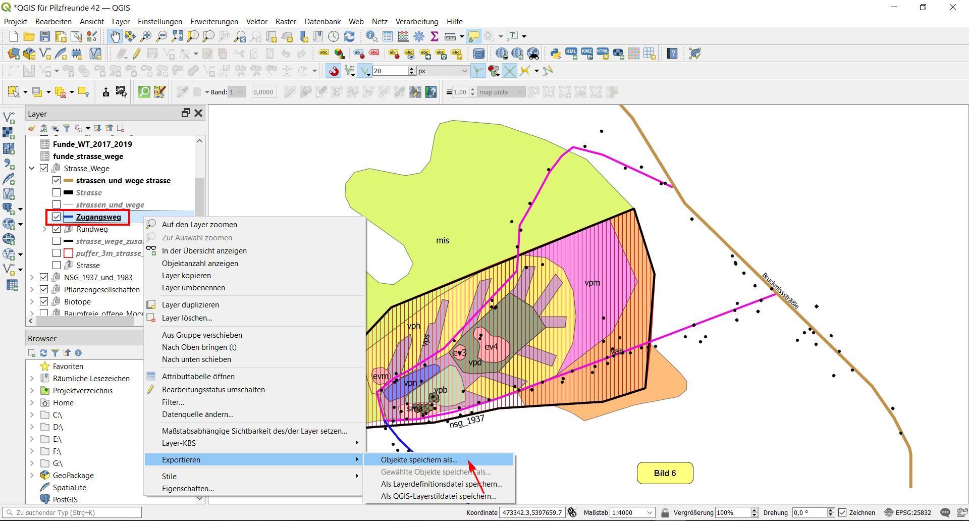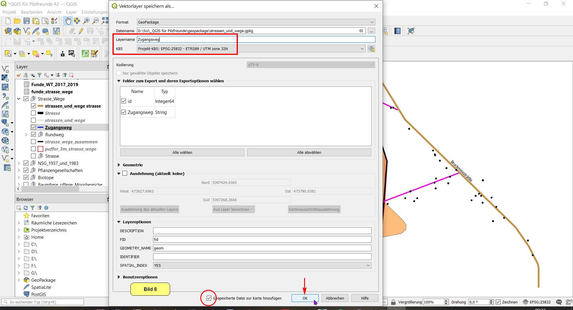 Wir gehen dabei entsprechend dem oben beschriebenen Layer-Export vor. Allerdings ist das vorgesehene Geopackage bereits vorhanden und wir müssen es gemäß 7 (4) lediglich selektieren. Die Bilder 6 bis 8 zeigen das Vorgehen für den Layer zugangsweg: