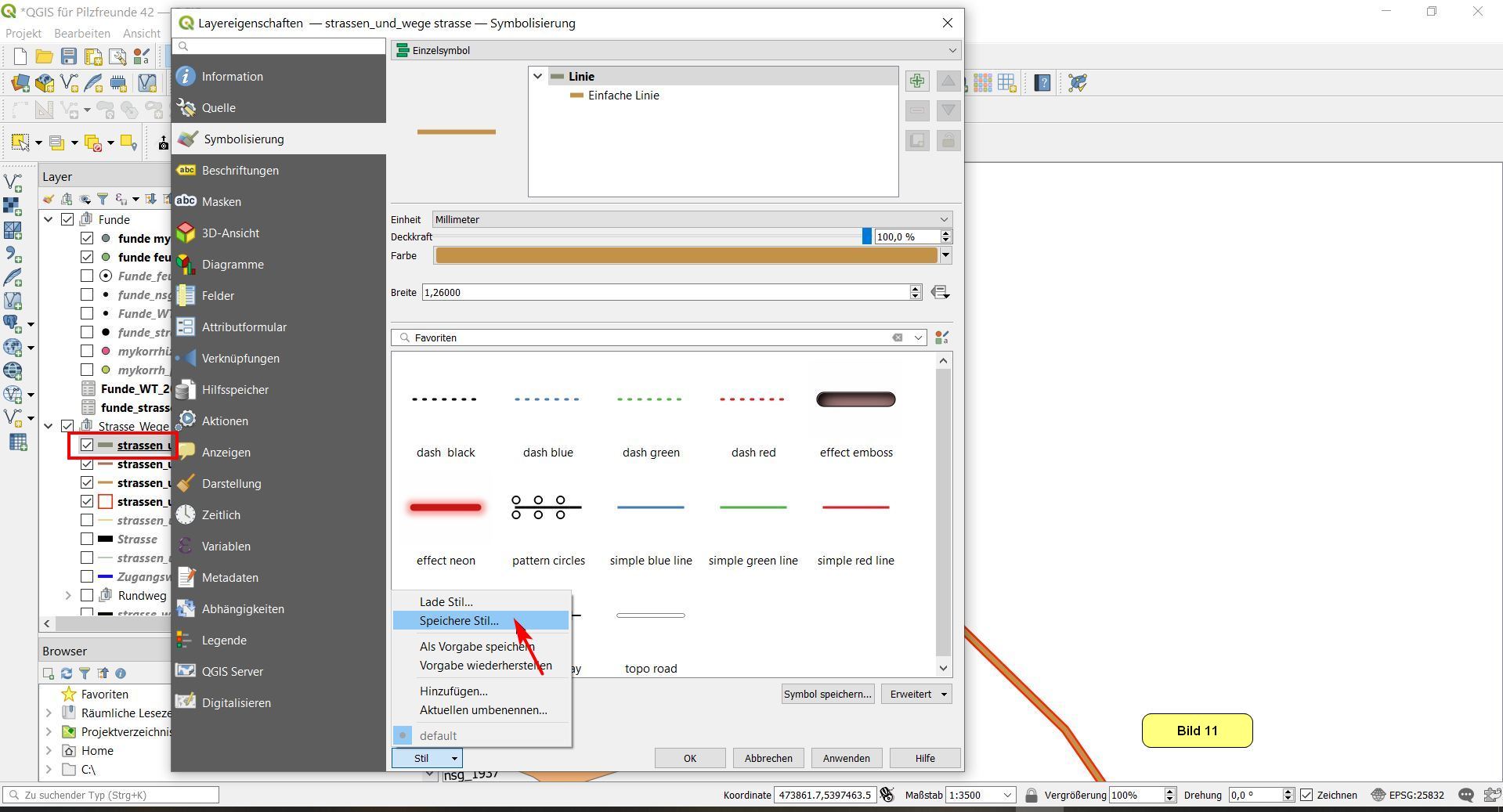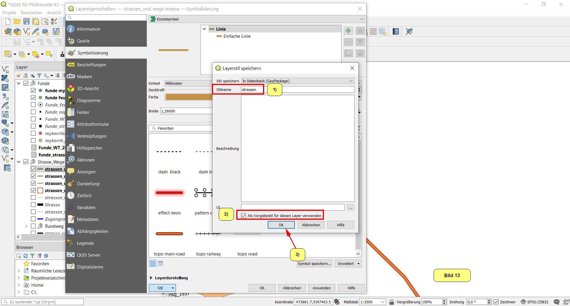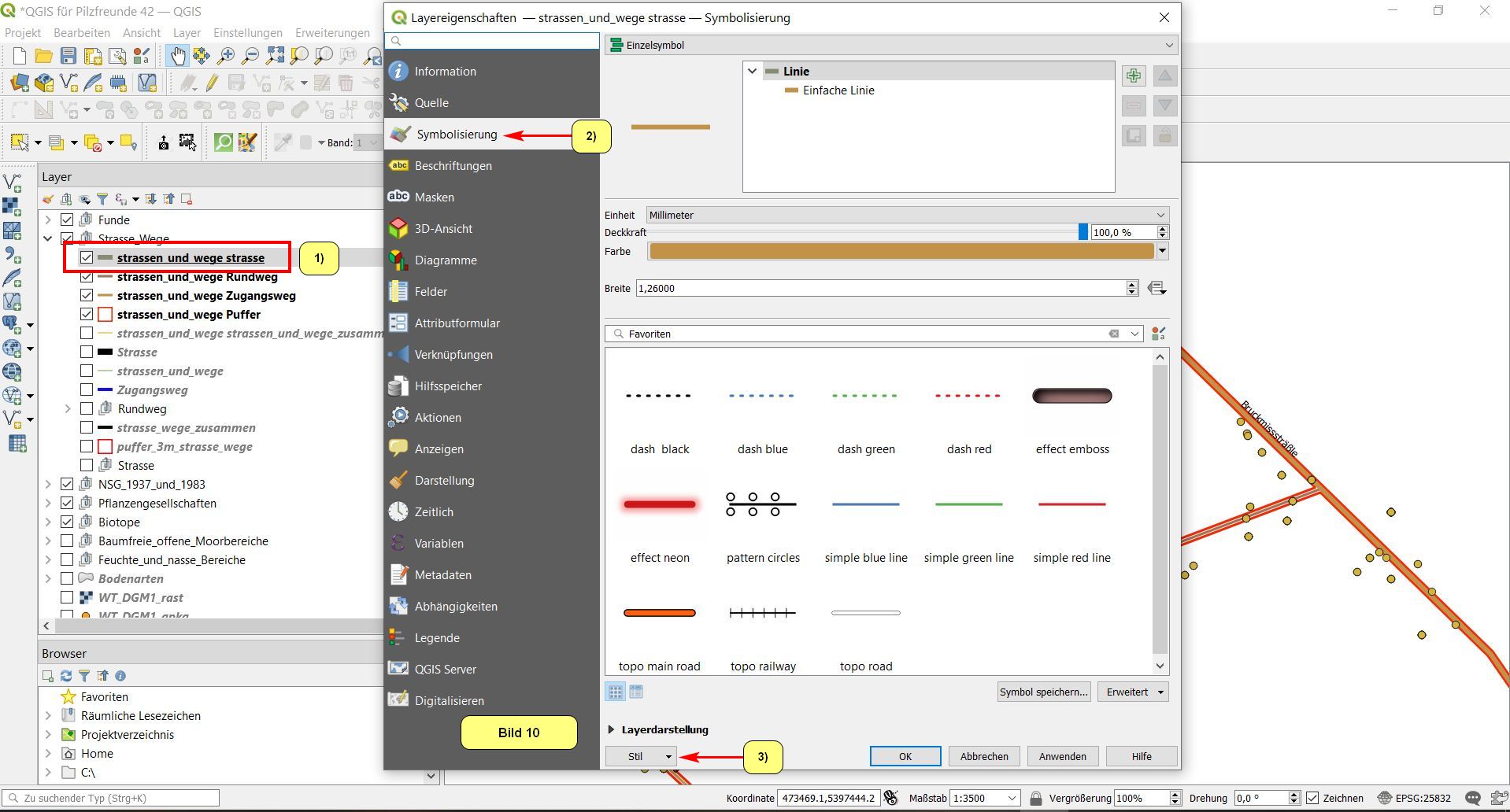 Im Layereigenschaften-Menü manövriert man zum Untermenü Symbolisierung (2) und klappt unten Stil auf (3):