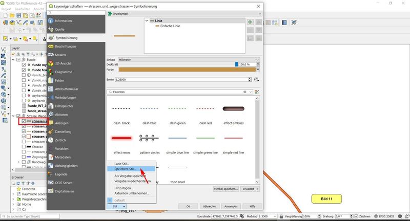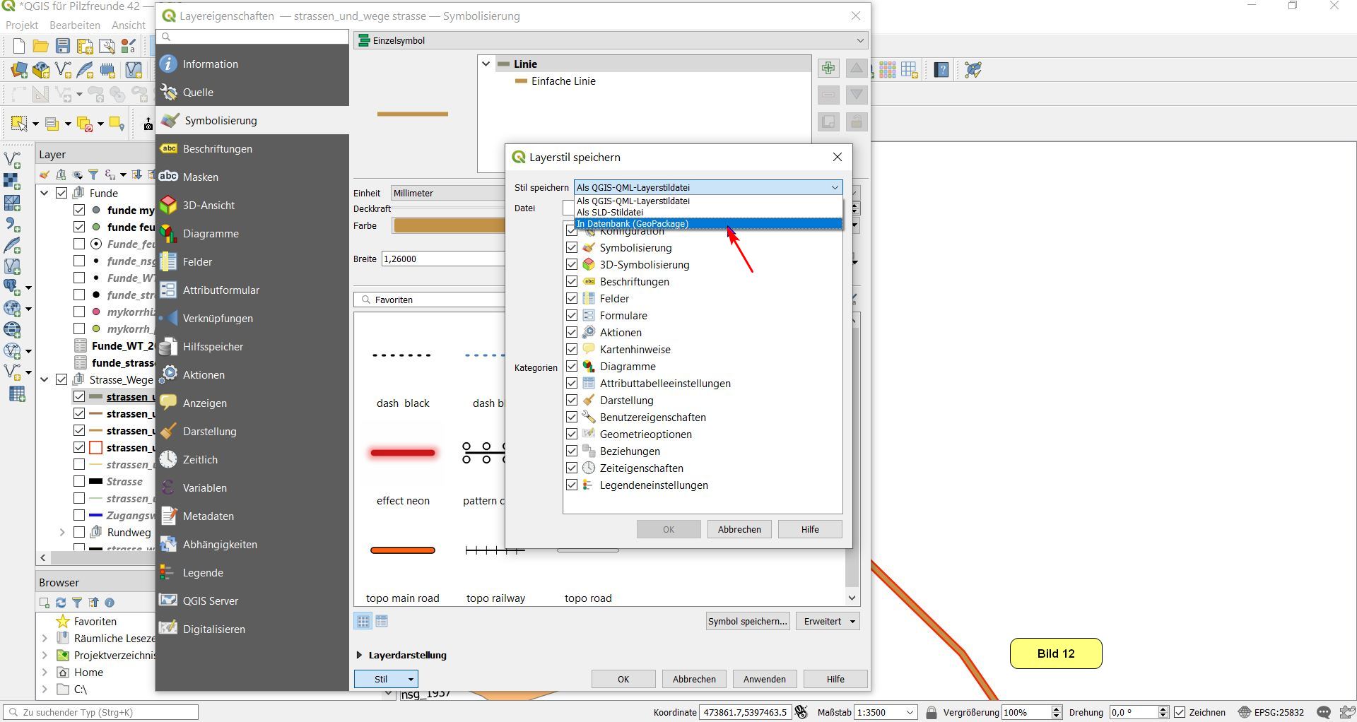 Will man den Stil eines Geopackage-Layers vorgeben, damit er bei seinem erstmaligen Öffnen genau in diesem Stil (Farbe, Liniendicke, Beschriftung etc.) angezeigt wird, geht man wie folgt vor (hier im Beispiel der Layer strasse![]()