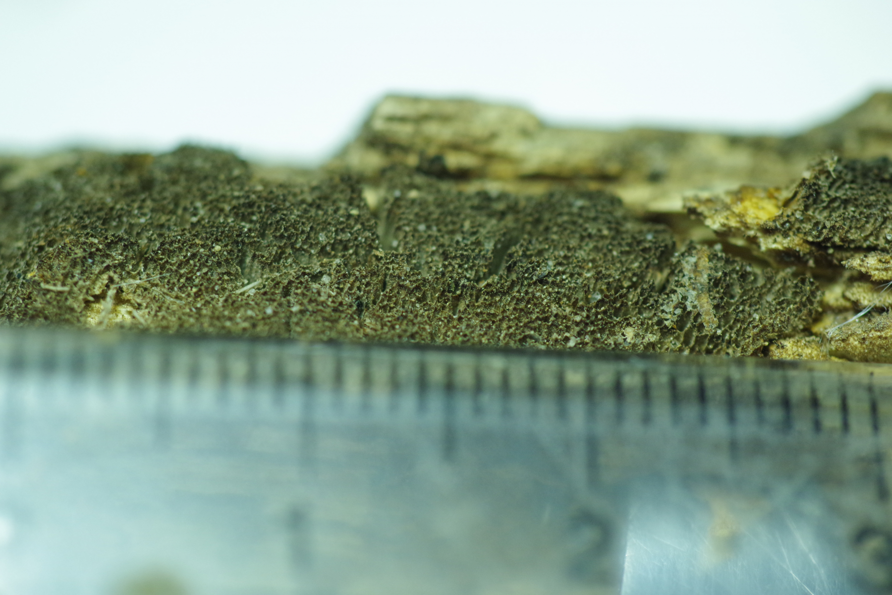 Keine Ahnung wie der farblich in frisch aussieht. Mein Verdacht geht in Richtung Antrodia. Ziemlich kleine Poren ~3/mm. Keine (bleibende) Verfärbung mit KOH.