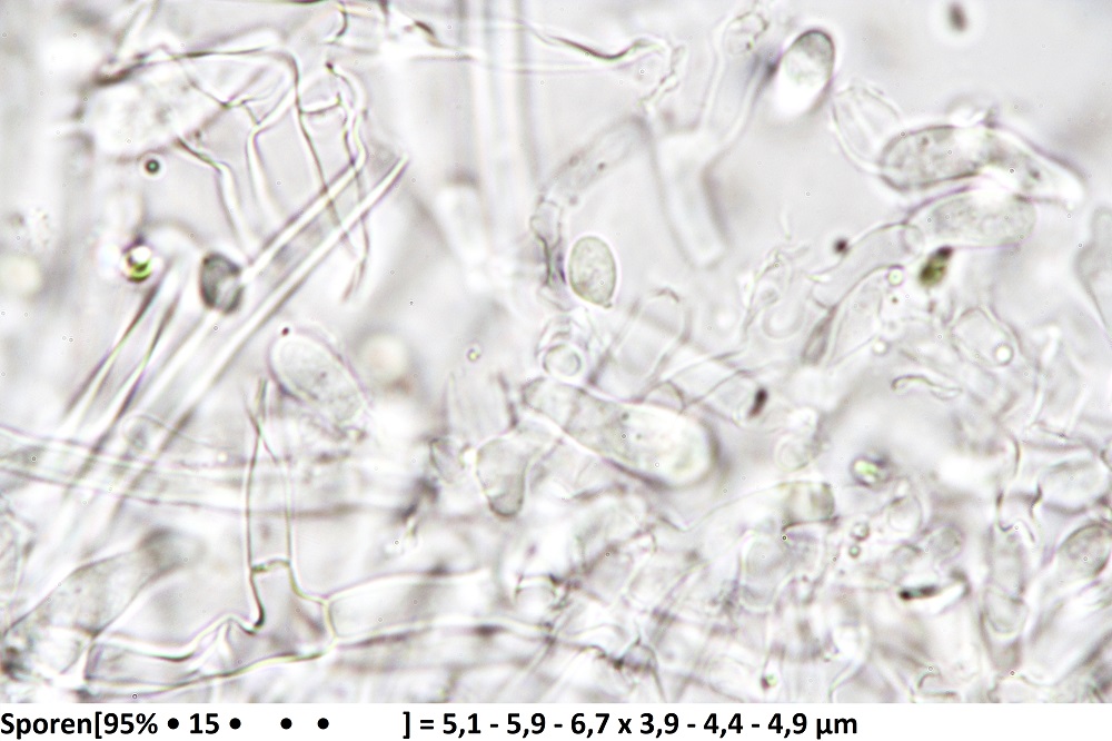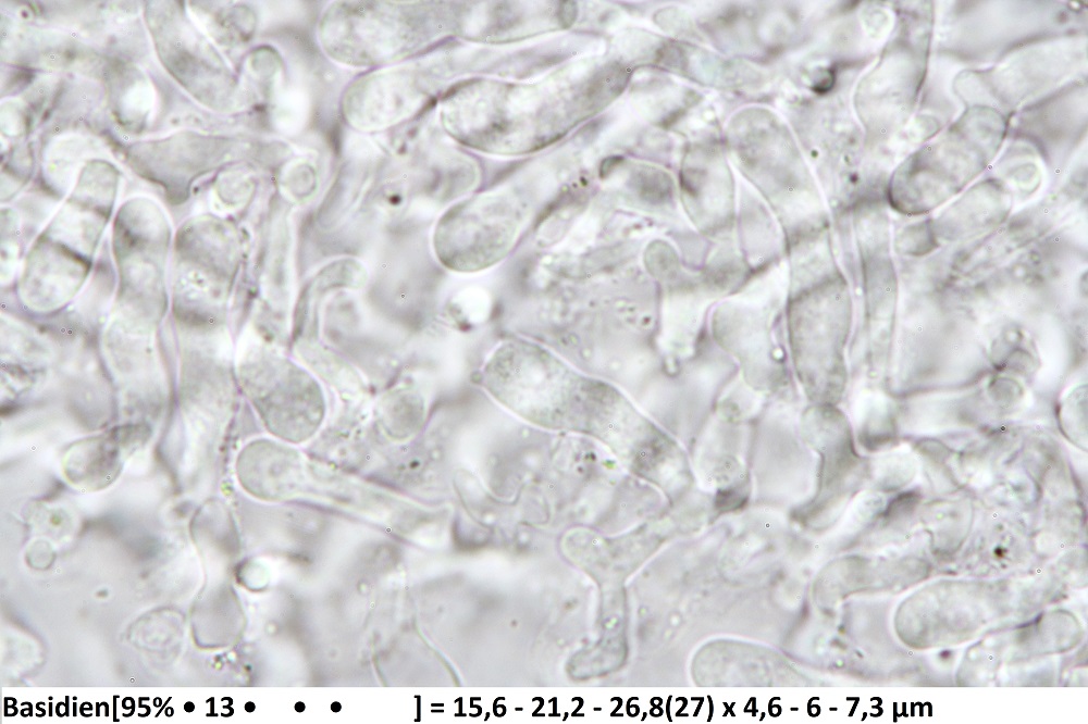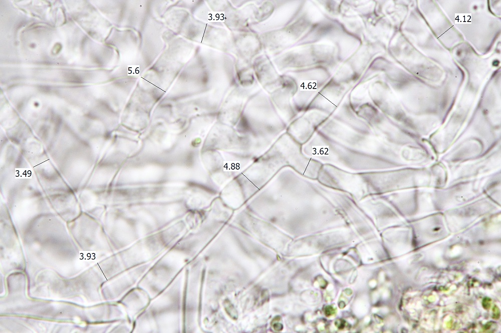 Wenn du die subbasidialen / hymenialen Hyphen messen willst, dann am besten die (1-3) Zellen direkt unter den Basidien. Die geraden, längeren und noch lockerer verknüpften Hyphen (wo sich dann auch teilweise Schnallen finden) liegen hier ja kaum dre oder vier Zellschichten tiefer, das kann dann schon eine Herausforderung sein, die richtigen Hyphen zu vermessen.
