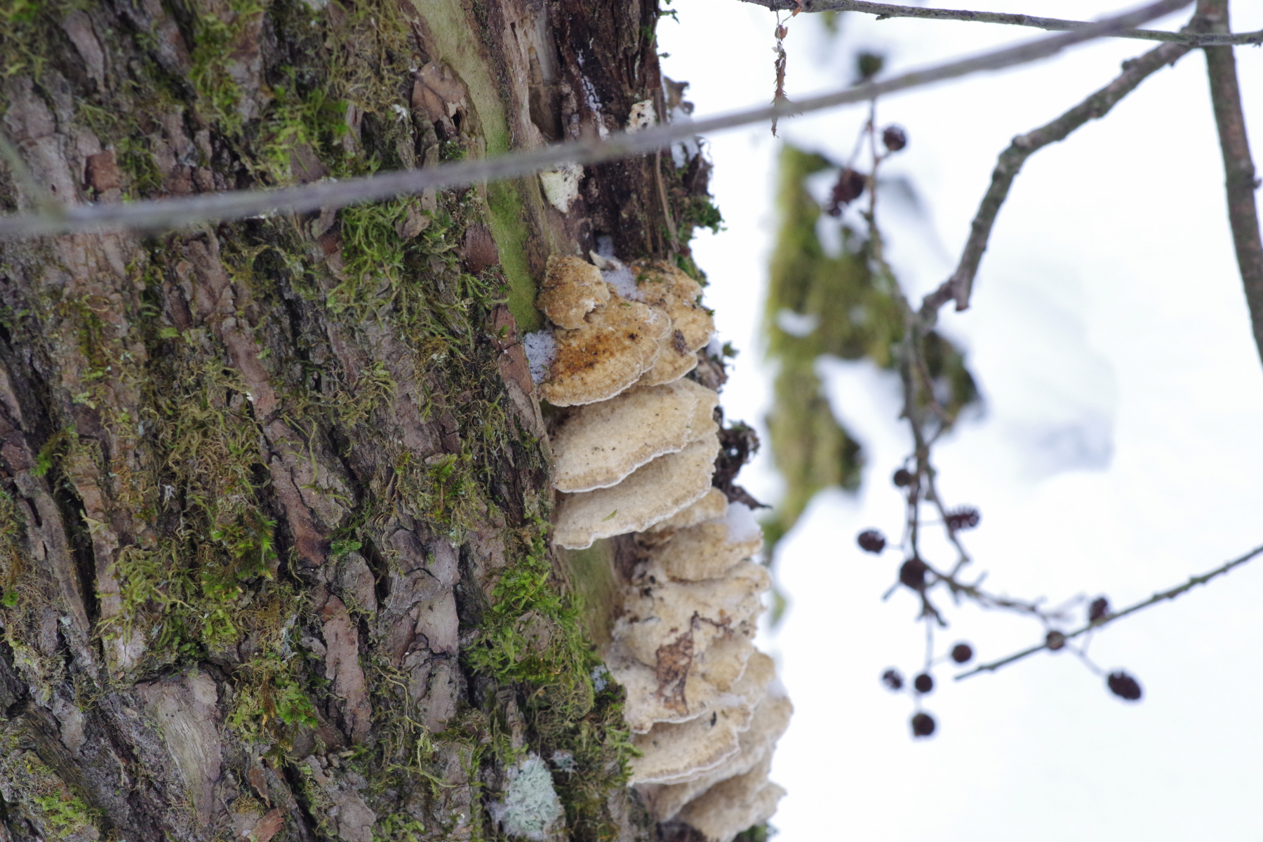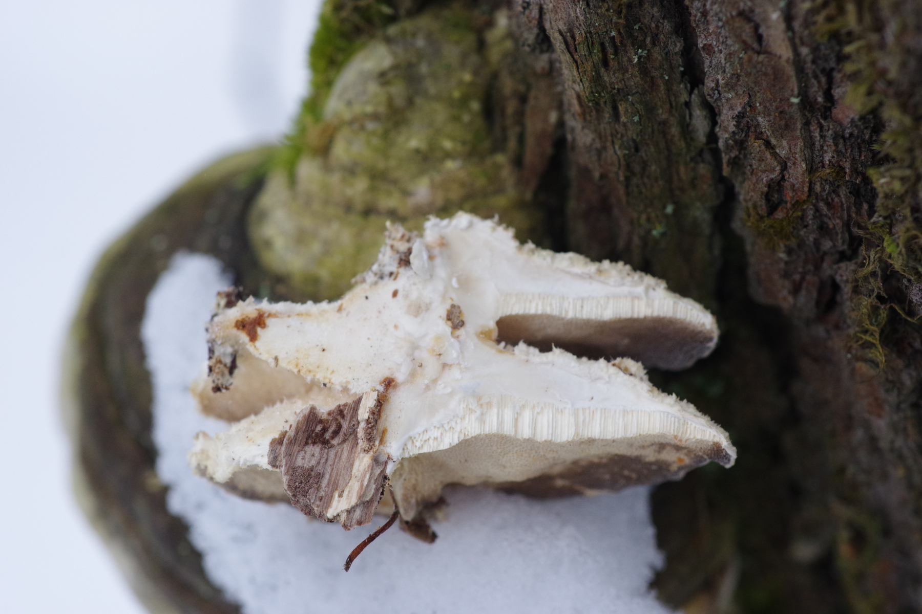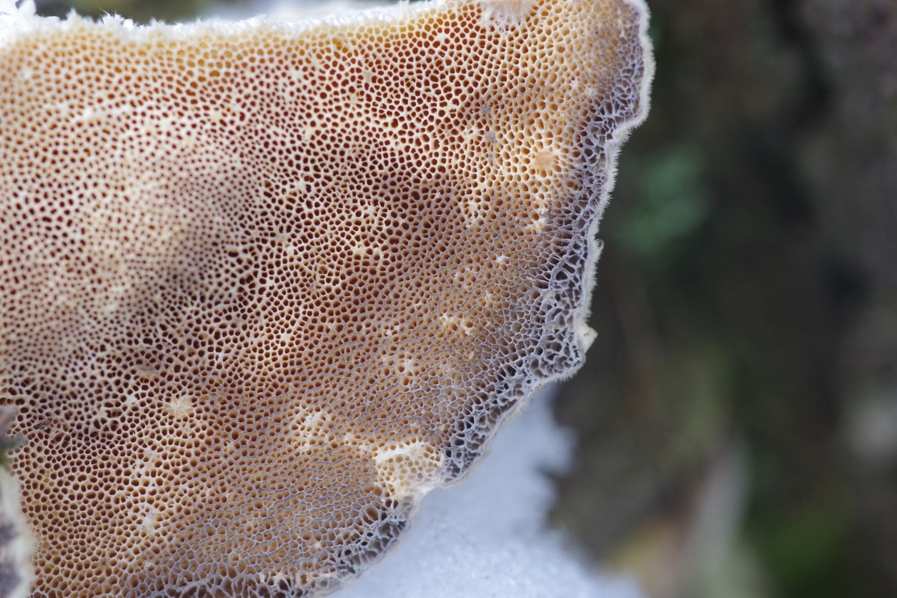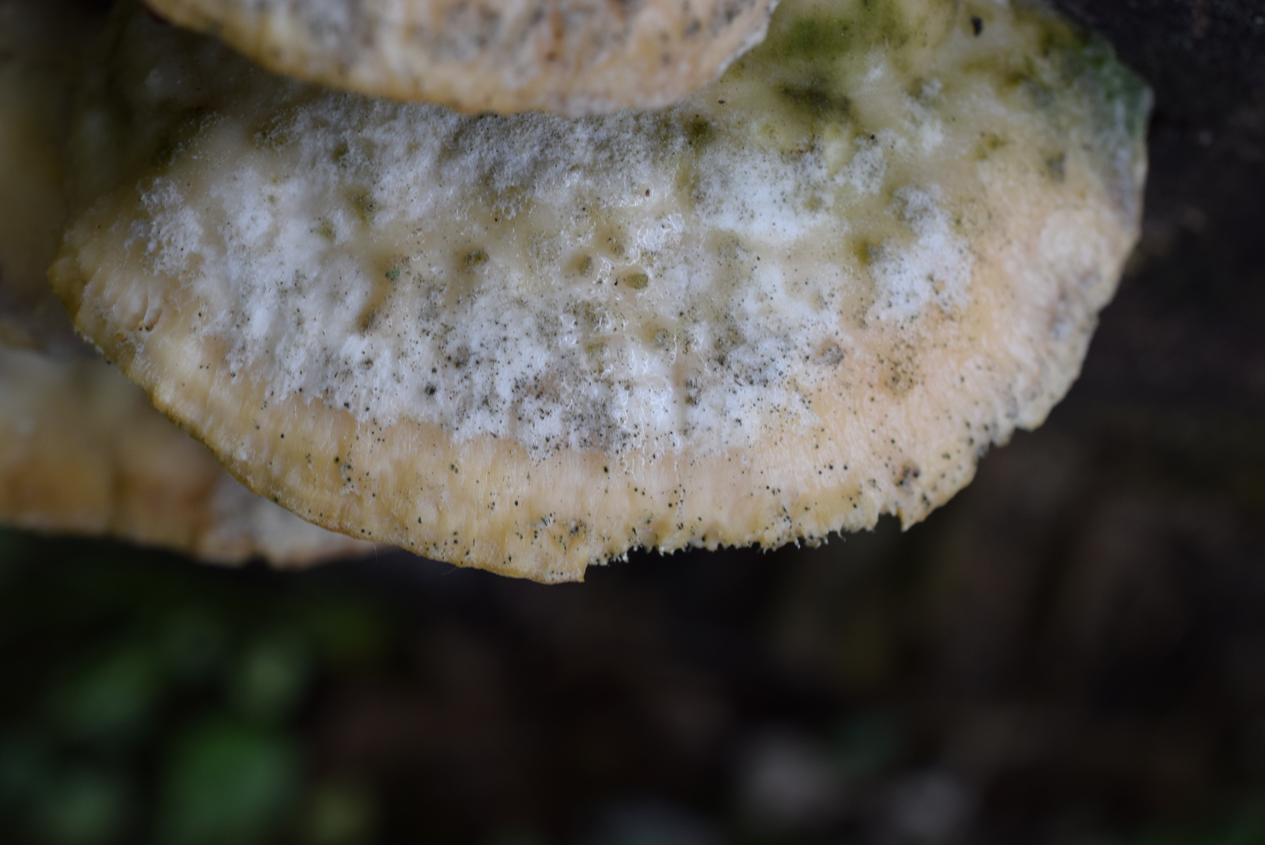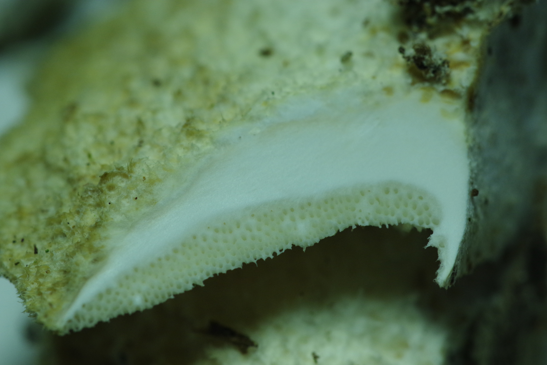 Dieser Pilz von heute wuchs an einen dicken Weidenstumpf, vermutlich S. fragilis, zusammen mit Zunderschwamm auf der anderen Stammseite. Ich würde ja Trametes suaveolens in Betracht ziehen, kann aber nicht die Spur von Anisgeruch wahrnehmen, Geruch ist da, schwach und unspezifisch pilzig. Also vielleicht irgendwas aus der Ecke der Saftporlinge?
