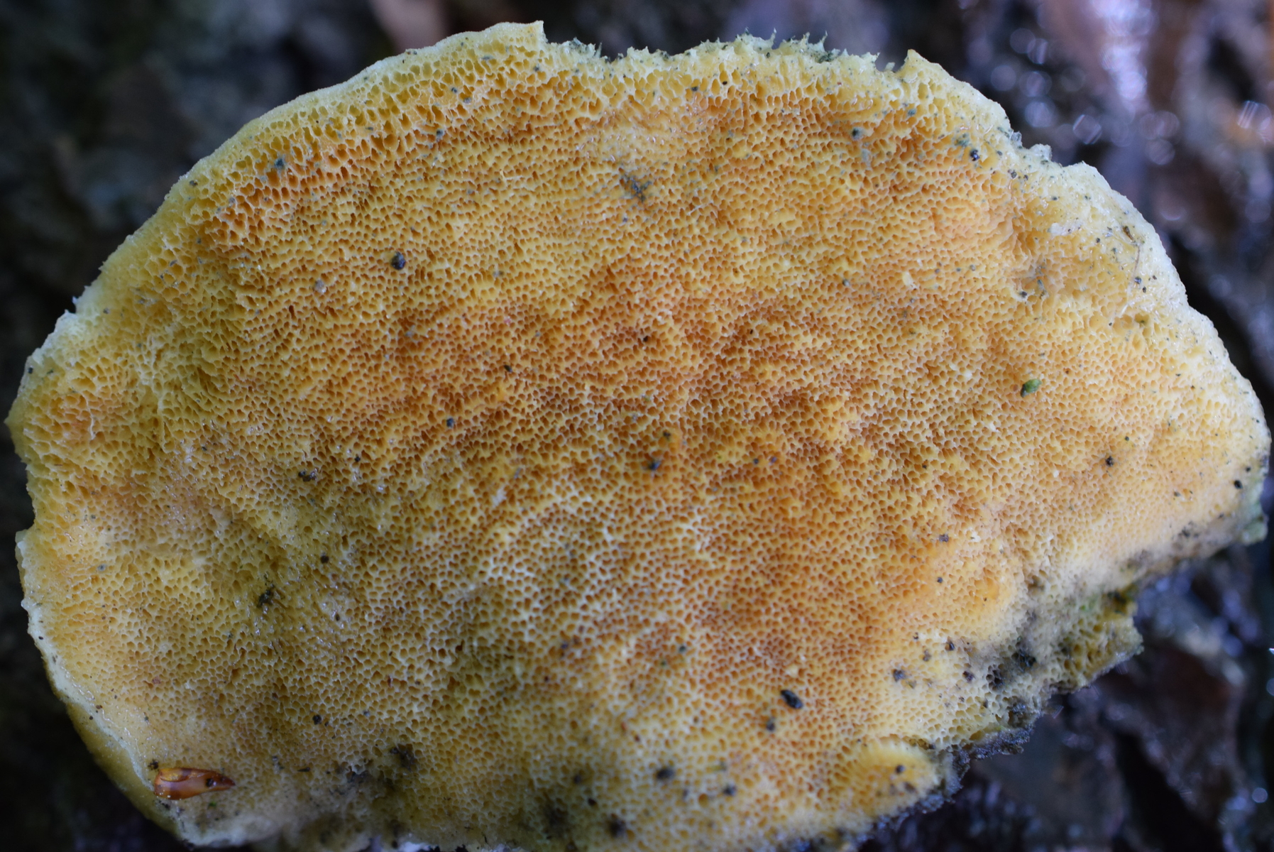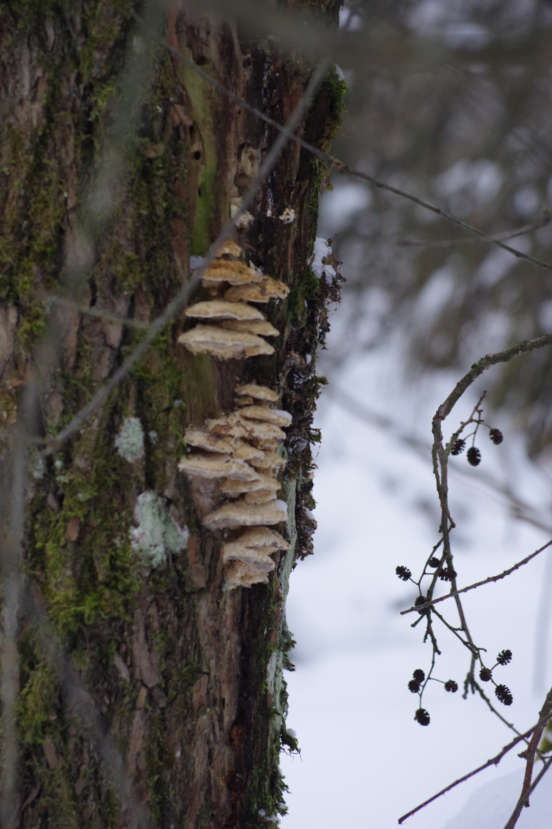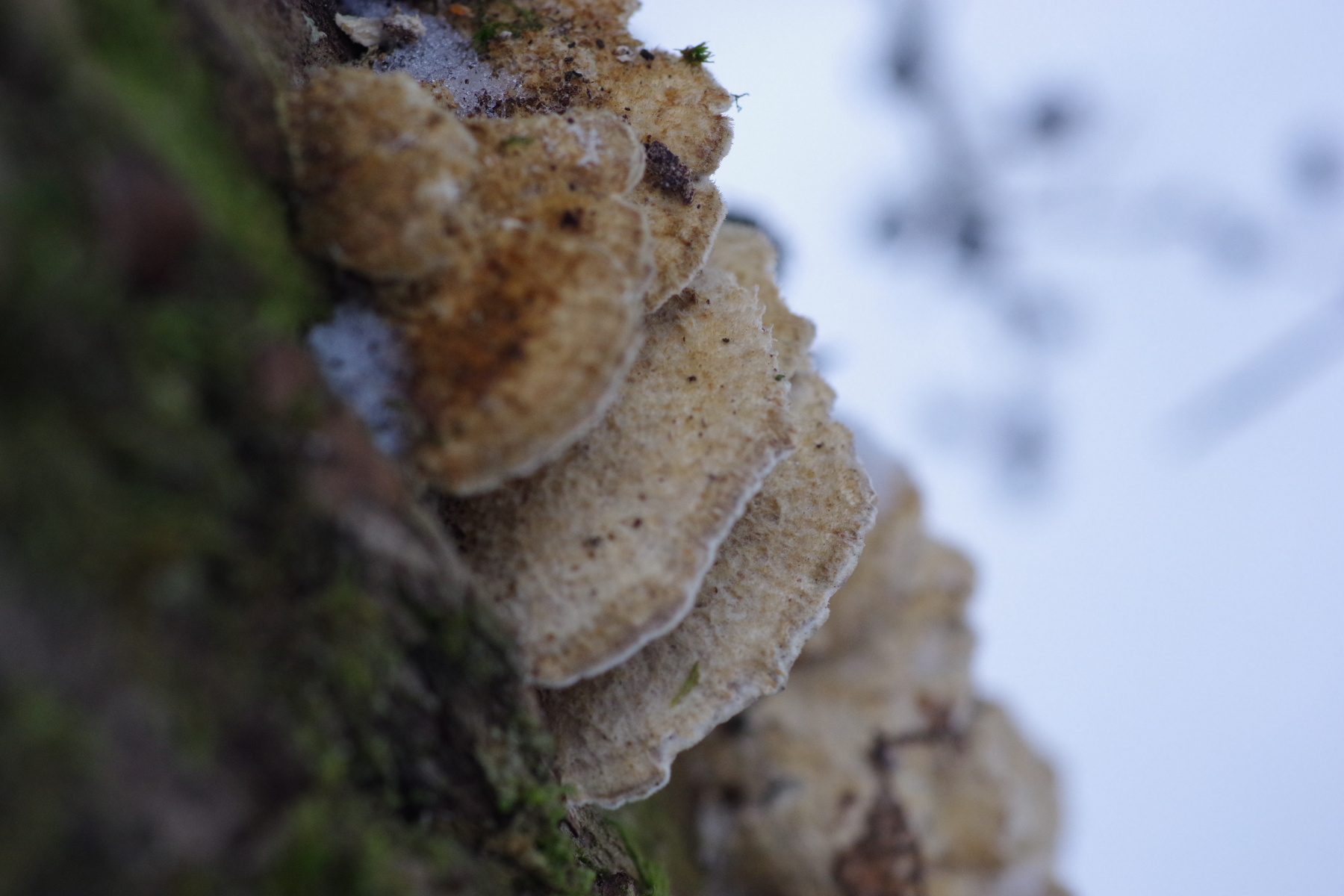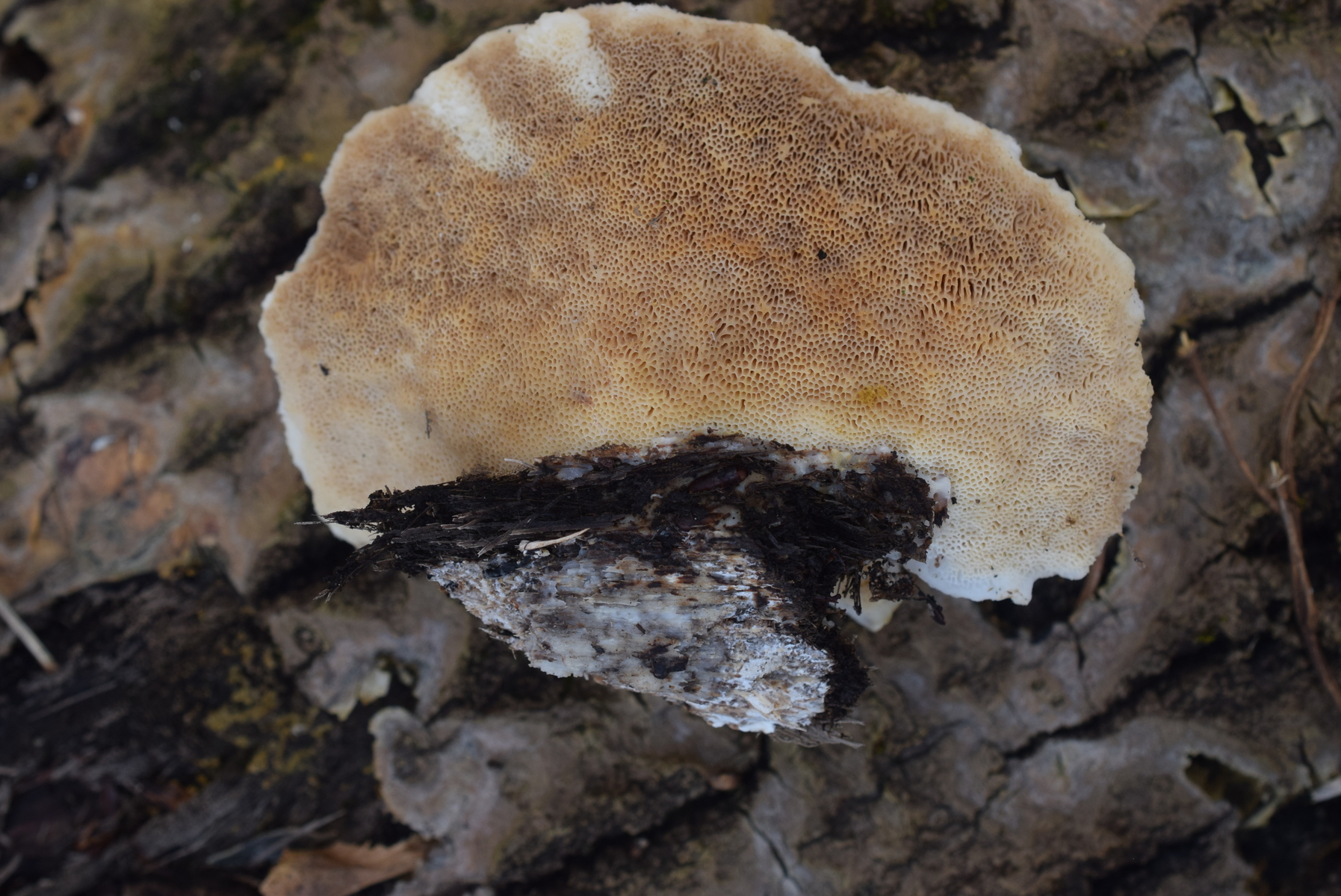 Dieser Pilz von heute wuchs an einen dicken Weidenstumpf, vermutlich S. fragilis, zusammen mit Zunderschwamm auf der anderen Stammseite. Ich würde ja Trametes suaveolens in Betracht ziehen, kann aber nicht die Spur von Anisgeruch wahrnehmen, Geruch ist da, schwach und unspezifisch pilzig. Also vielleicht irgendwas aus der Ecke der Saftporlinge?
