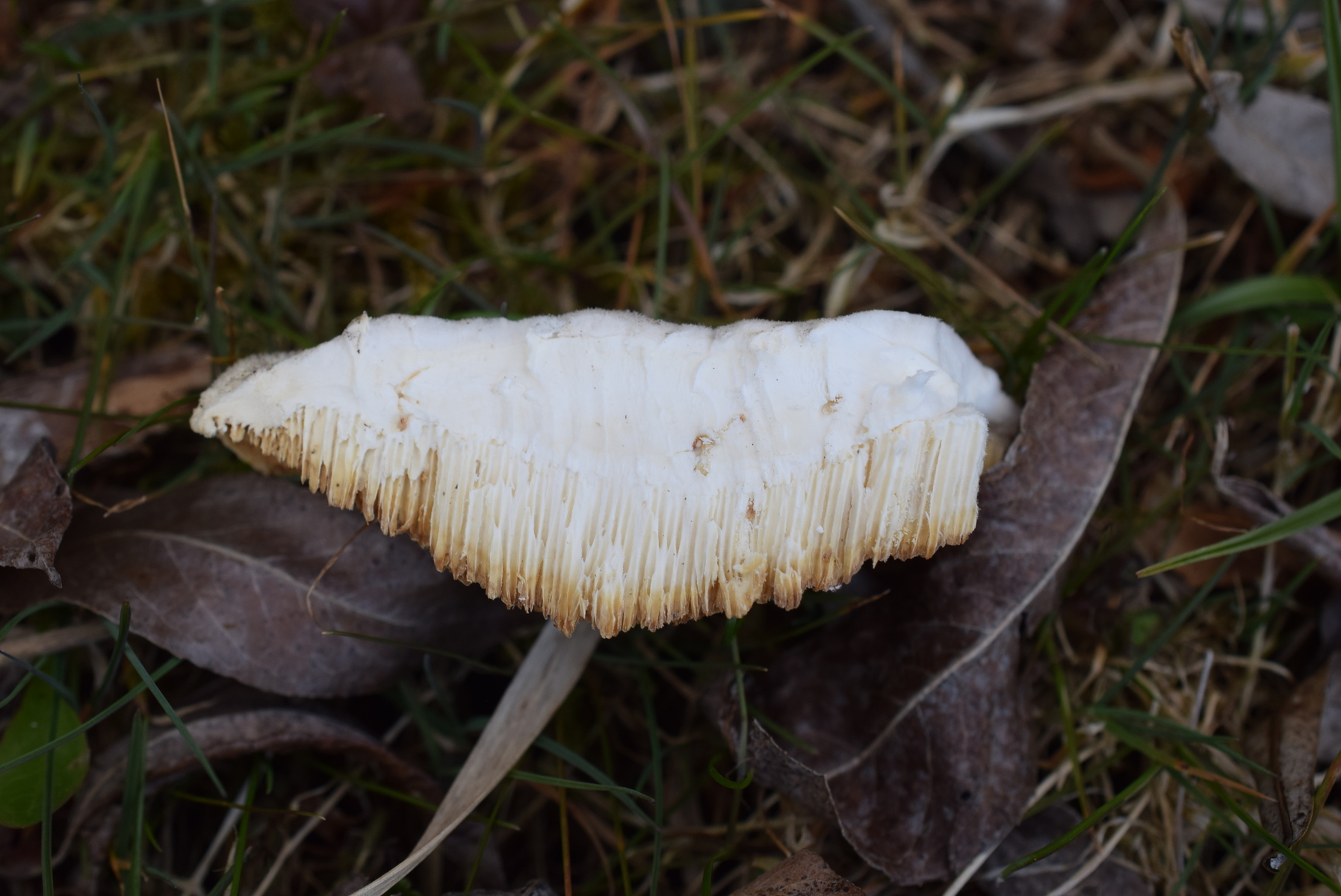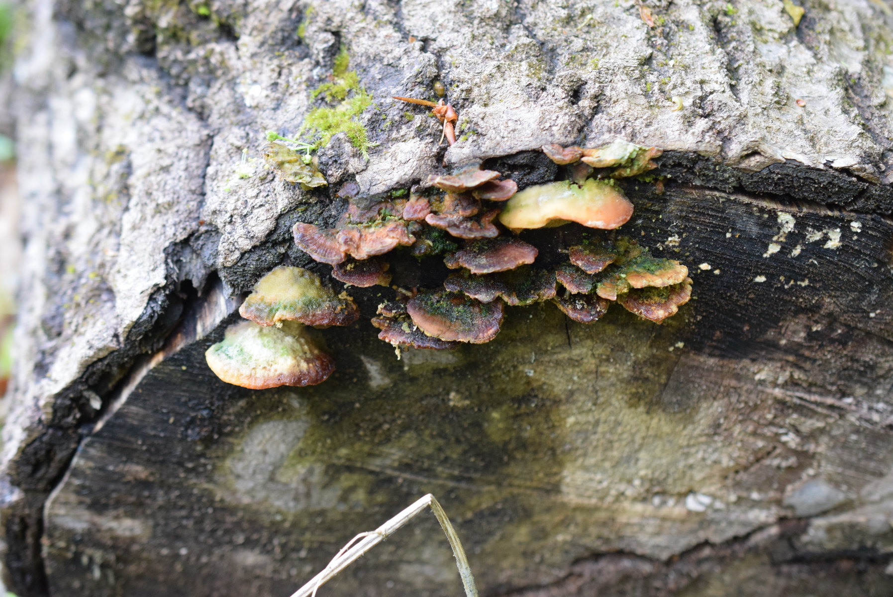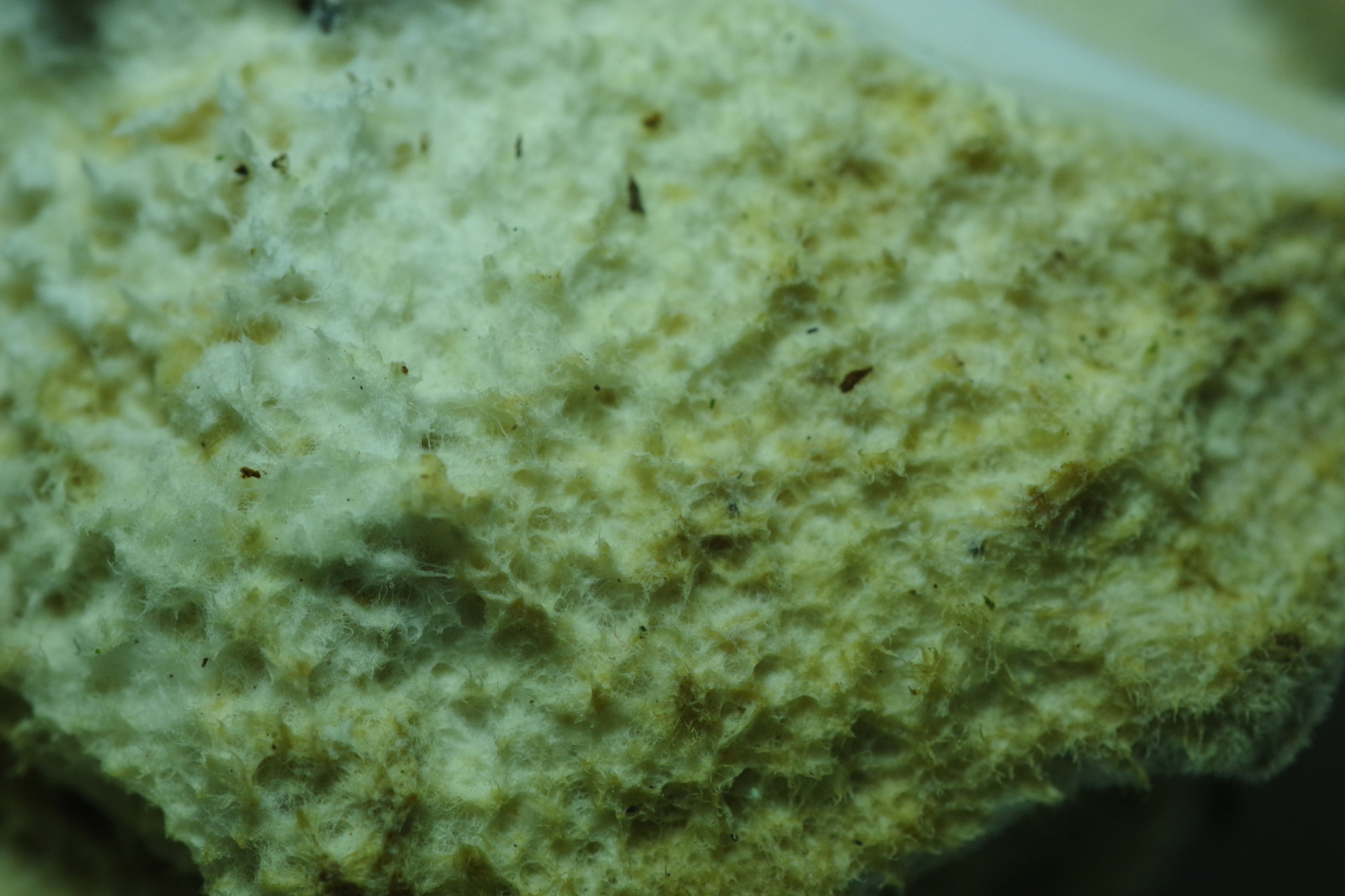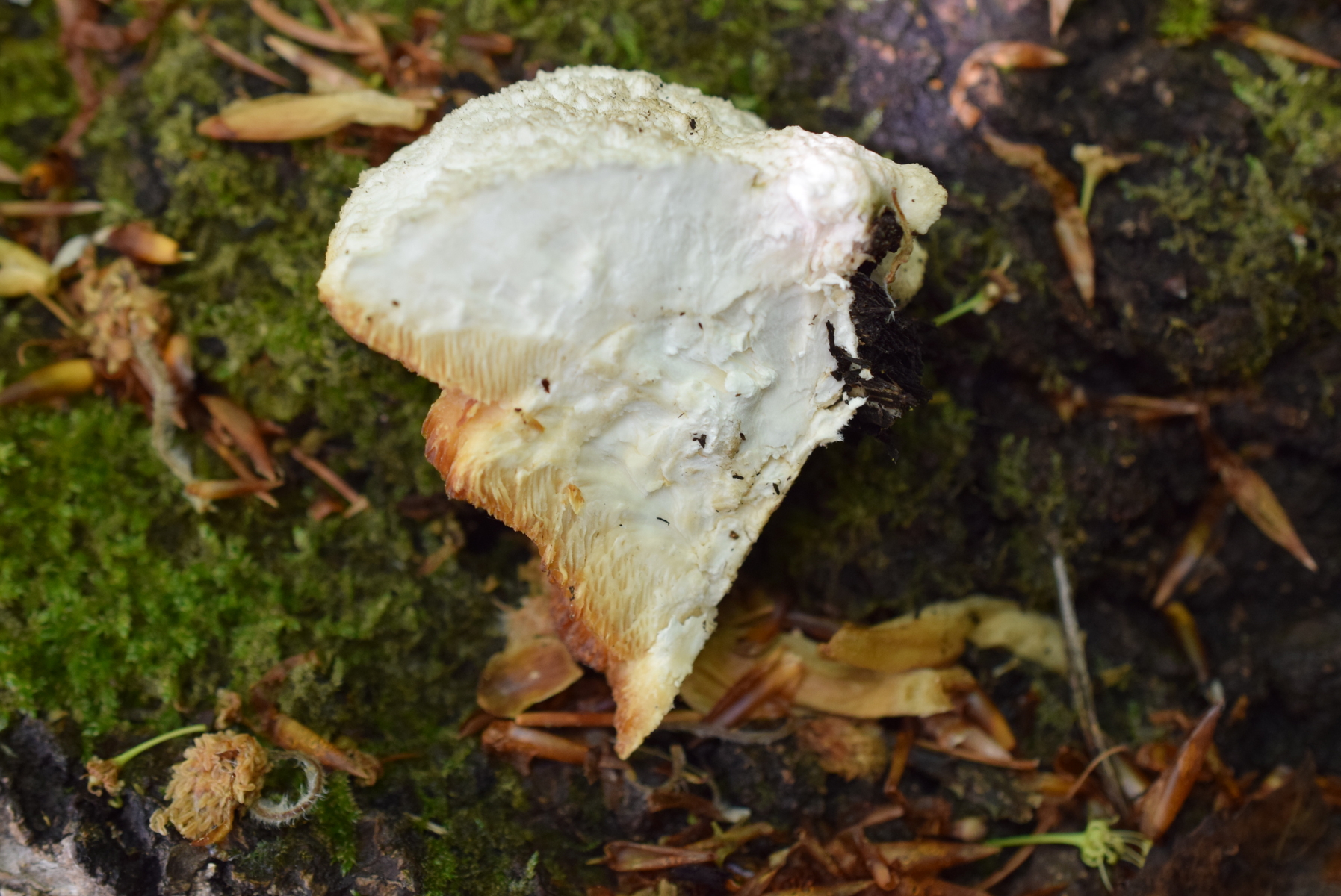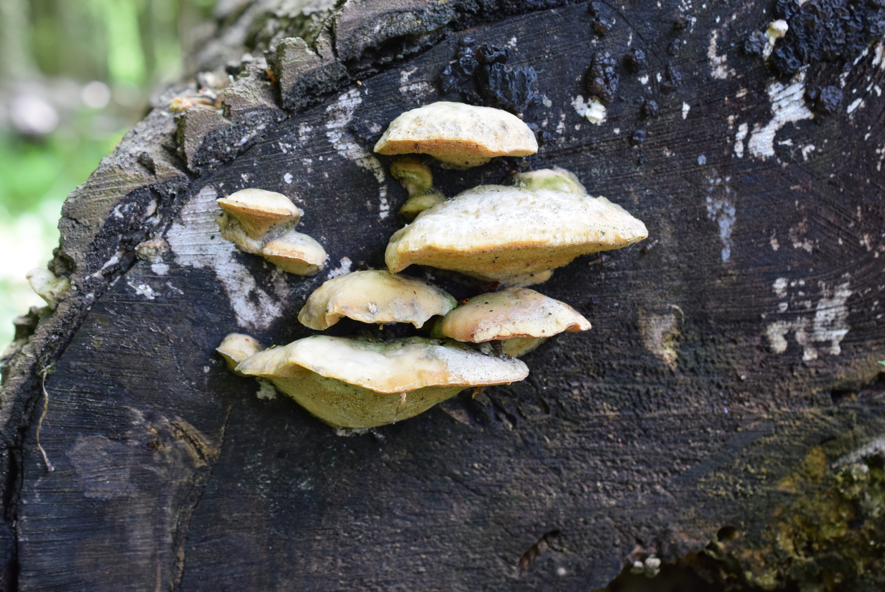 Dieser Pilz von heute wuchs an einen dicken Weidenstumpf, vermutlich S. fragilis, zusammen mit Zunderschwamm auf der anderen Stammseite. Ich würde ja Trametes suaveolens in Betracht ziehen, kann aber nicht die Spur von Anisgeruch wahrnehmen, Geruch ist da, schwach und unspezifisch pilzig. Also vielleicht irgendwas aus der Ecke der Saftporlinge?