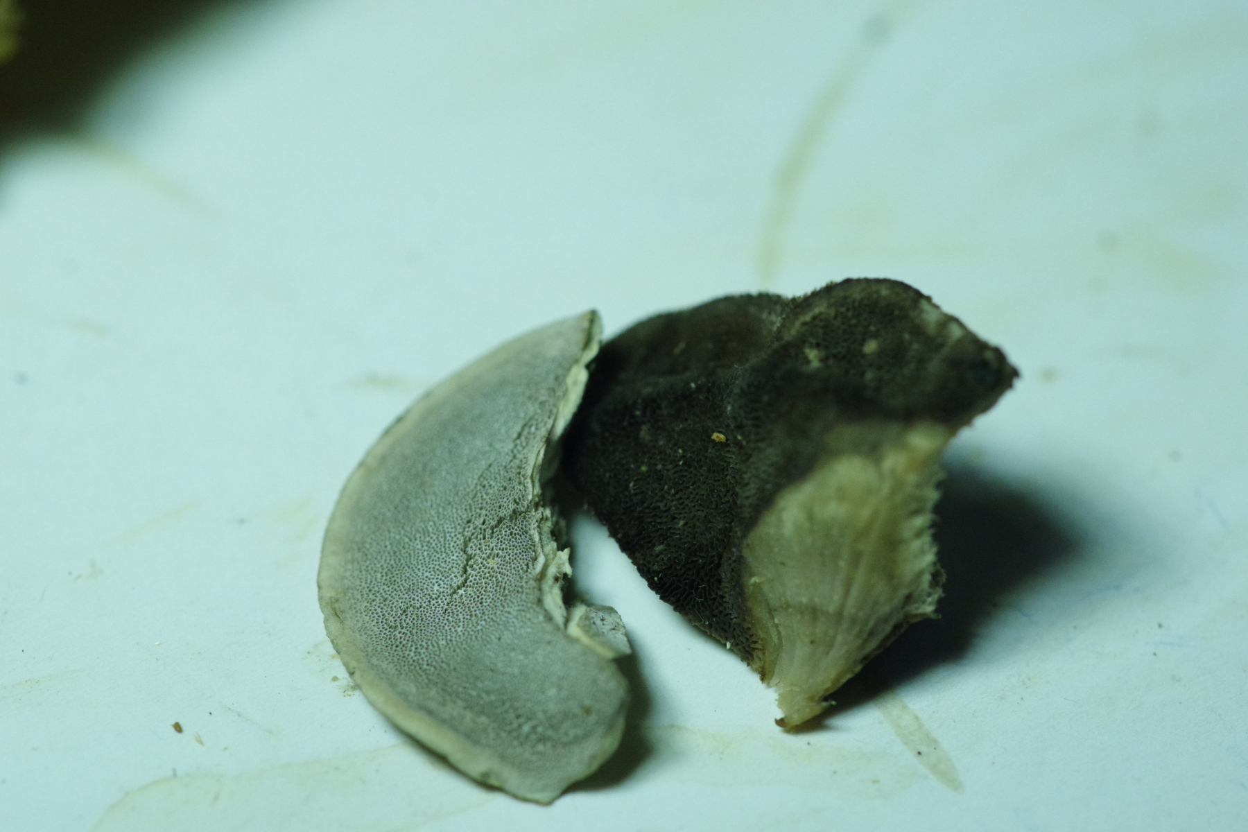 aber deutlich fleischiger als B. adusta (getrocknet), gröbere und andere Poren, die zudem auf fast schwarz nachgedunkelt sind. Die Trama teilweise auch ins Graue nachgedunkelt. Hut filzig mit sehr kurzen Haaren