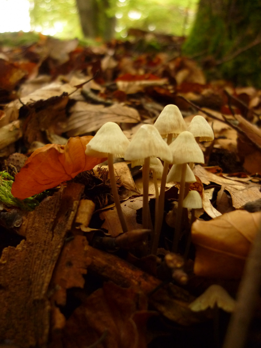 6 ist Mycena flavescens, eine ganz häufige Art im Buchenlaub mit dem typischen Gelbstich in den Lamellen.