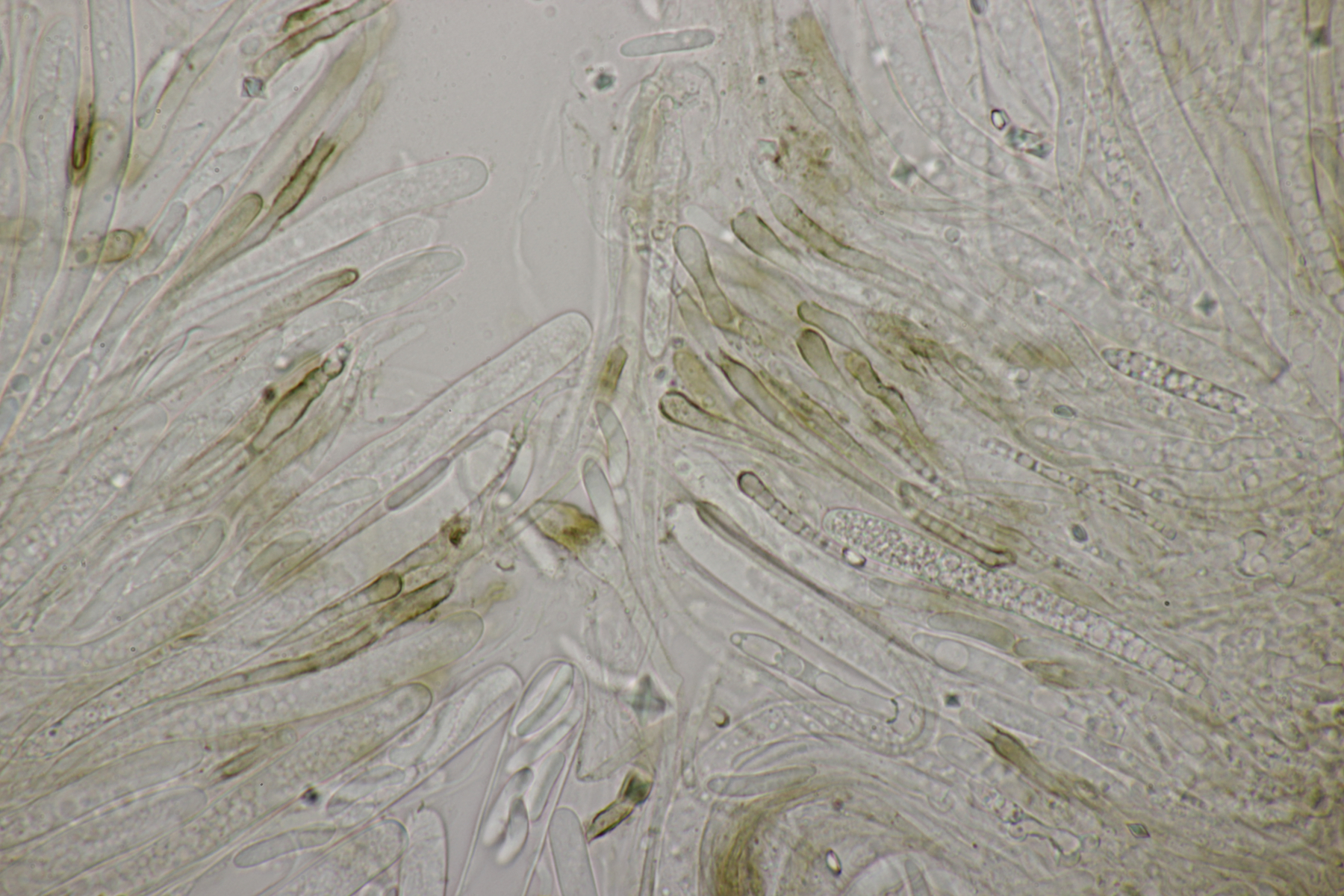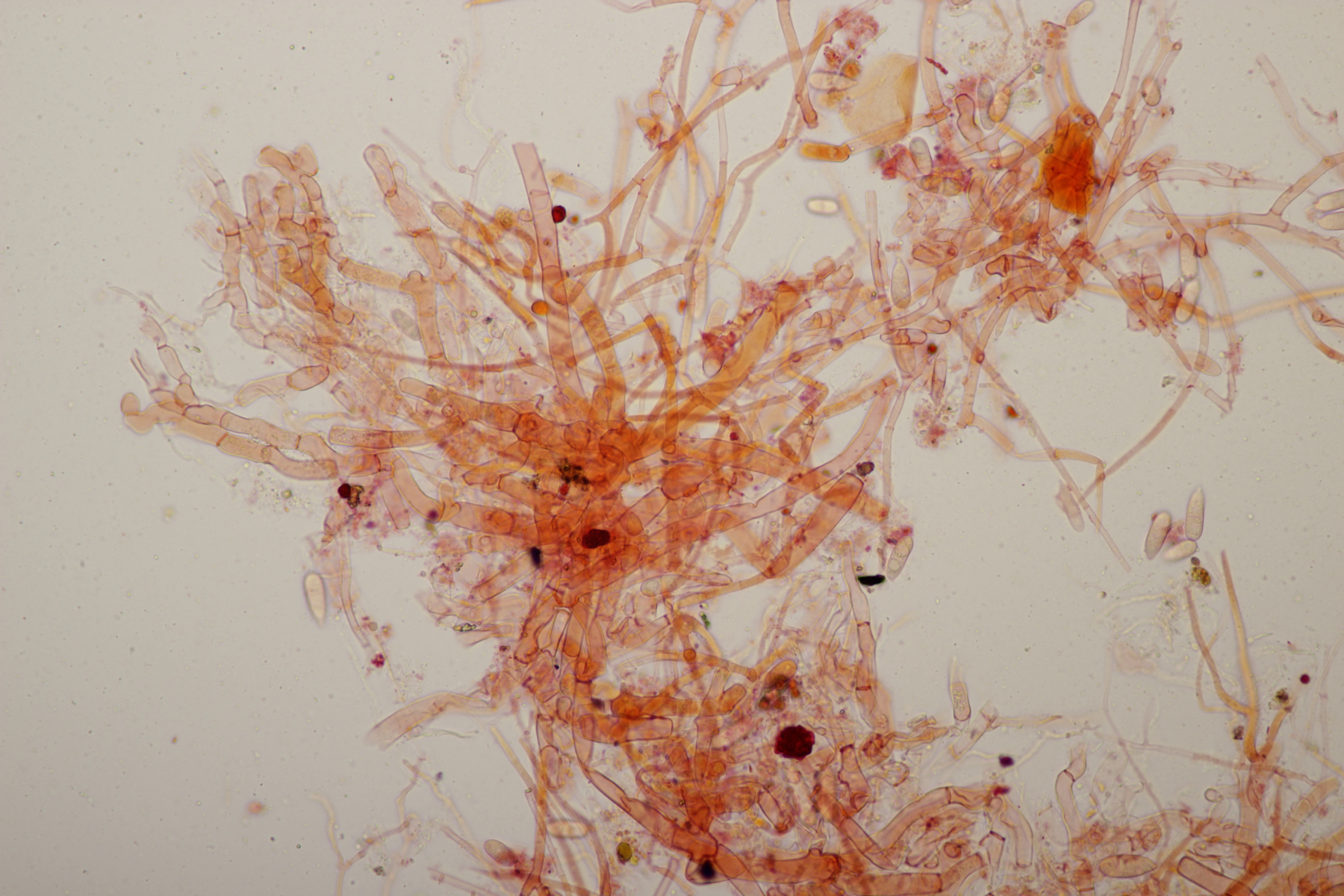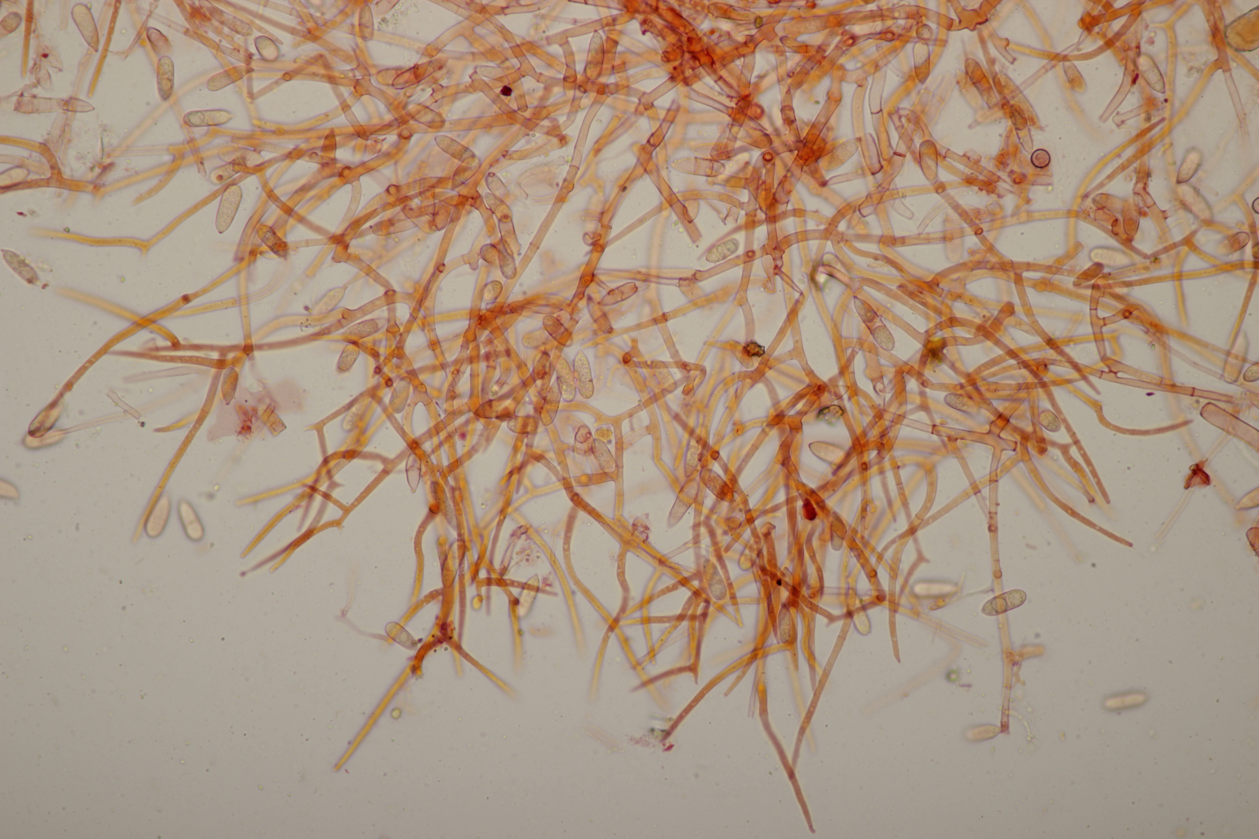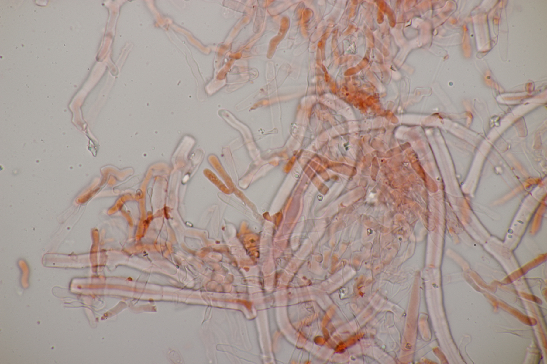 sieht sehr gut aus. Ja, ganz typisch für Phanerochaete sordida - es geht kreuz und quer ohne Vorzugsrichtung. Jetzt sieht man auch gut die teilweise Inkrustation der Cystiden. Typisch sind übrigens auch Doppelschnallen an den Basalhyphen und in den Rhizomorphen. Finde ich ganz witzig, denn Schnallen fehlen ja eigentlich, aber ganz unten am Substrat sind dann ab und zu einzelne zu sehen, dann aber gleich als Doppelschnallen (nur als Zusatzinfo, ist jetzt hier nicht bestimmungsrelevant).