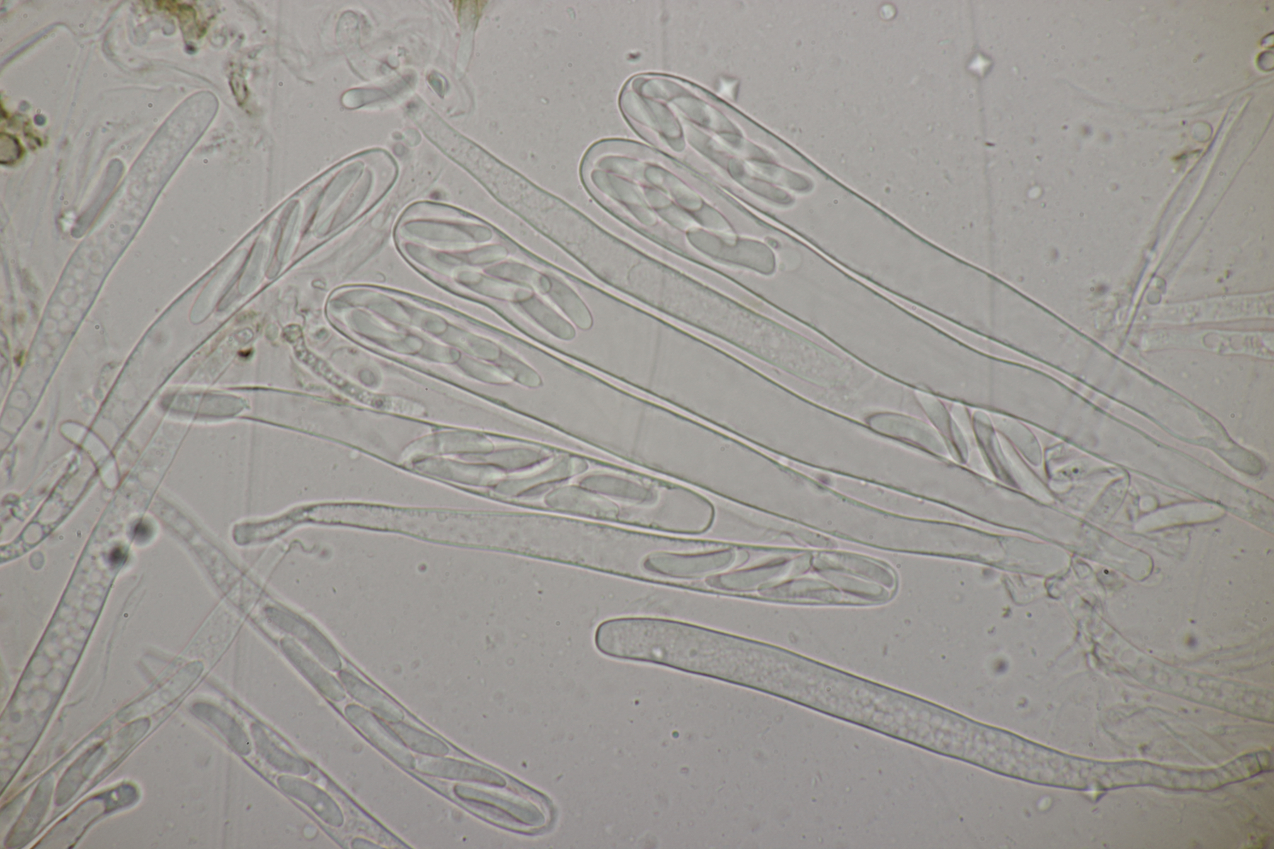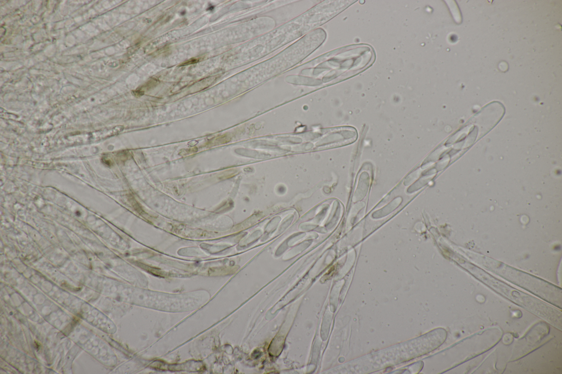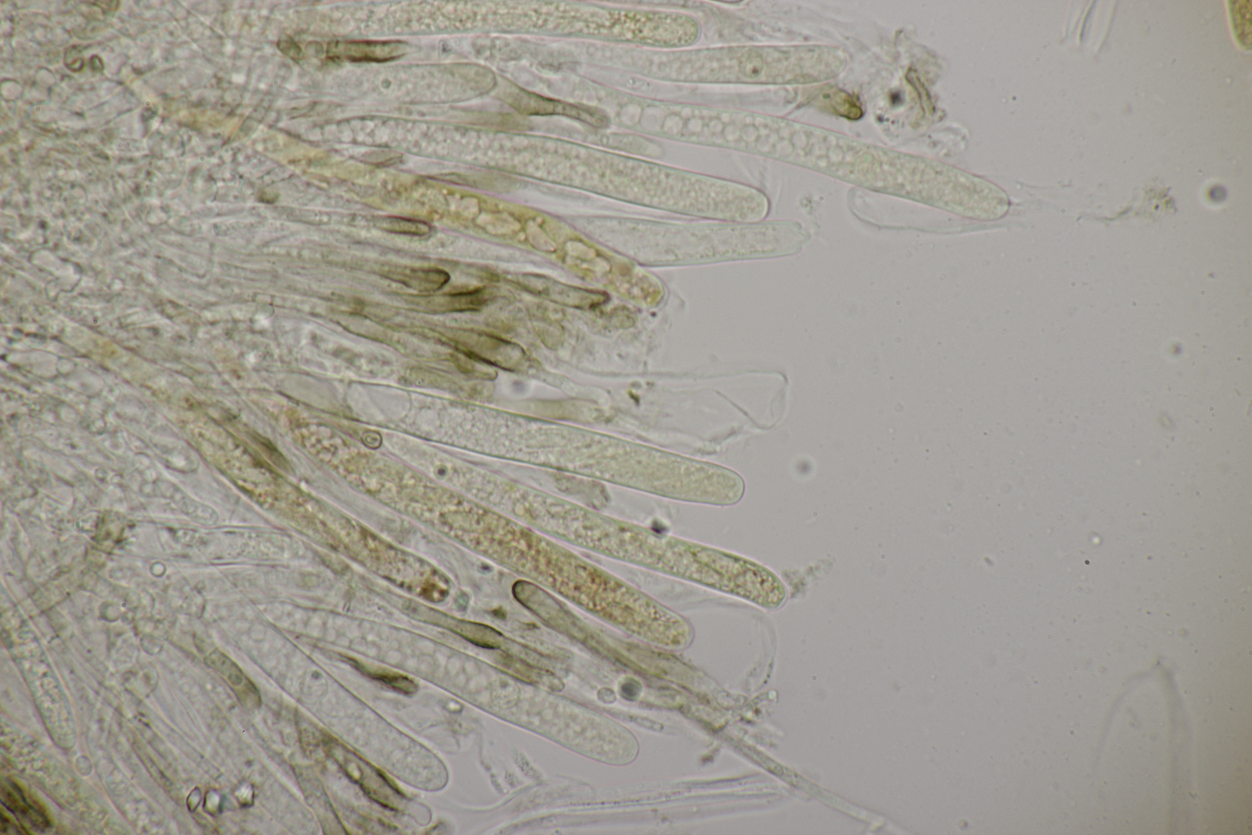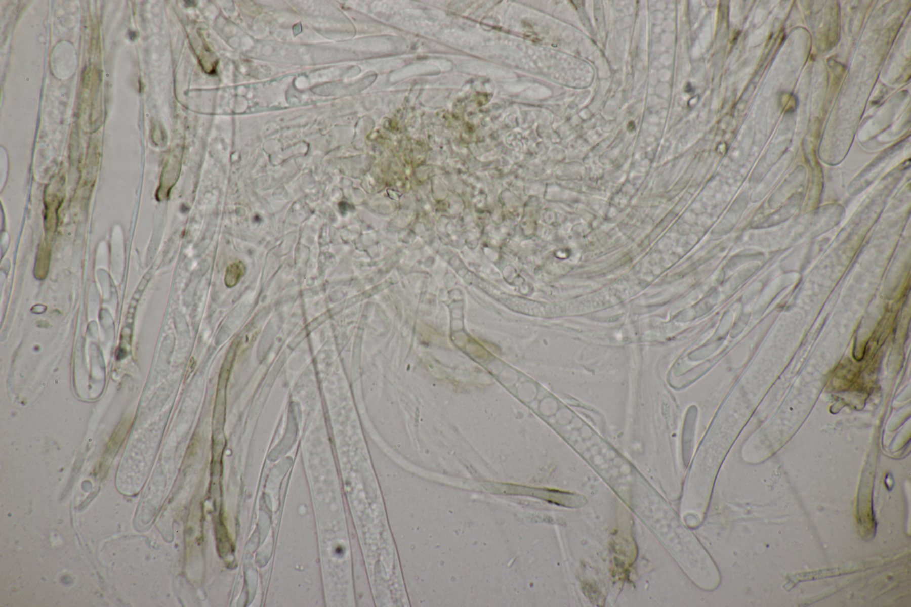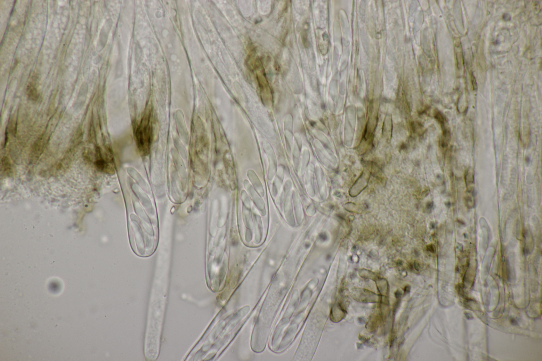 sieht sehr gut aus. Ja, ganz typisch für Phanerochaete sordida - es geht kreuz und quer ohne Vorzugsrichtung. Jetzt sieht man auch gut die teilweise Inkrustation der Cystiden. Typisch sind übrigens auch Doppelschnallen an den Basalhyphen und in den Rhizomorphen. Finde ich ganz witzig, denn Schnallen fehlen ja eigentlich, aber ganz unten am Substrat sind dann ab und zu einzelne zu sehen, dann aber gleich als Doppelschnallen (nur als Zusatzinfo, ist jetzt hier nicht bestimmungsrelevant).