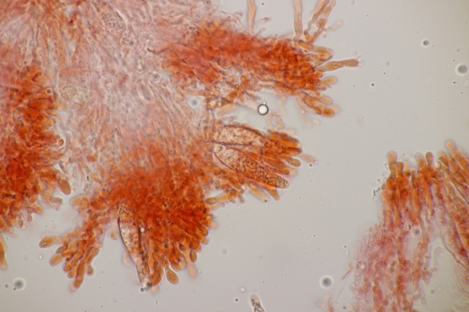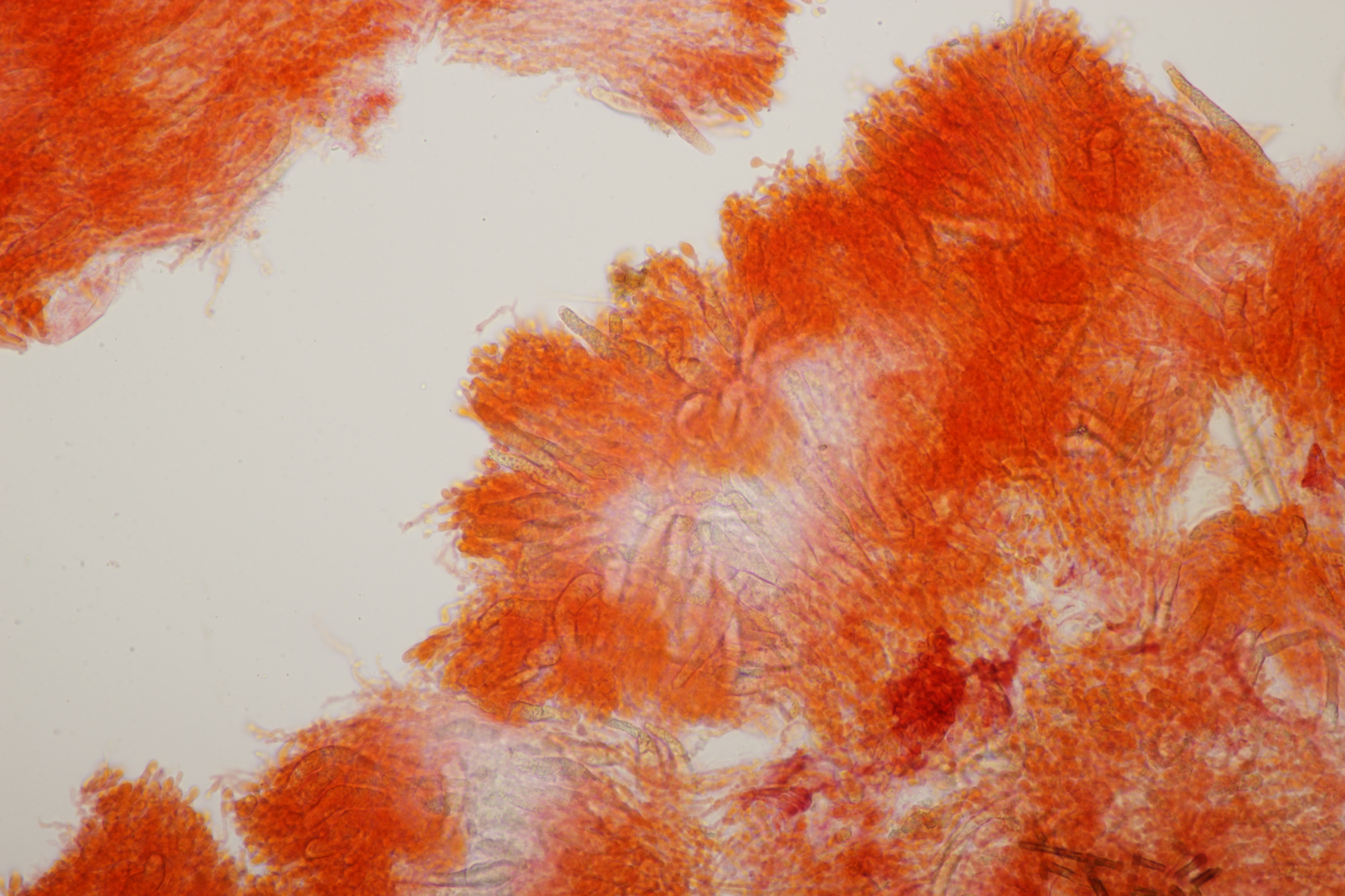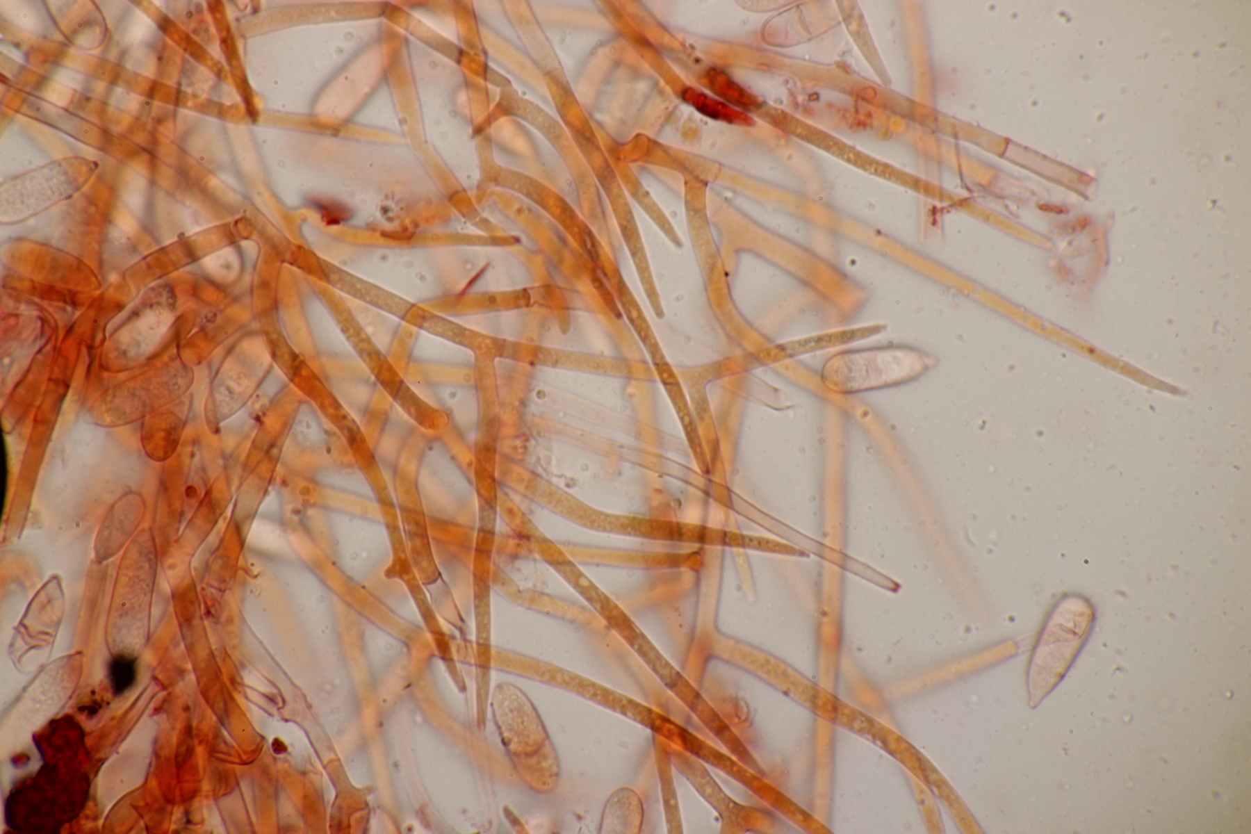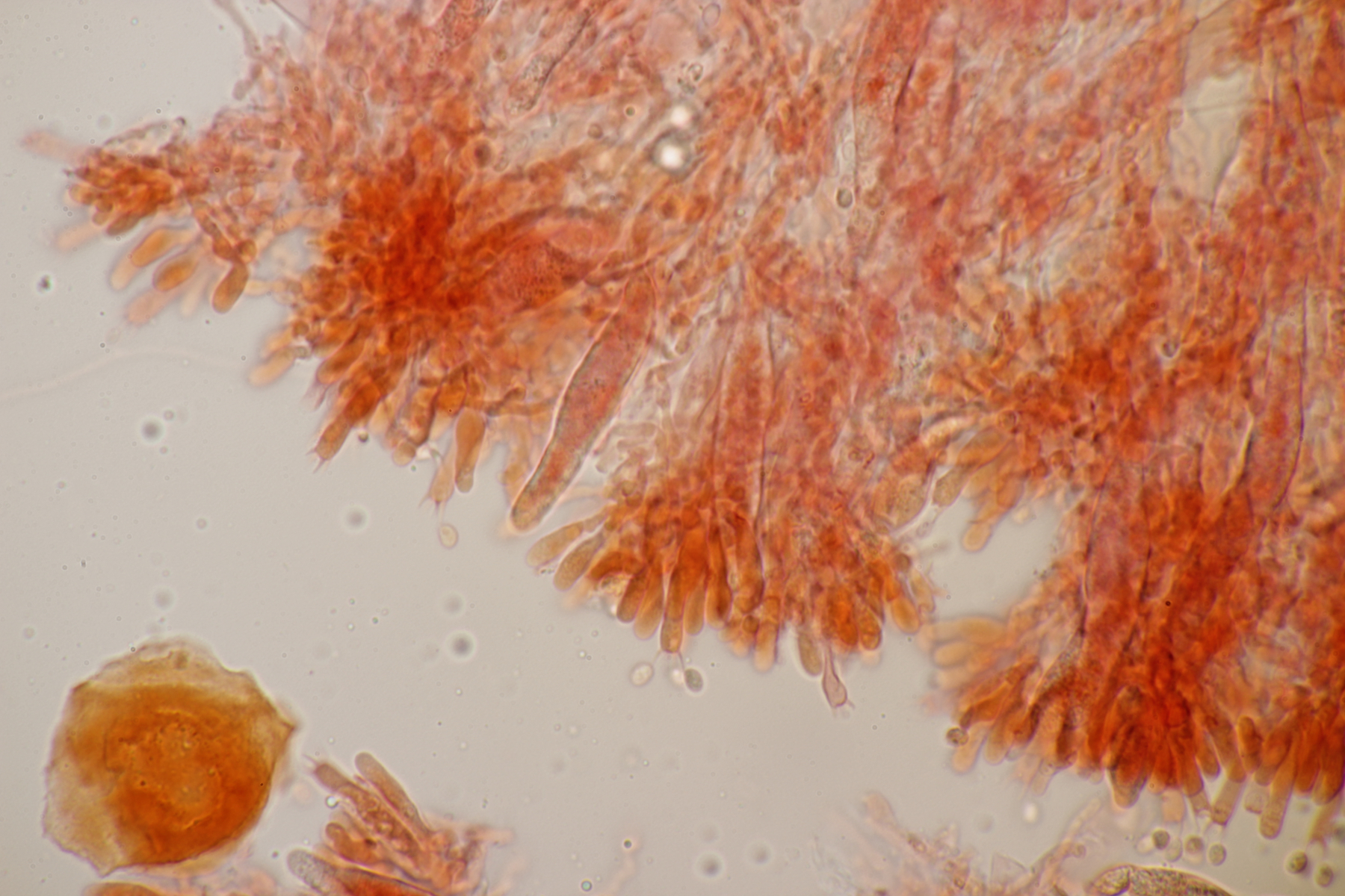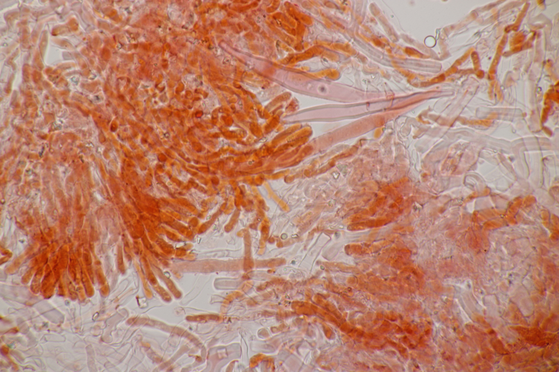 Dafür lohnt es sich, den fruchtkörper zu schneiden, um dei Verteilung der Gloeocystiden zu prüfen. Die Methode, mit ner Nadel etwas abzukratzen und dann zu quetschen, ist oft schneller, aber es lohnt sich m.E. immer, sich auch mal den genauen Aufbau und die Schichtung anzusehen. ;)