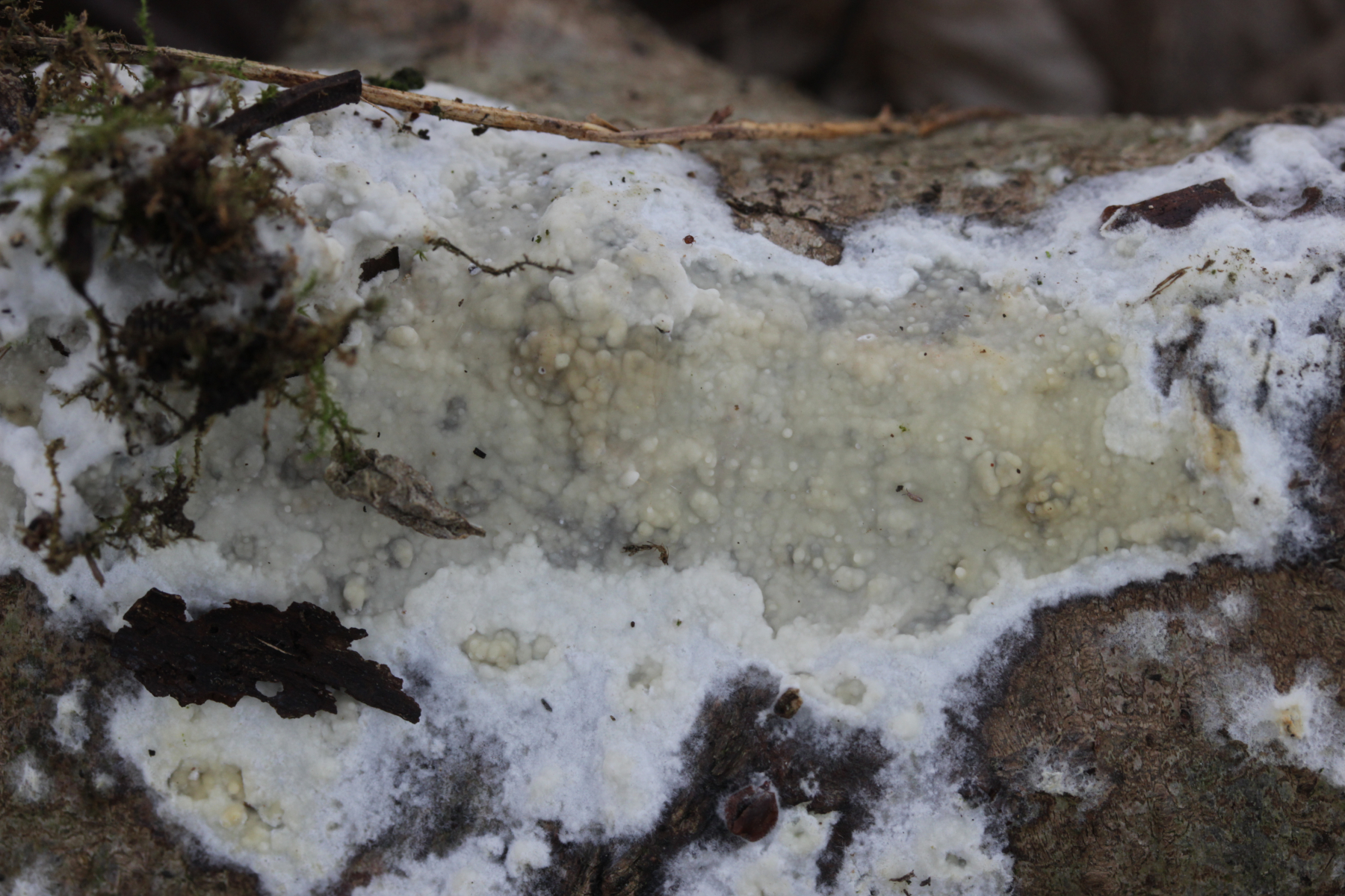 4. Die Sporen messen (5.6+-0.3) µm x (2.7+-0.2) µm, Q=2.1+-0.1, bzw. (4.9-6.2) µm x (2.5-3.2) µm, Q=1.8-2.4, Schnallen sind nicht vorhanden, die Zystiden sind dickwandig und mit Kristallschopf (wenn man nicht zu feste quetscht) und messen 65-95 µm. Mit KOH gab es keine makroskopische Farbreaktion. Substrat ist Laubholz. Ich tendiere zu einer Phanerochaete. Vllt. P. sordida?