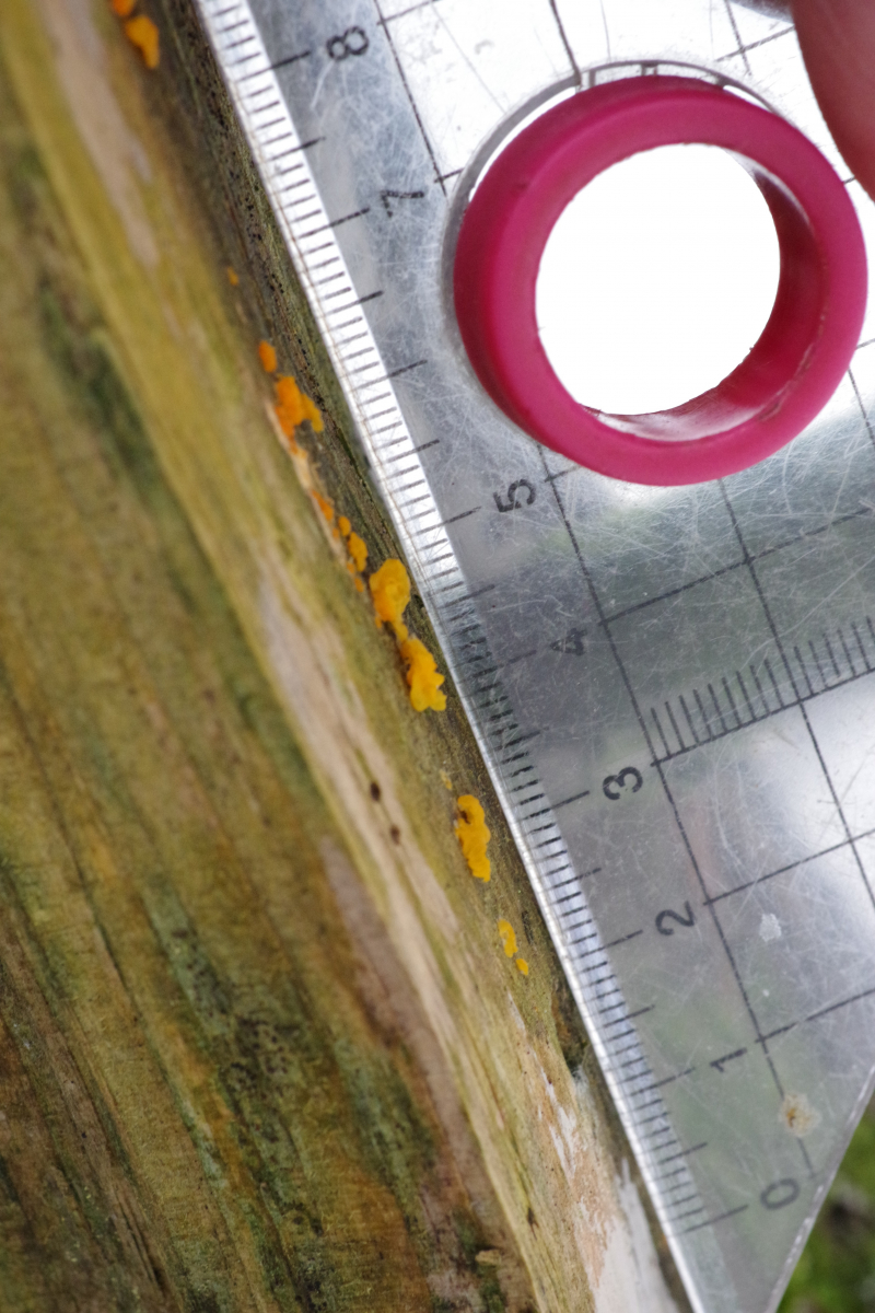 3) Am Fichtenstubben, Wirtspilze sind nicht zu sehen, also vielleicht Dacrymyces chrysospermus?