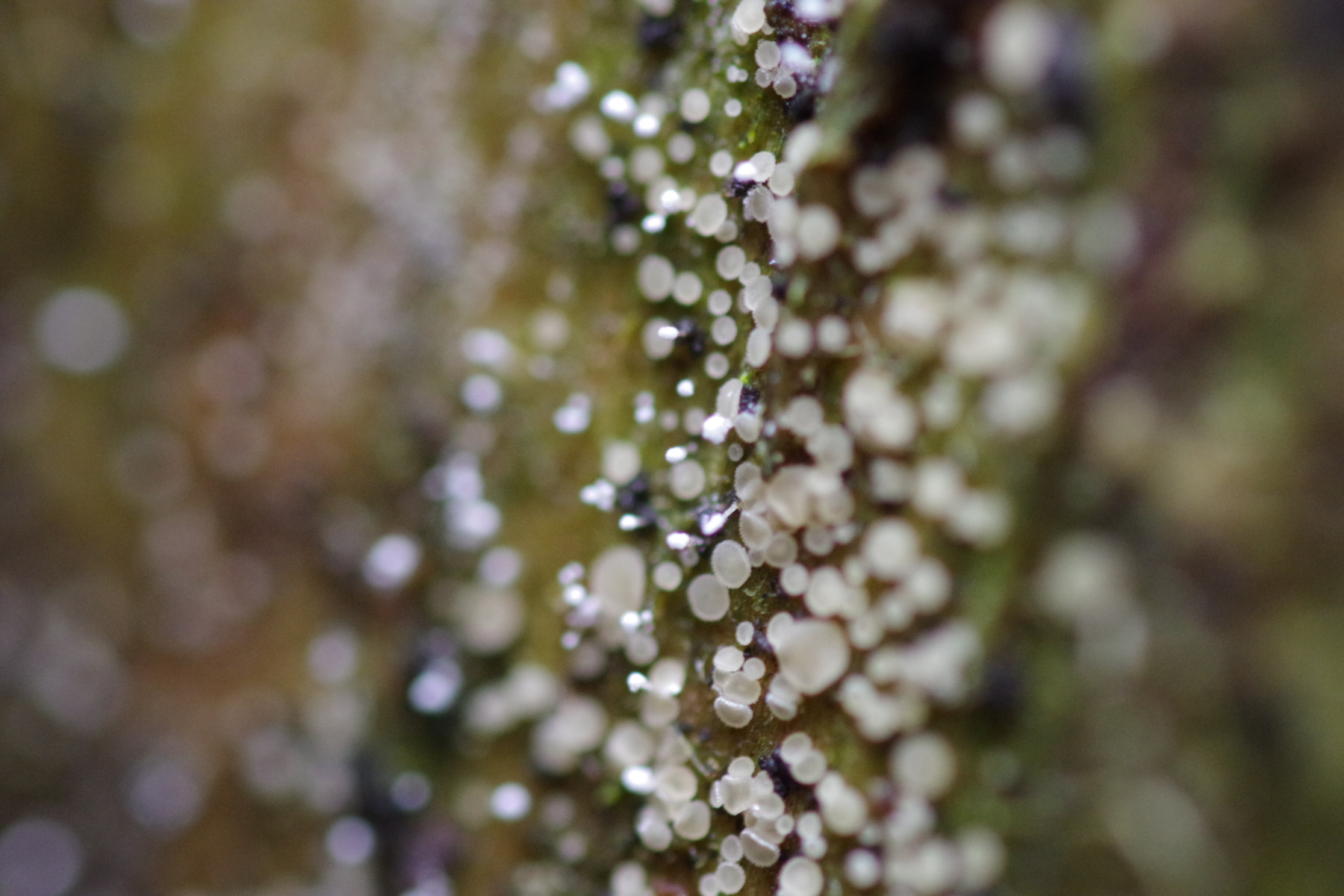 Zwischen den weißen Bechern, die bis zu 1/2 mm groß sind, gibt es auch noch weiße Schleimis, die auf dem Foto mehr zu erahnen als zu erkennen sind.