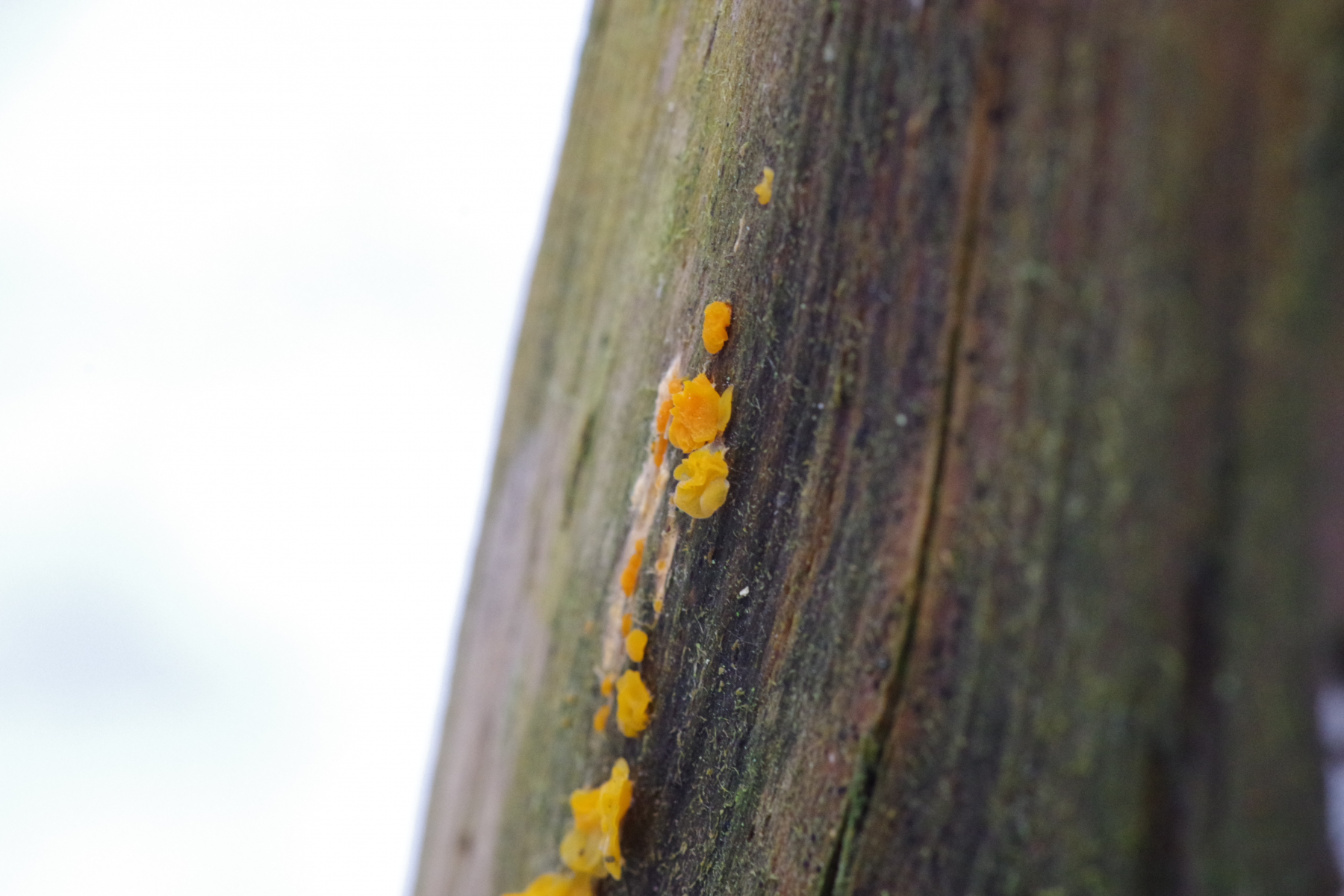 Pilz 3 sollte schon in die Gallerttränenverwandschaft gehören. Aber wohin, das könnte schwierig werden. D. chrysospermus ist das nicht, D. stillatus s.l. würde ich auch eher nicht vermuten. Optionen gibt es auch in den Nachbargattungen Ditiola, Guepiniopsis etc.