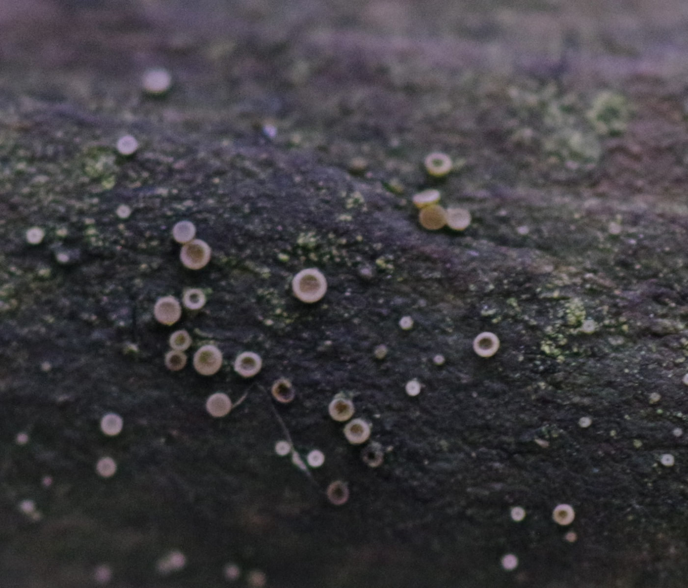 Zwischen den weißen Bechern, die bis zu 1/2 mm groß sind, gibt es auch noch weiße Schleimis, die auf dem Foto mehr zu erahnen als zu erkennen sind.