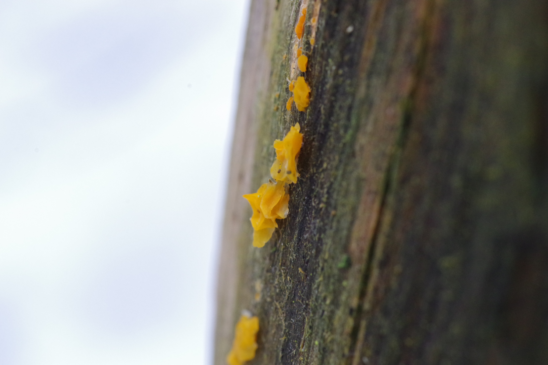 3) Am Fichtenstubben, Wirtspilze sind nicht zu sehen, also vielleicht Dacrymyces chrysospermus?