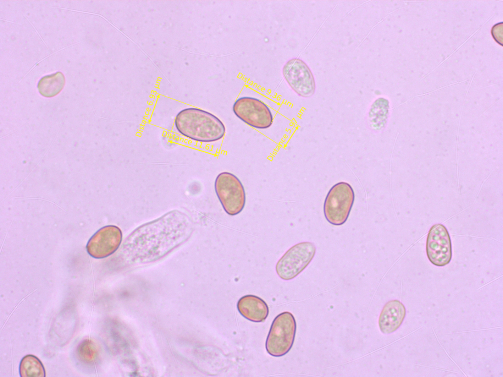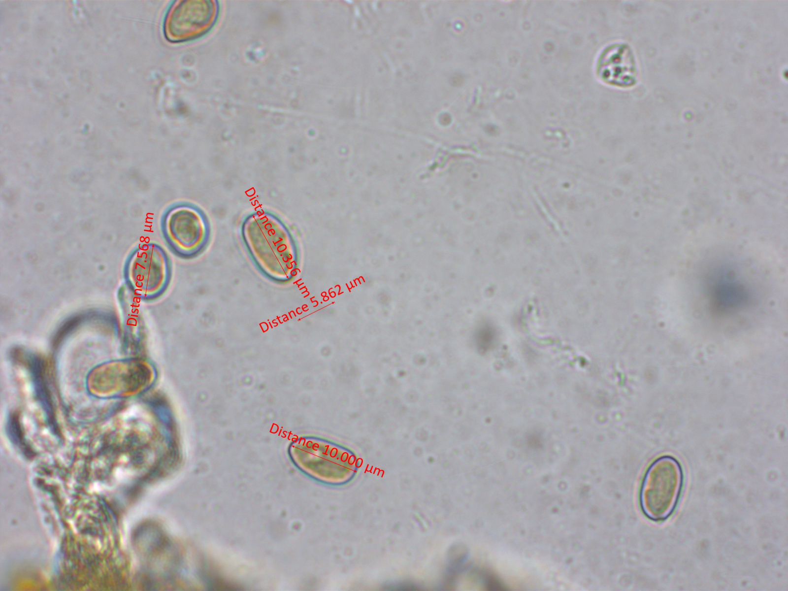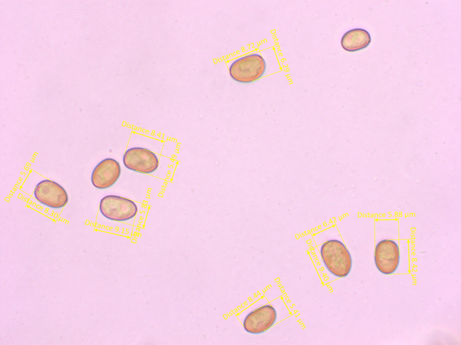 Bei meinen Funden: 8.3-9.6 x 5.2-6.4 µm. Mittelwert: 8.9 x 5.8 µm. Q = 1.39-1.67, QAvg = 1.53